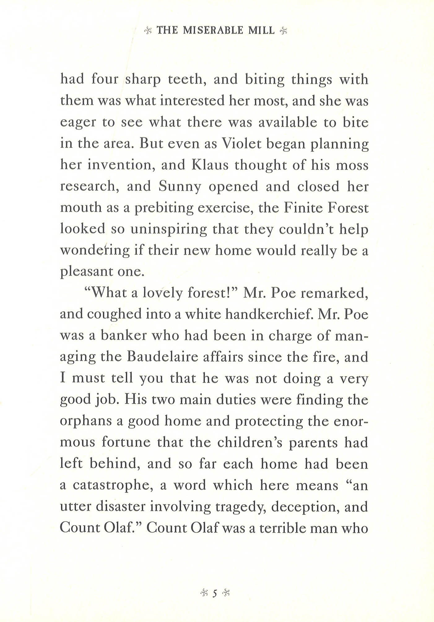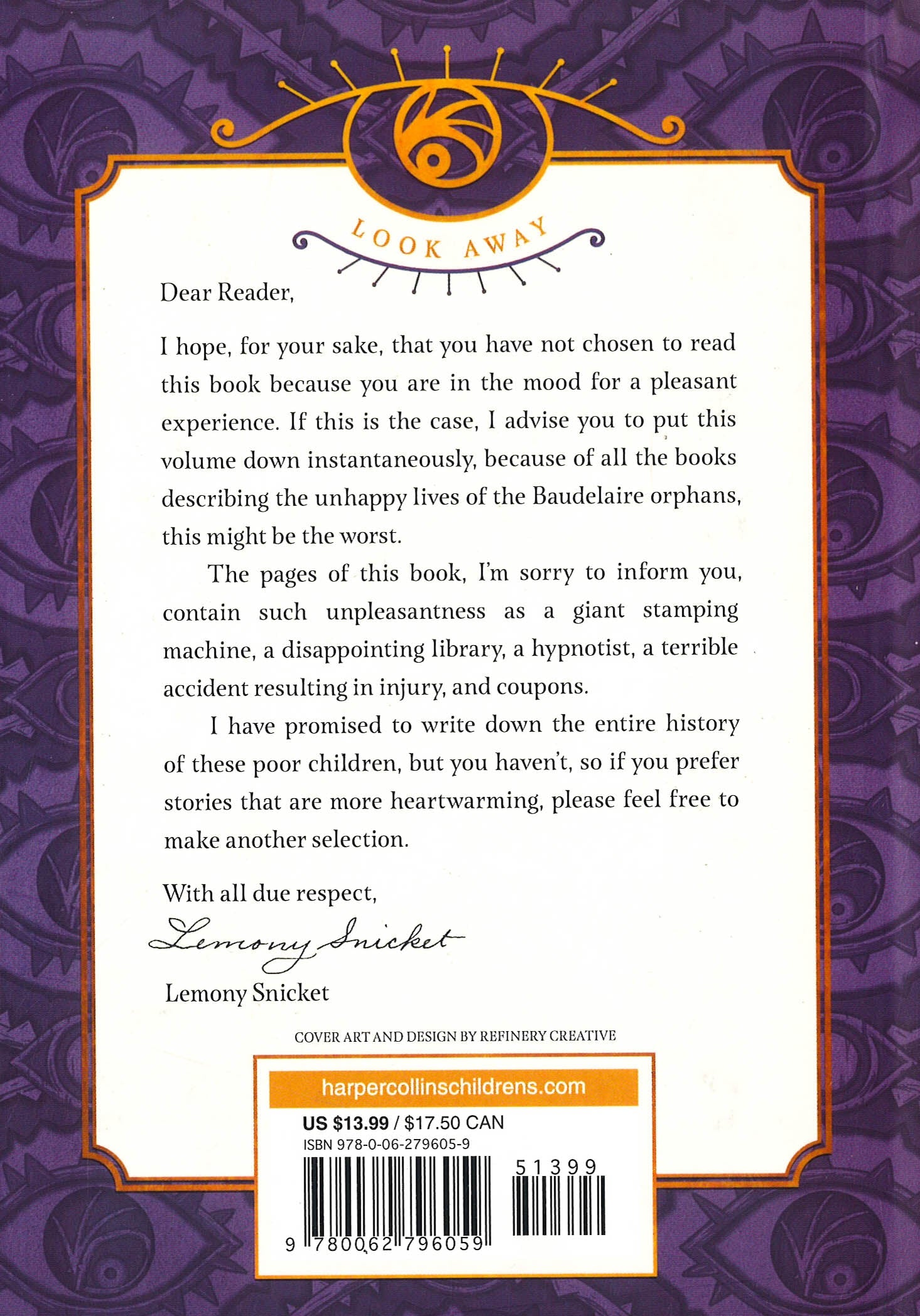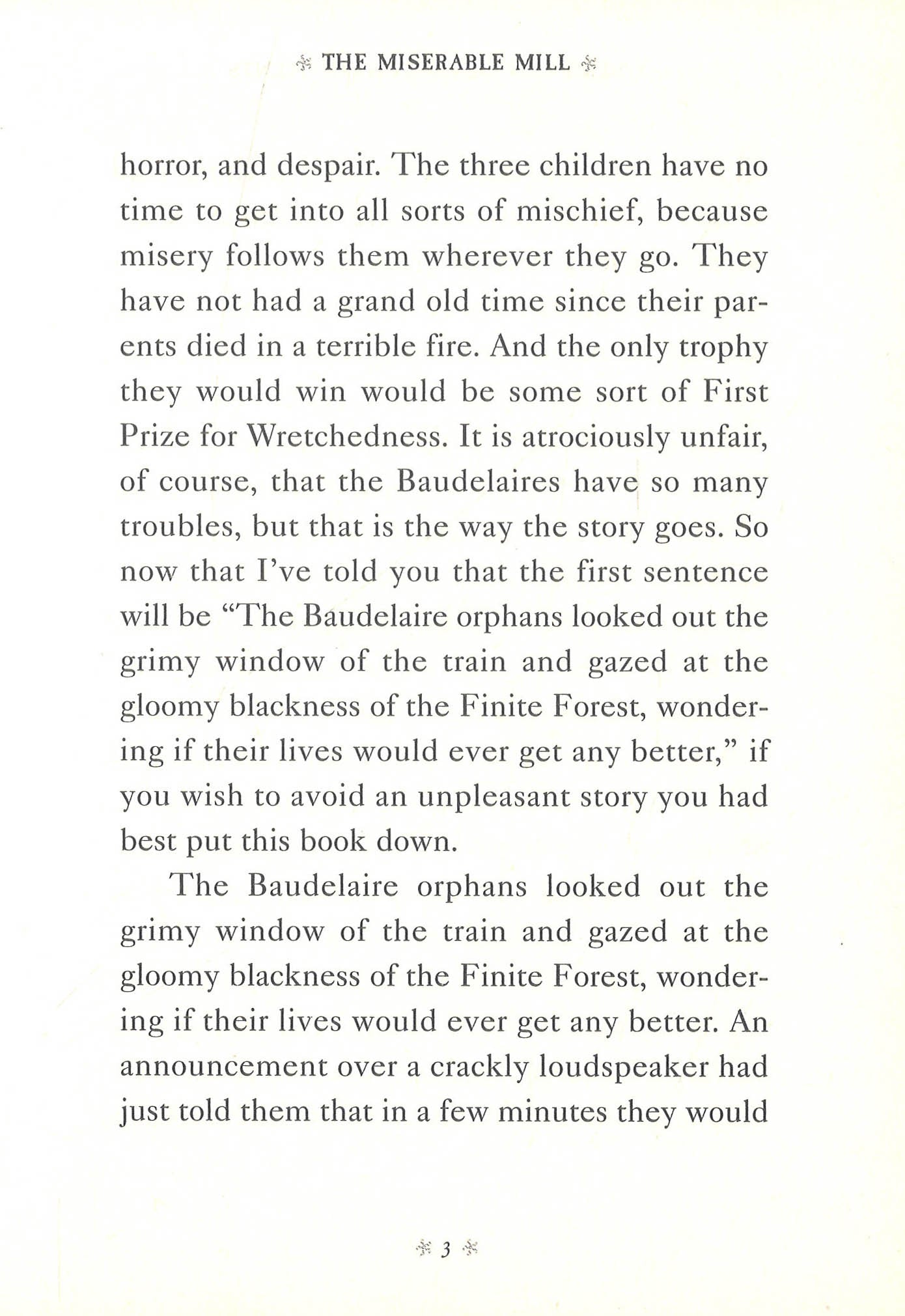 NOW A NETFLIX ORIGINAL SERIESI hope, for your sake, that you have not chosen to read this book because you are in the mood for a pleasant experience. If this is the case, I advise you to put this book down instantaneously, because of all the books describing the unhappy lives of the Baudelaire orphans, The Miserable Mill might be the unhappiest yet.Violet, Klaus, and Sunny Baudelaire are sent to Paltryville to work in a lumber mill, and they find disaster and misfortune lurking behind every log. The pages of this book, I'm sorry to inform you, contain such unpleasantries as a giant pincher machine, a bad casserole, a man with a cloud of smoke where his head should be, a hypnotist, a terrible accident resulting in injury, and coupons. I have promised to write down the entire history of these three poor children, but you haven't, so if you prefer stories that are more heartwarming, please feel free to make another selection.With all due respect, Lemony Snicket Lemony Snicket is often despondent, mostly about his published research, which includes A Series of Unfortunate Events and The Composer Is Dead. Due to the world-wide web of conspiracy which surrounds him, Mr. Snicket often communicates with the general public through his representative, Daniel Handler. Mr. Handler has had a relatively uneventful life, and is the author of three books for adults, The Basic Eight, Watch Your Mouth, and Adverbs, none of which are anywhere near as dreadful as Mr. Snicket's. Brett Helquist's celebrated art has graced books from the charming Bedtime for Bear, which he also wrote, to the New York Times-bestselling A Series of Unfortunate Events by Lemony Snicket to the glorious picture book adaptation of Charles Dickens's A Christmas Carol. He lives with his family in Brooklyn, New York.