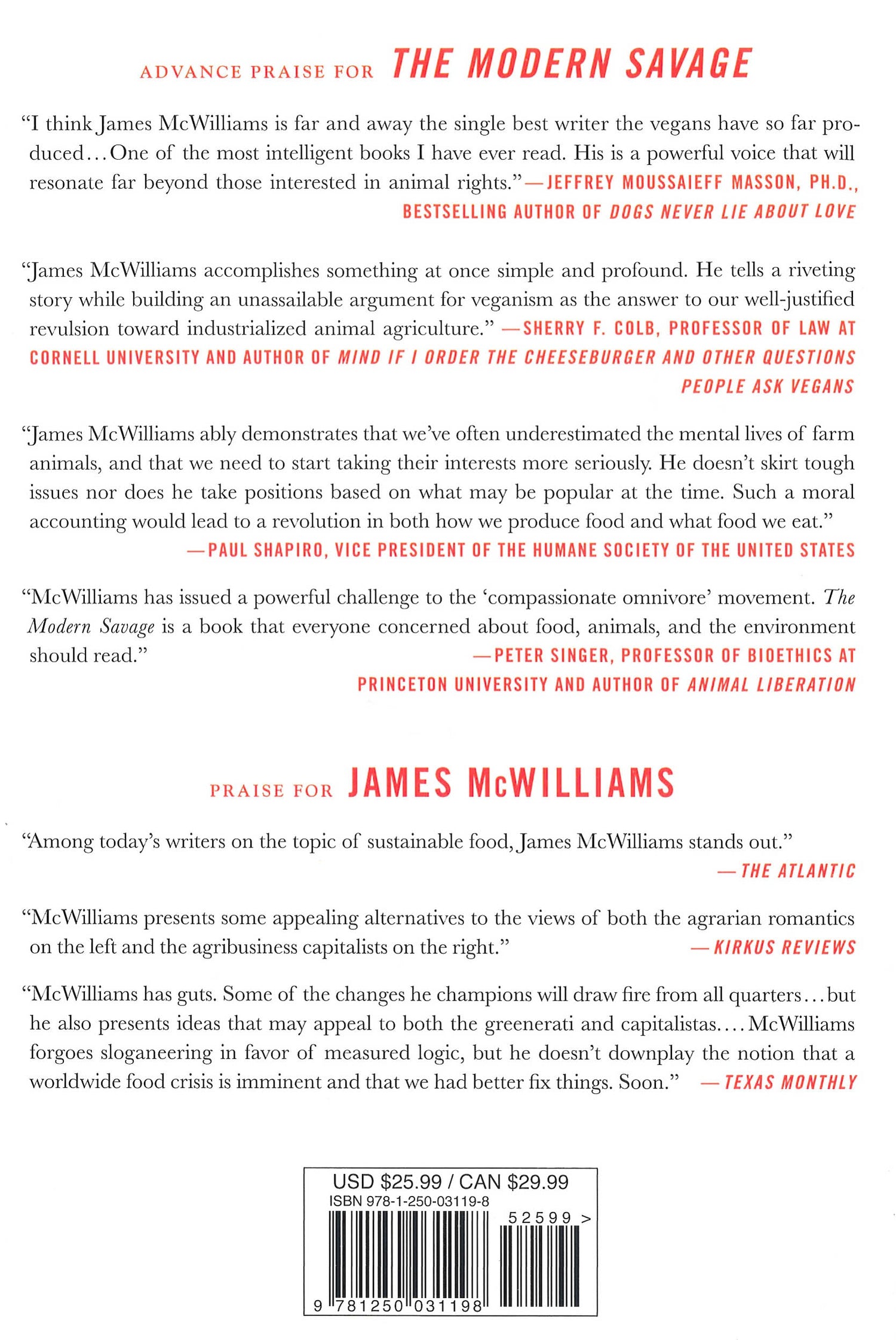 In The Modern Savage, renowned writer, historian, and animal advocate James McWilliams pushes back against the questionable moral standards of a largely omnivorous world and explores the "alternative to the alternative"-not eating domesticated animals at all. In poignant, powerful, and persuasive prose, McWilliams reveals the scope of the cruelty that takes place even on the smallest and-supposedly-most humane animal farms. In a world increasingly aware of animals' intelligence and the range of their emotions, McWilliams advocates for the only truly moral, sustainable choice-a diet without meat, dairy, or other animal products.