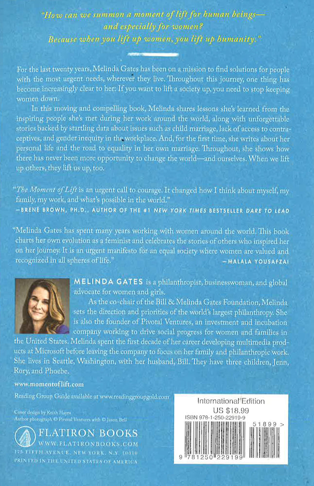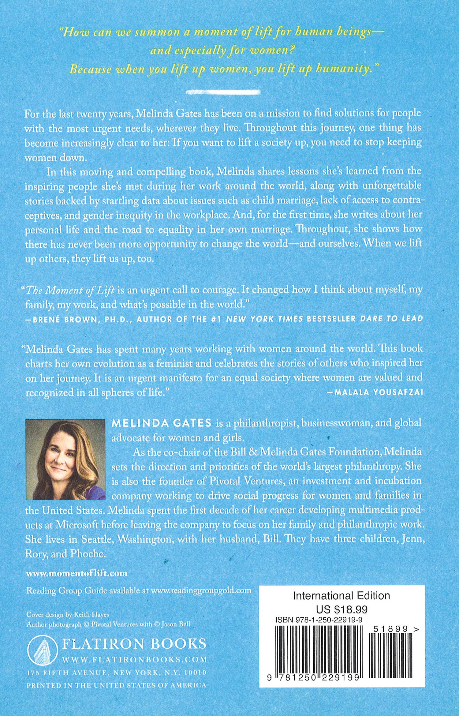 NEW YORK TIMES BESTSELLER"In her book, Melinda tells the stories of the inspiring people she's met through her work all over the world, digs into the data, and powerfully illustrates issues that need our attention-from child marriage to gender inequity in the workplace." - President Barack Obama"The Moment of Lift is an urgent call to courage. It changed how I think about myself, my family, my work, and what's possible in the world. Melinda weaves together vulnerable, brave storytelling and compelling data to make this one of those rare books that you carry in your heart and mind long after the last page."- Bren?? Brown, Ph.D., author of the New York Times #1 bestseller Dare to"Melinda Gates has spent many years working with women around the world. This book is an urgent manifesto for an equal society where women are valued and recognized in all spheres of life. Most of all, it is a call for unity, inclusion and connection. We need this message more than ever." - Malala Yousafzai"Melinda Gates's book is a lesson in listening. A powerful, poignant, and ultimately humble call to arms." - Tara Westover, author of the New York Times #1 bestseller EducatedA debut from Melinda Gates, a timely and necessary call to action for women's empowerment."How can we summon a moment of lift for human beings - and especially for women? Because when you lift up women, you lift up humanity."For the last twenty years, Melinda Gates has been on a mission to find solutions for people with the most urgent needs, wherever they live. Throughout this journey, one thing has become increasingly clear to her: If you want to lift a society up, you need to stop keeping women down.In this moving and compelling book, Melinda shares lessons she's learned from the inspiring people she's met during her work and travels around the world. As she writes in the introduction, "That is why I had to write this book-to share the stories of people who have given focus and urgency to my life. I want all of us to see ways we can lift women up where we live."Melinda's unforgettable narrative is backed by startling data as she presents the issues that most need our attention-from child marriage to lack of access to contraceptives to gender inequity in the workplace. And, for the first time, she writes about her personal life and the road to equality in her own marriage. Throughout, she shows how there has never been more opportunity to change the world-and ourselves.Writing with emotion, candor, and grace, she introduces us to remarkable women and shows the power of connecting with one another.When we lift others up, they lift us up, too.