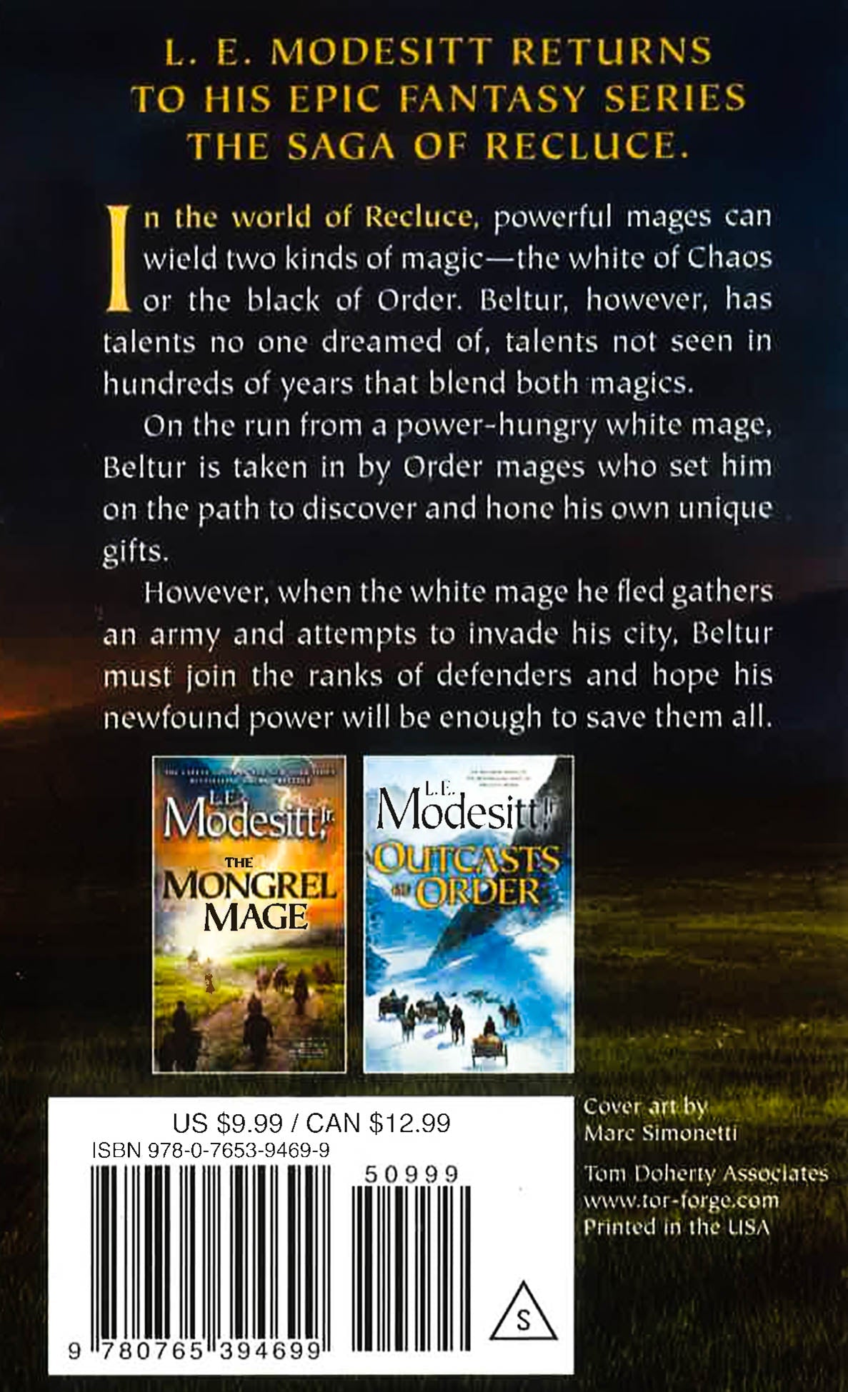 In the world of Recluce, powerful mages can wield two kinds of magic--the white of Chaos or the black of Order. Beltur, however, has talents no one dreamed of, talents not seen in hundreds of years that blend both magics.