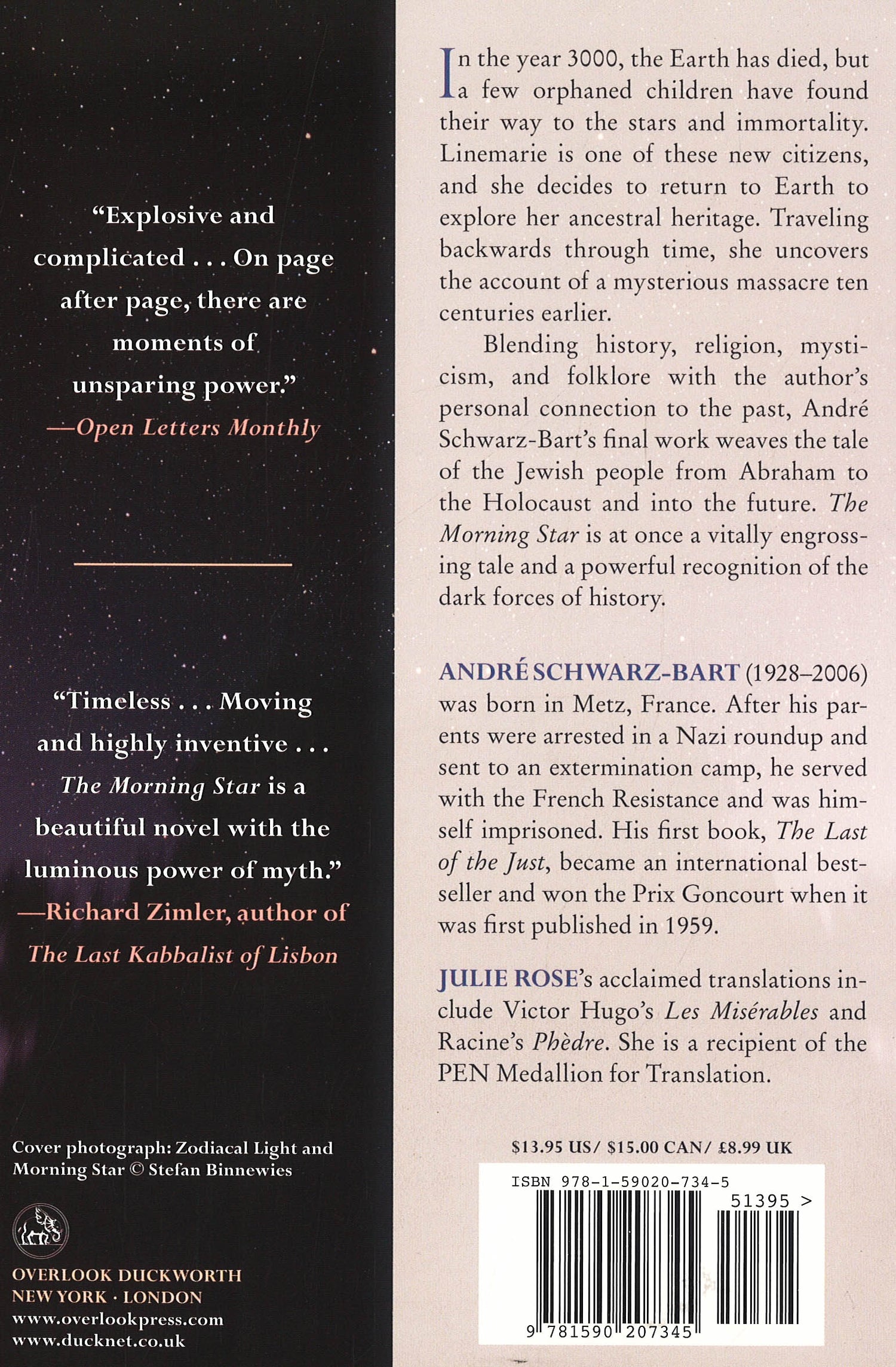 Rescued from his papers by his widow, Simone four years after Scwarz-Bart's death, The Morning Staris the last word of a writer with a masterful and poignant sense of the past, present, and future. The story begins in the year 3000, in the aftermath of a nuclear war that has decimated our world. The Earth has died but a few orphaned children who have escaped the cataclysm find their way to the stars and immortality. The woman Linemarie belongs to the first generation of these transcendent citizens of the future, and she returns to Earth to study and explore her ancestral heritage. Blending history, religion, mysticism, and folklore with the author's personal connection to the past, in particular to the Holocaust, The Morning Star is both a vitally engrossing tale and a powerful recognition of the dark forces of history.