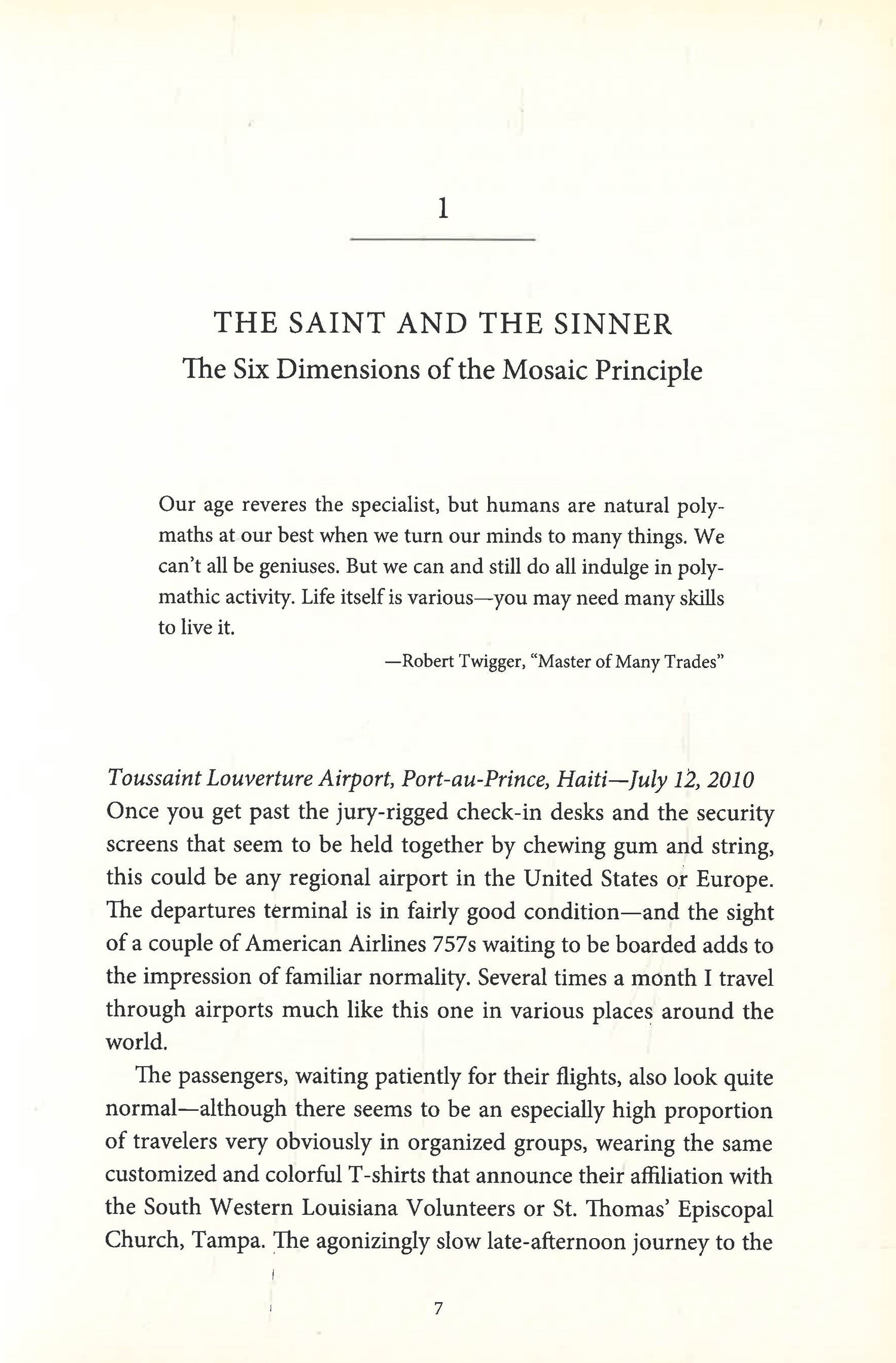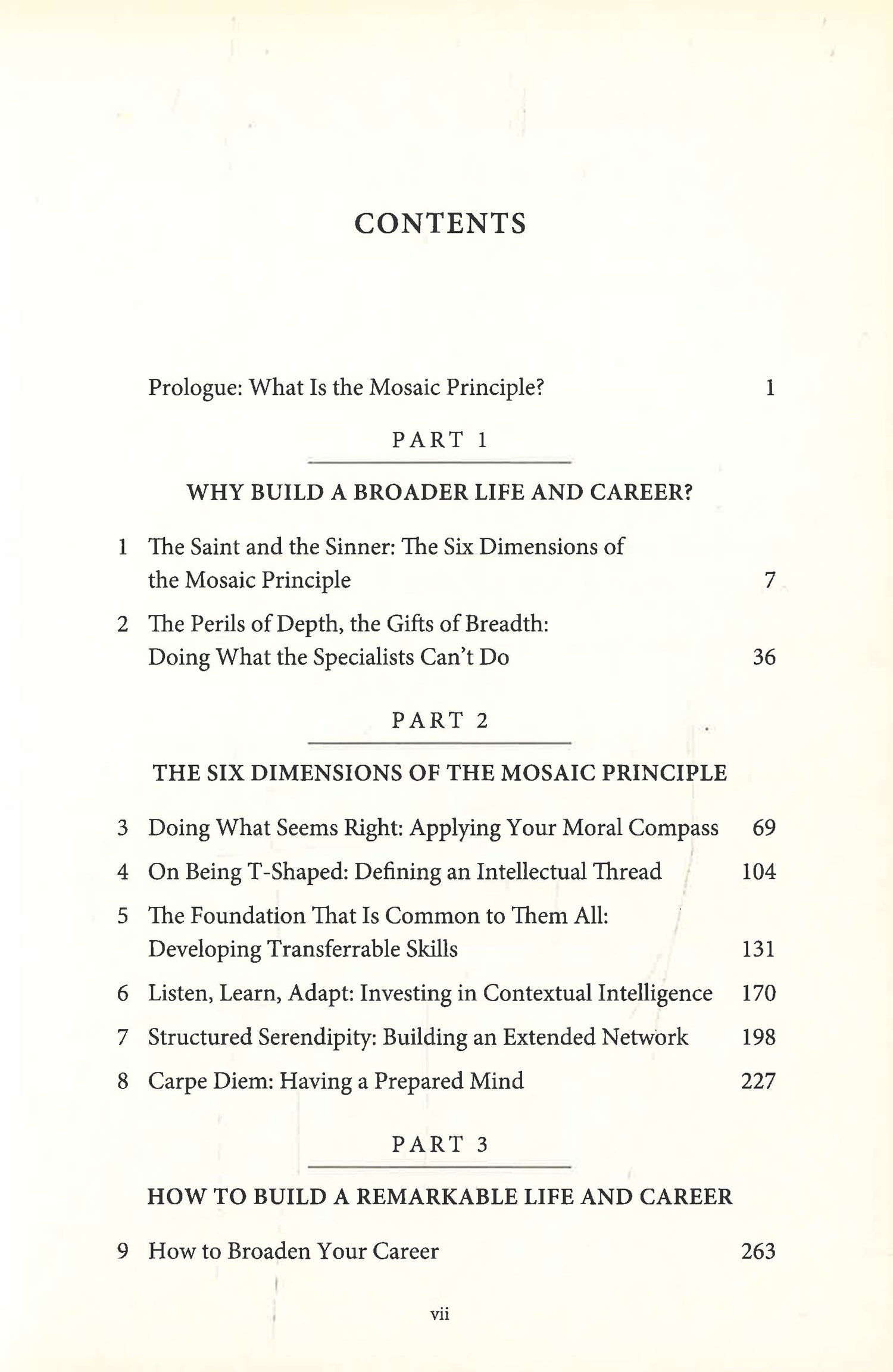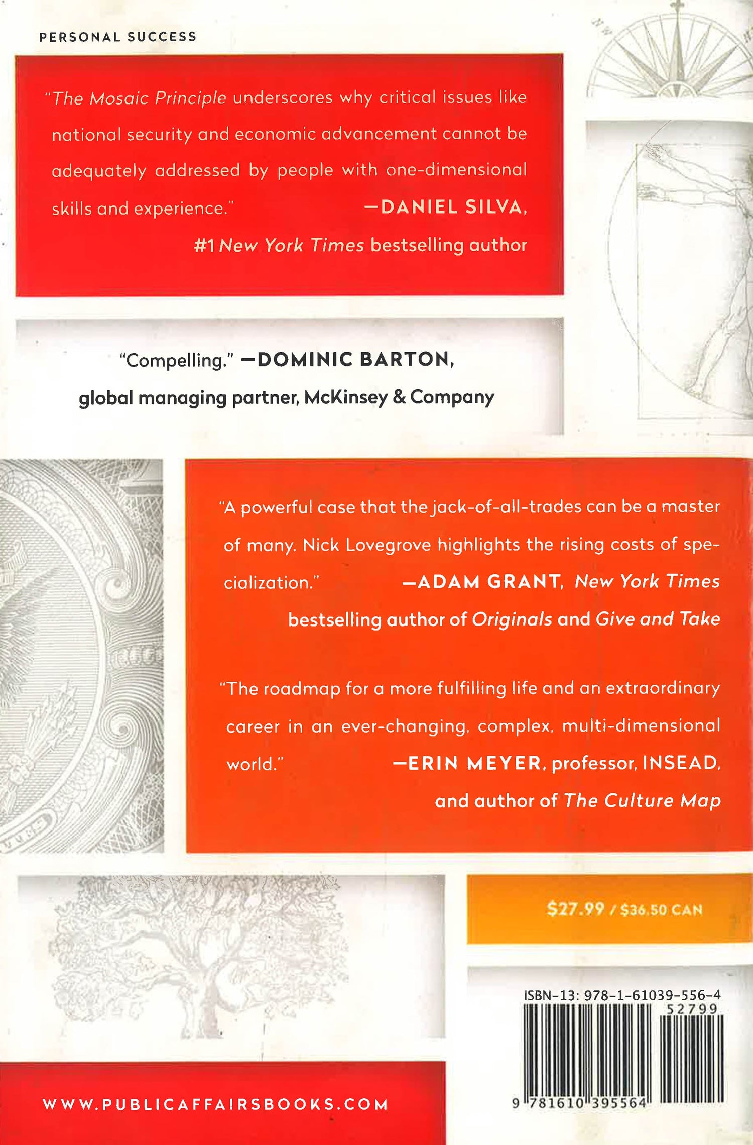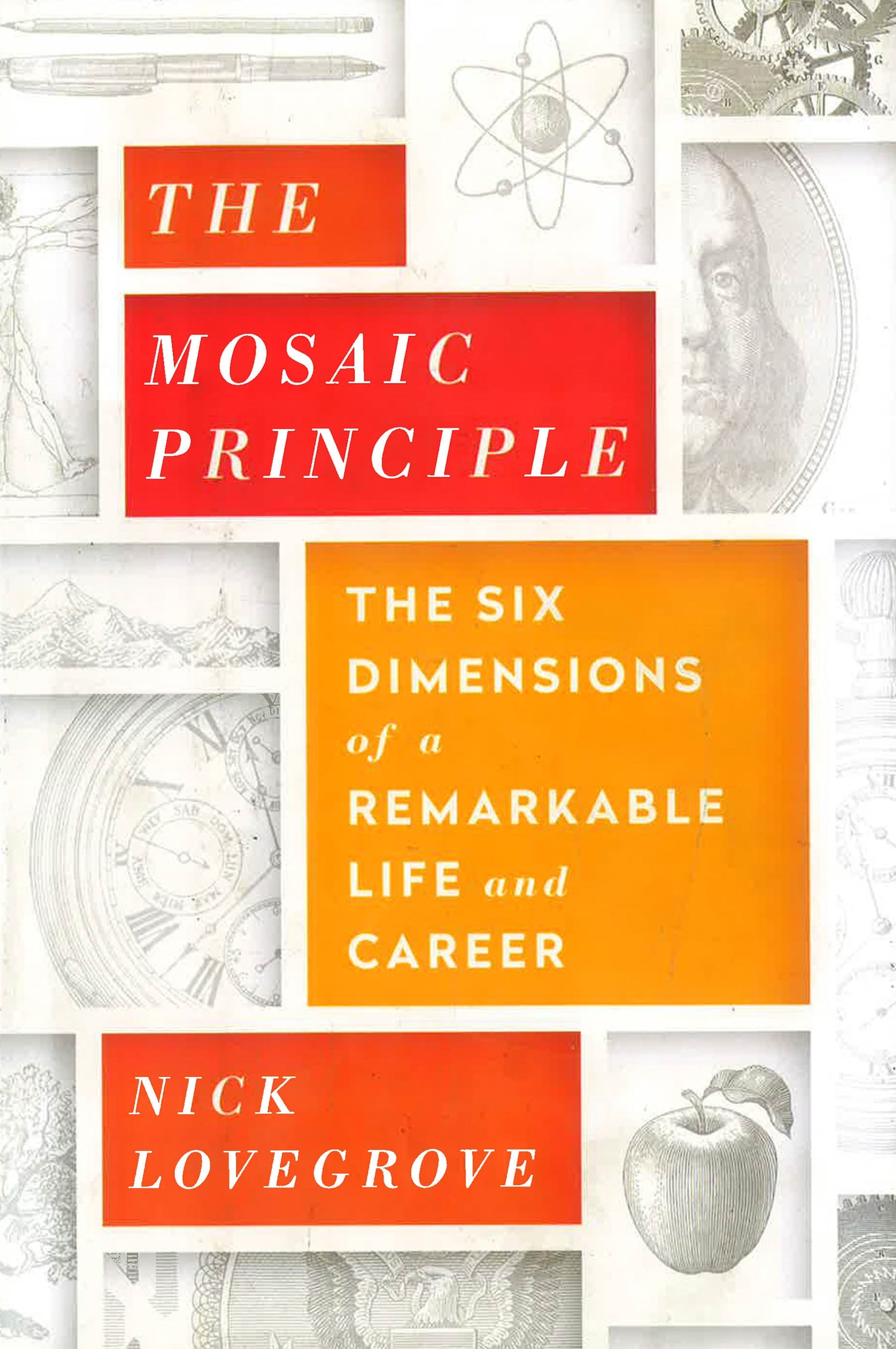 Life,personally and professionally,is lived to the fullest as a mosaic, encompassing a rich and complex set of diverse experiences that provide purpose, meaning, happiness, and success.Yet, the pressures of modern society push us toward narrower focus and deeper specialization in our lives and careers. Our pursuit of specific expertise risks us becoming isolated from those different from us our lack of shared experience fosters suspicion and conflict. Today we have businesspeople and government officials who persistently distrust and demonize each other a fortunate swath of society with professional and financial security, increasingly isolated from those left behind and community leaders who struggle to relate to and connect with the communities they serve. In every walk of life we have allowed ourselves to be pushed into self-defining cocoons from which it is difficult to break out.Nick Lovegrove's compelling vision provides the way out of this contemporary trap. He supplies vivid portraits of those who get it right (such as Paul Farmer, the physician whose broad and imaginative choices bring health and hope to the world's poorest people) and those who get it deeply wrong (such as Jeffrey Skilling, the former CEO of Enron) and connects their experiences with a blueprint of six skills, a moral compass, transferrable skills, contextual intelligence, prepared mind, intellectual thread, and extended network. The Mosaic Principle will help you to succeed in an ever-changing, more complex, and diverse world, and build a more remarkable and fulfilling life.