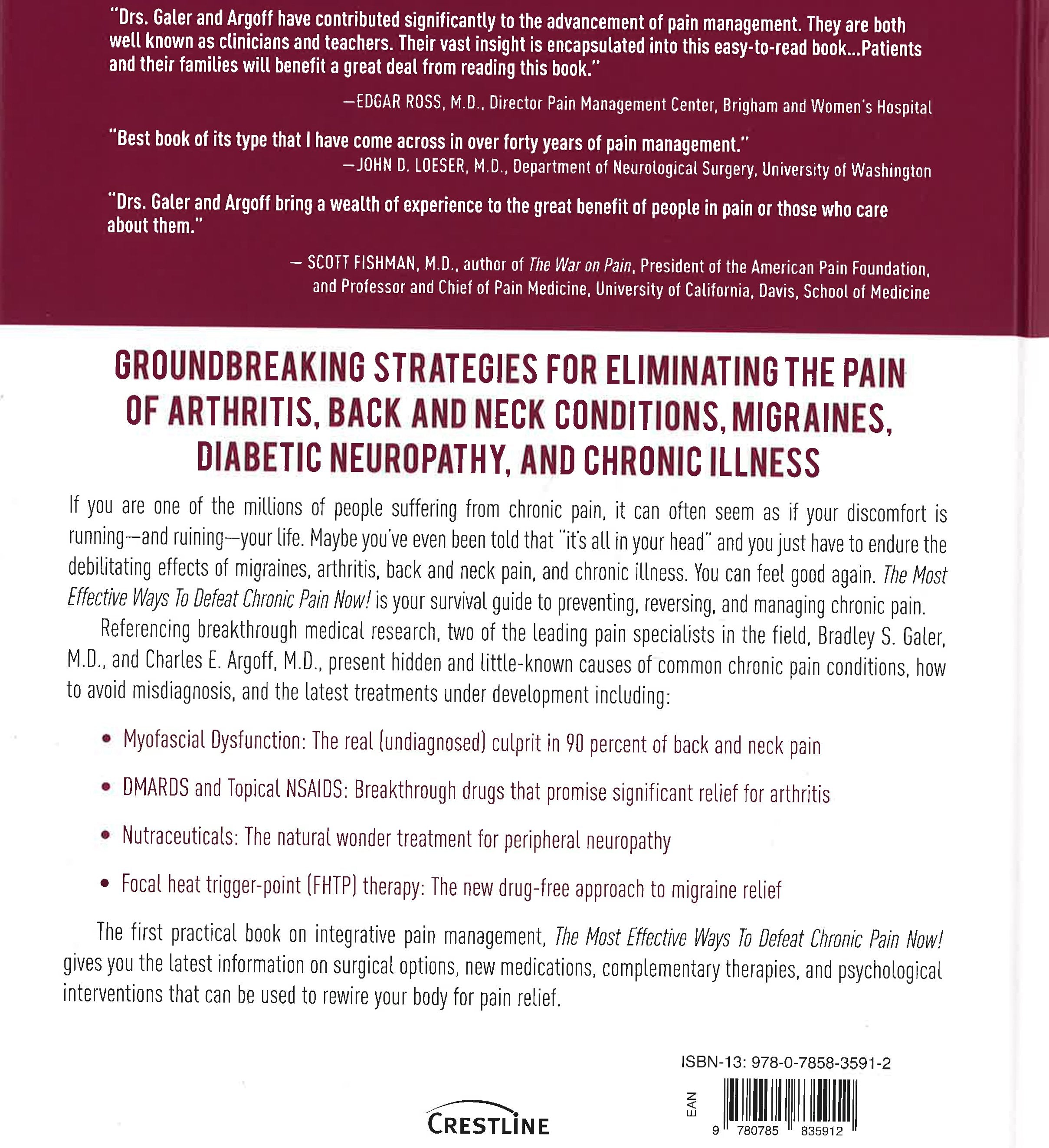 If you are one of the millions of people suffering from chronic pain, it can often seem as if your discomfort is running--and ruining--your life. Maybe you've even been told that "it's all in your head" and you just have to endure the debilitating effects of migraines, arthritis, back and neck pain, and chronic illness. You can feel good again! The Most Effective Ways to Defeat Chronic Pain Now! is your survival guide to preventing, reversing, and managing chronic pain. Referencing breakthrough medical research, two of the leading pain specialists in the field, Bradley S. Galer, M.D., and Charles E. Argoff, M.D., present hidden and little known causes of common chronic pain conditions, how to avoid misdiagnosis, and the latest treatments under development including: --Myofascial Dysfunction: The real (undiagnosed!) culprit in 90% of Back and Neck Pain --DMARDS and NSAIDS: Two breakthrough drugs that promise significant relief for Arthritis --Nutraceuticals: The natural wonder treatment for Peripheral Neuropathy --Focal heat trigger-point (FHTP) therapy: The new drug-free approach to Migraine relief The first practical book on integrative pain management, The Most Effective Ways to Defeat Chronic Pain Now! gives you the latest information on surgical options, new medications, complementary therapies, and psychological interventions that can be used to rewire your body for pain relief. For each condition and procedure, you'll learn what to expect in the hospital and the doctor's office, and what self-therapy solutions you can do on your own. Detailed illustrations and easy-to-understand descriptions help you select the best treatment options to improve your unique type of pain and take back your life.