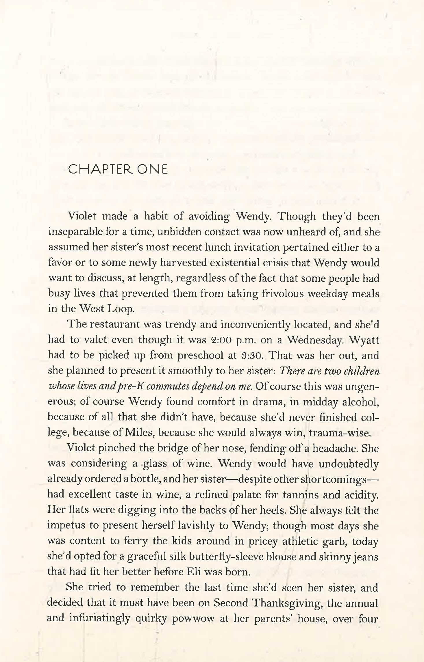 WENDY, their eldest, a cause for concern, soothes herself with drink after being widowed young, while VIOLET, lawyer-turned-stay-at-home-mother, is disturbed by the reappearance of a son placed for adoption fifteen years earlier.