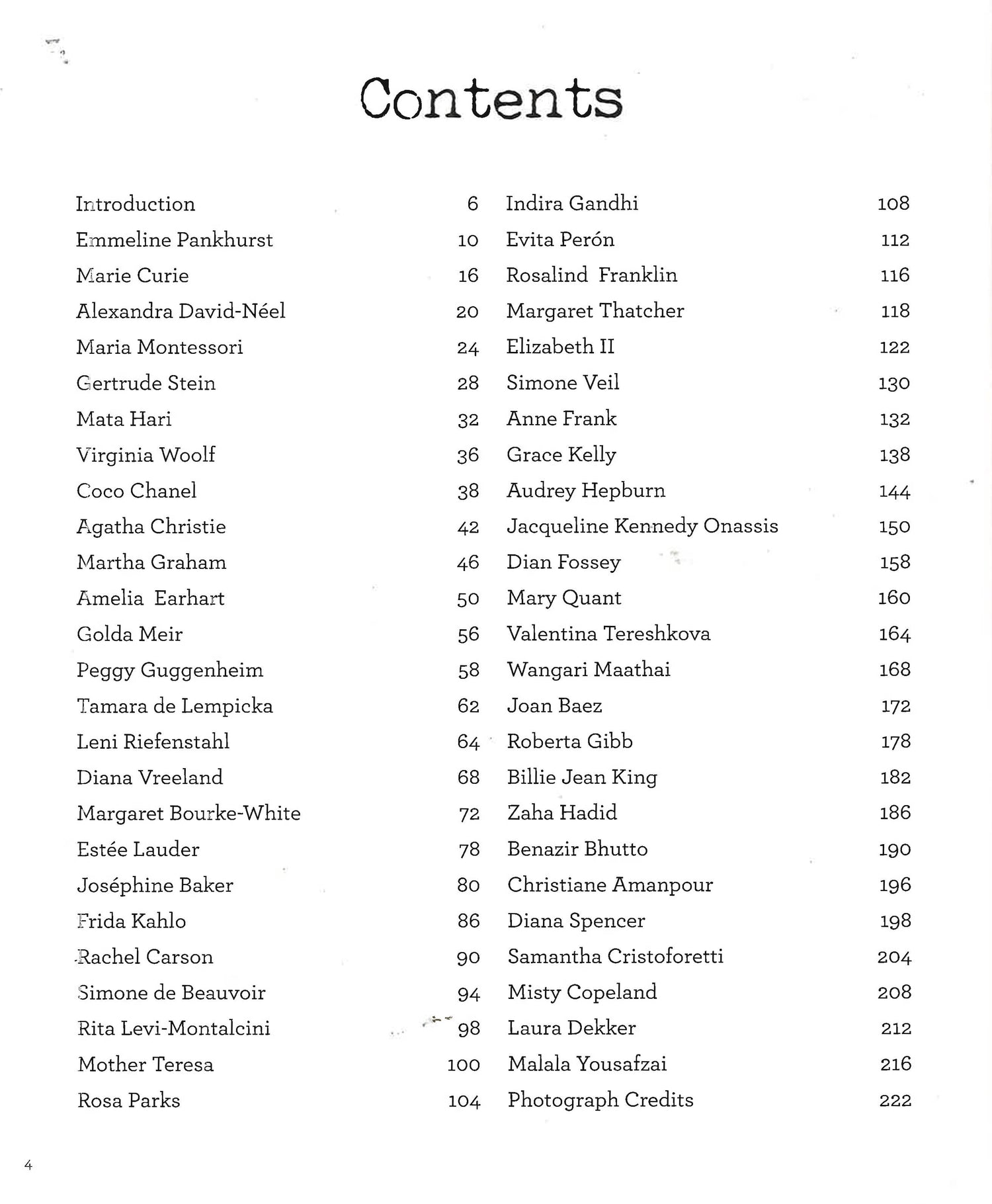 This book relates the extraordinary life of fifty women who overcame centuries of prejudice and rewrote the rules of society, making their way with disruptive force, and integrating themselves with grace and pride, into a world that had been the prerogative of men. And these iconic women and the example they set paved the way for the many others who followed, passing on the fruit of their knowledge, experience and imagination.
