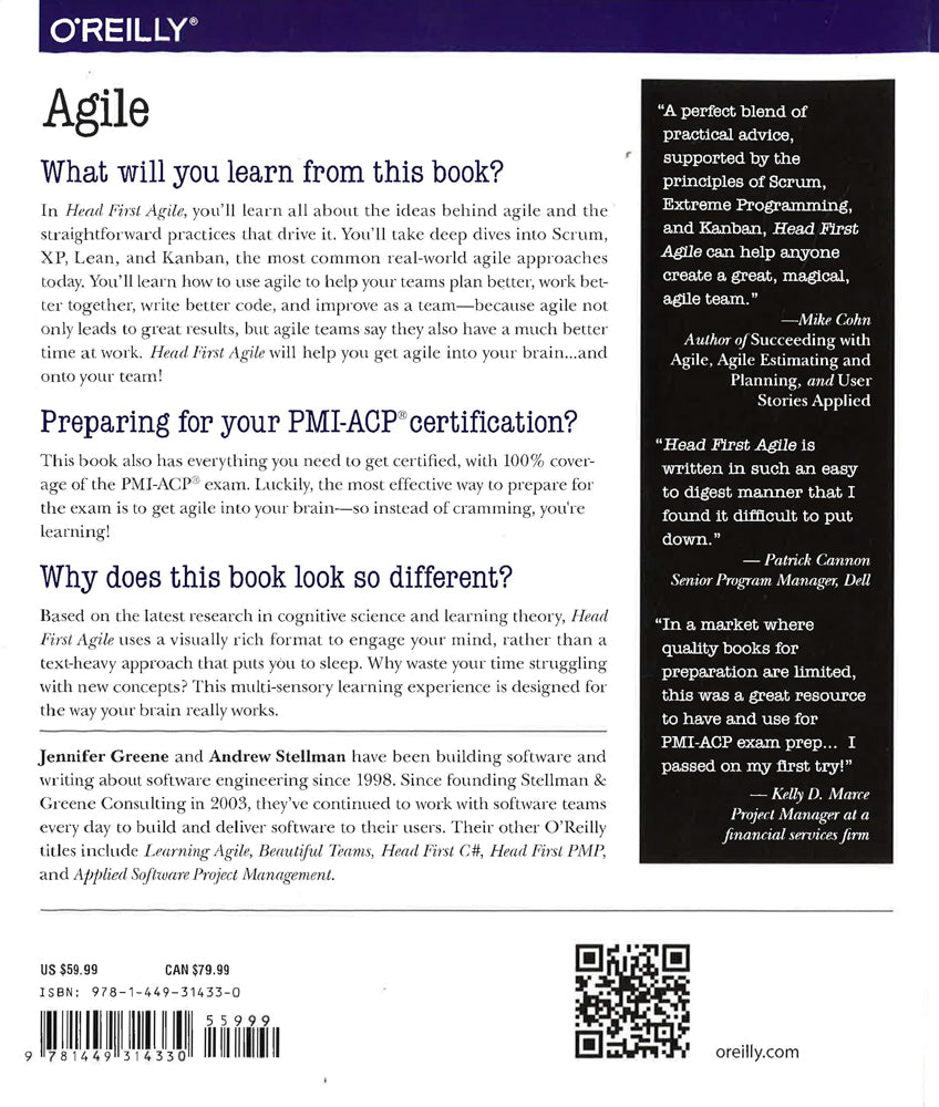 What will you learn from this book? It's an exciting time to be agile! Finally, our industry has found a real, sustainable way to solve problems that have perplexed generations of software developers. Agile not only leads to great results, but teams say they also have a much better time at work. Yet ... if agile is so great, why isn't everyone doing it? It turns out that agile can work well for one team and cause serious problems for another. The difference is team mindset. With this brain-friendly guide, you'll change the way you think about your projects-for the better! Preparing for your PMI-ACP certification? This book has everything you need to pass the exam: a complete study guide, tips, exam questions, and a full-length practice PMI-ACP exam. Why does this book look so different? Based on the latest research in cognitive science and learning theory, Head First Agile uses a visually rich format to engage your mind, rather than a text-heavy approach that puts you to sleep. Why waste your time struggling with new concepts? This multi-sensory learning experience is designed for the way your brain really works.