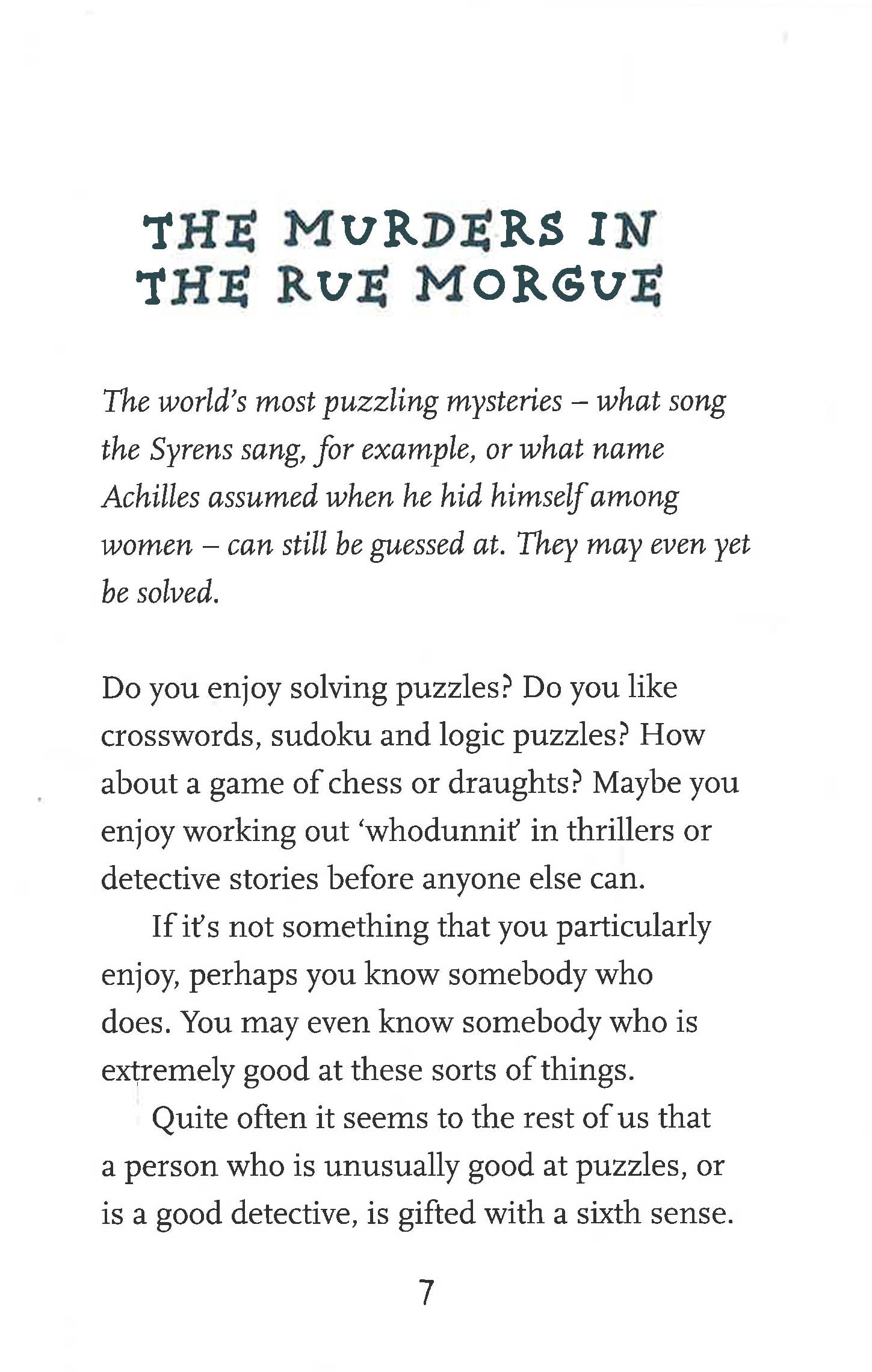 Before you start, here are a few tips. To be a good detective you need the same skills as a good card-player. You must consider and examine every detail, not just the obvious ones. You have to observe every change in a person's face, everything they say, everything they do and you must always expect the unexpected. And finally, you must remember it all. In this most strange tale, you'll see a friend of mine at work. He has an astonishingly analytical mind. So, pit your own powers of analysis against his - and against mine. Can you solve the mystery of the murders in the Rue Morgue? (Age Range 9-12)