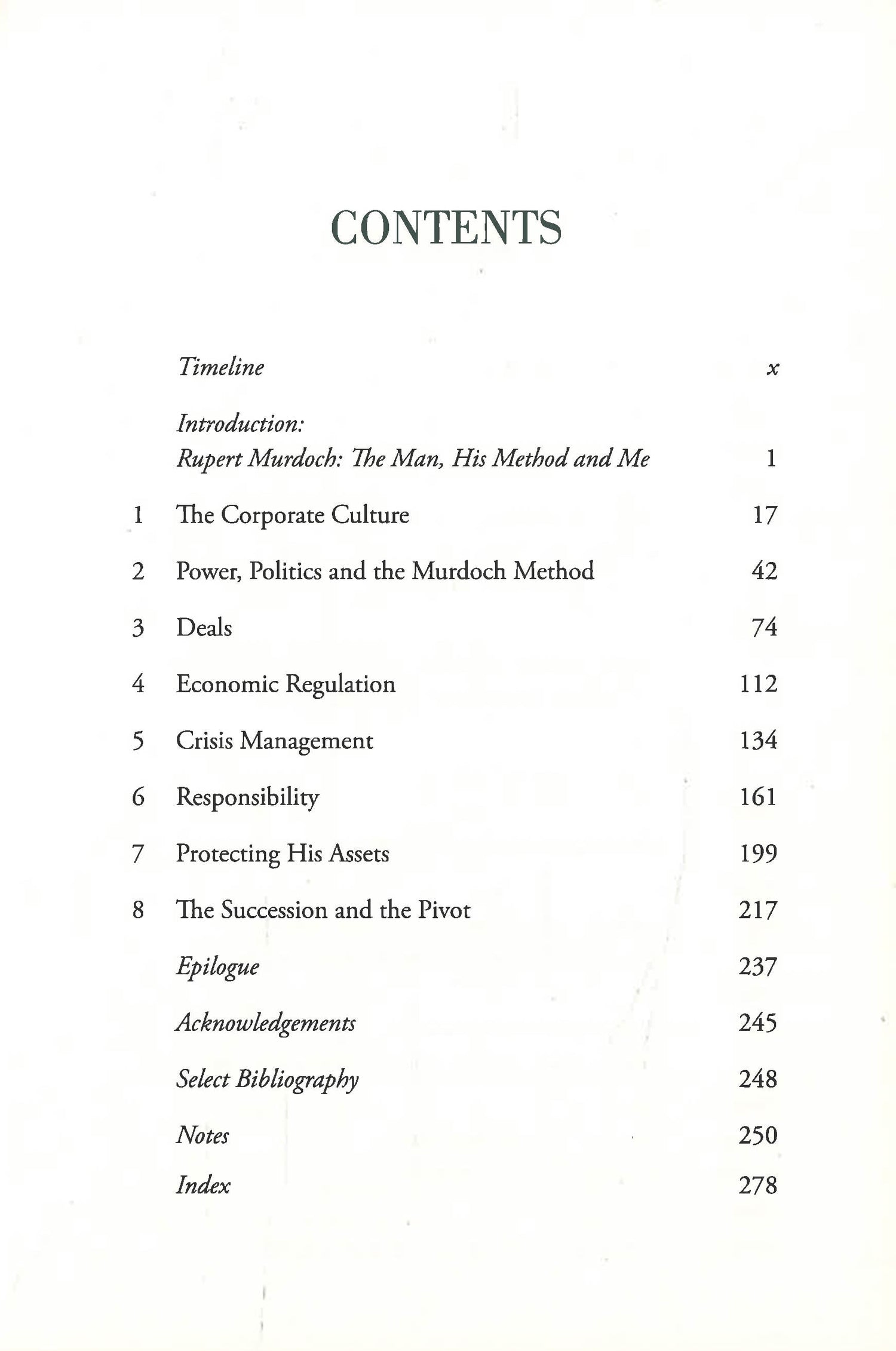 Here are the philosophies on how Rupert approaches and values deals, whether stalking the Wall Street Journal for decades before pouncing, or "over-paying" for everything from Fox Studios to NFL rights; how he copes with regulatory constraints; how he wins some and loses some, must notably MySpace. The Murdoch Method is the sum total of the management techniques that grew out of Rupert's attitudes and conceptions, taking him from a struggling newspaper in an out-of-the-way town in Australia to running a globe-dominating media enterprise.