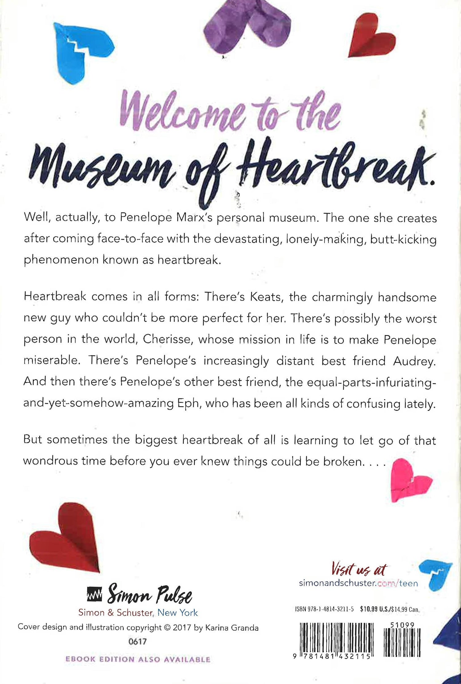 "A charming, tender, and hilarious debut you will want to get lost in." --Gayle Forman, bestselling author of If I Stay and I Was Here In this ode to all the things we gain and lose and gain again, seventeen-year-old Penelope Marx curates her own mini-museum to deal with all the heartbreaks of love, friendship, and growing up. Welcome to the Museum of Heartbreak. Well, actually, to Penelope Marx's personal museum. The one she creates after coming face to face with the devastating, lonely-making butt-kicking phenomenon known as heartbreak. Heartbreak comes in all forms: There's Keats, the charmingly handsome new guy who couldn't be more perfect for her. There's possibly the worst person in the world, Cherisse, whose mission in life is to make Penelope miserable. There's Penelope's increasingly distant best friend Audrey. And then there's Penelope's other best friend, the equal-parts-infuriating-and-yet-somehow-amazing Eph, who has been all kinds of confusing lately. But sometimes the biggest heartbreak of all is learning to let go of that wondrous time before you ever knew things could be broken...