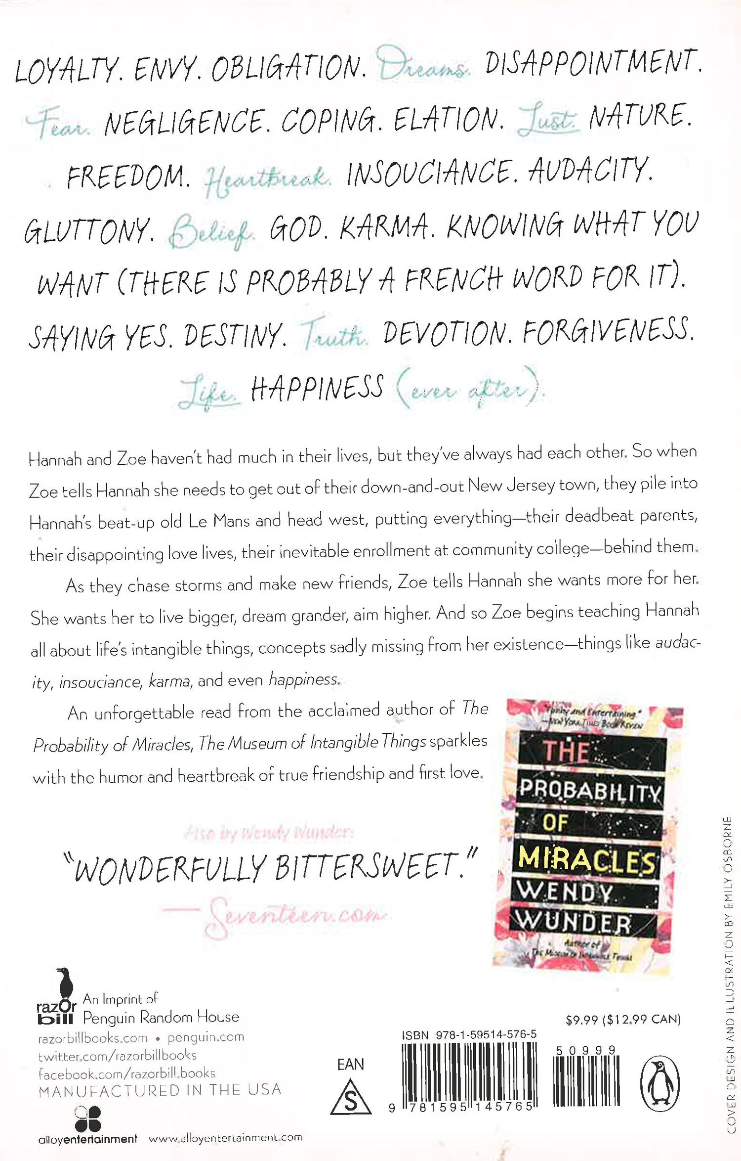 ?A crisp, beautifully crafted story of adventure, love, and the limits of friendship?? ?Booklist (Starred Review) Hannah and Zoe haven?t had much in their lives, but they?ve always had each other. So when Zoe tells Hannah she needs to get out of their down-and-out New Jersey town, they pile into Hannah?s beat-up old Le Mans and head west, putting everything?their deadbeat parents, their disappointing love lives, their inevitable enrollment at community college?behind them. As they chase storms and make new friends, Zoe tells Hannah she wants her to live bigger, dream grander, aim higher. And so Zoe begins teaching Hannah all about life?s intangible things, concepts sadly missing from her existence?things like audacity, insouciance, karma, and even happiness. *This book may have remainder mark*