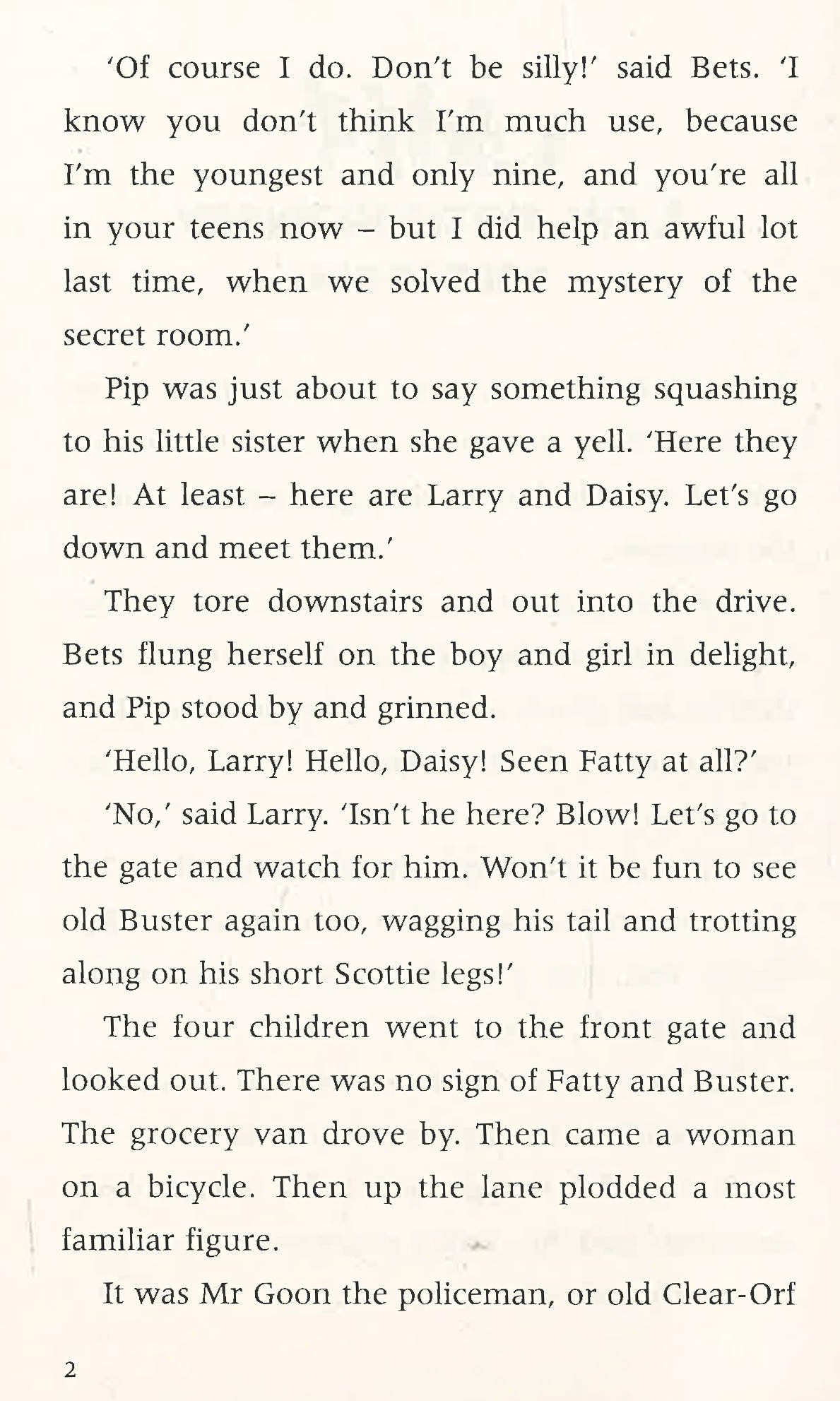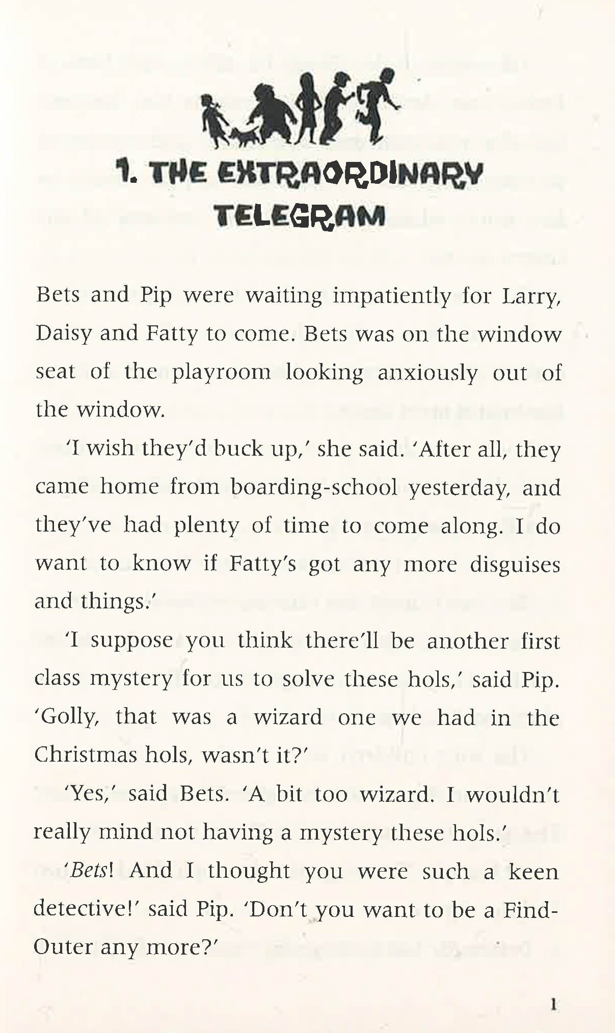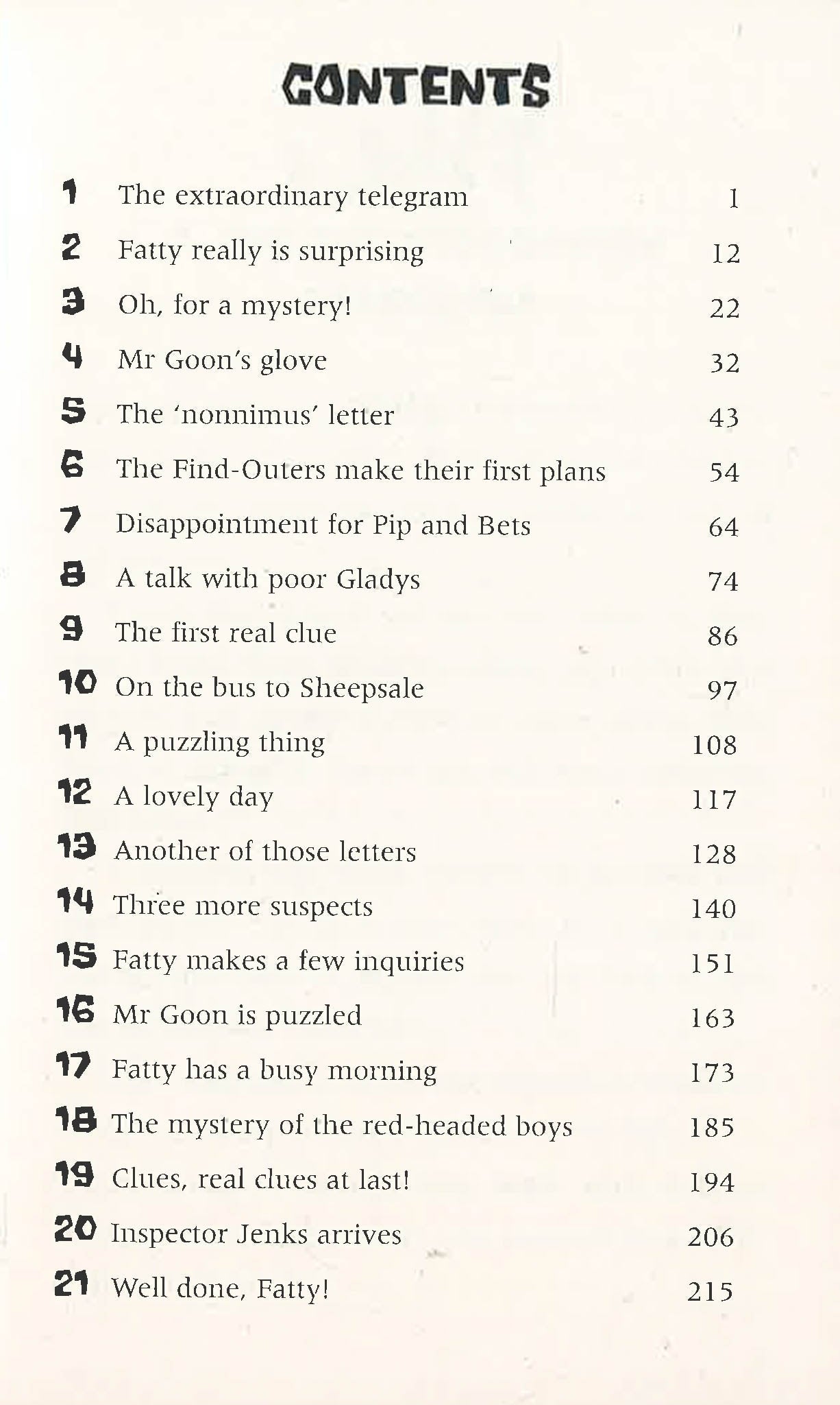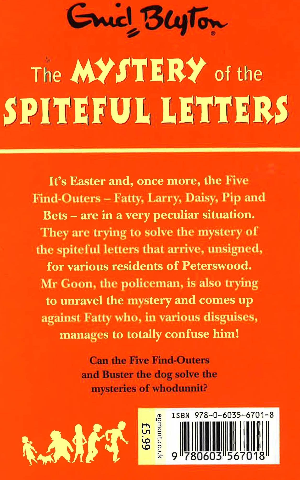 It's Easter and ,once more, the Five Find-Outers- Fatty, Larry, Daisy, pip and Bets-are in a very peculiar situation they are trying to solve the mystery of the spiteful letters that arrive, unsigned, for various residents of peterwood, Mr Goon, the policeman, is also trying to unravel the mystery and comes up against Fatty who, in various disquises, manages to totally confuse him!