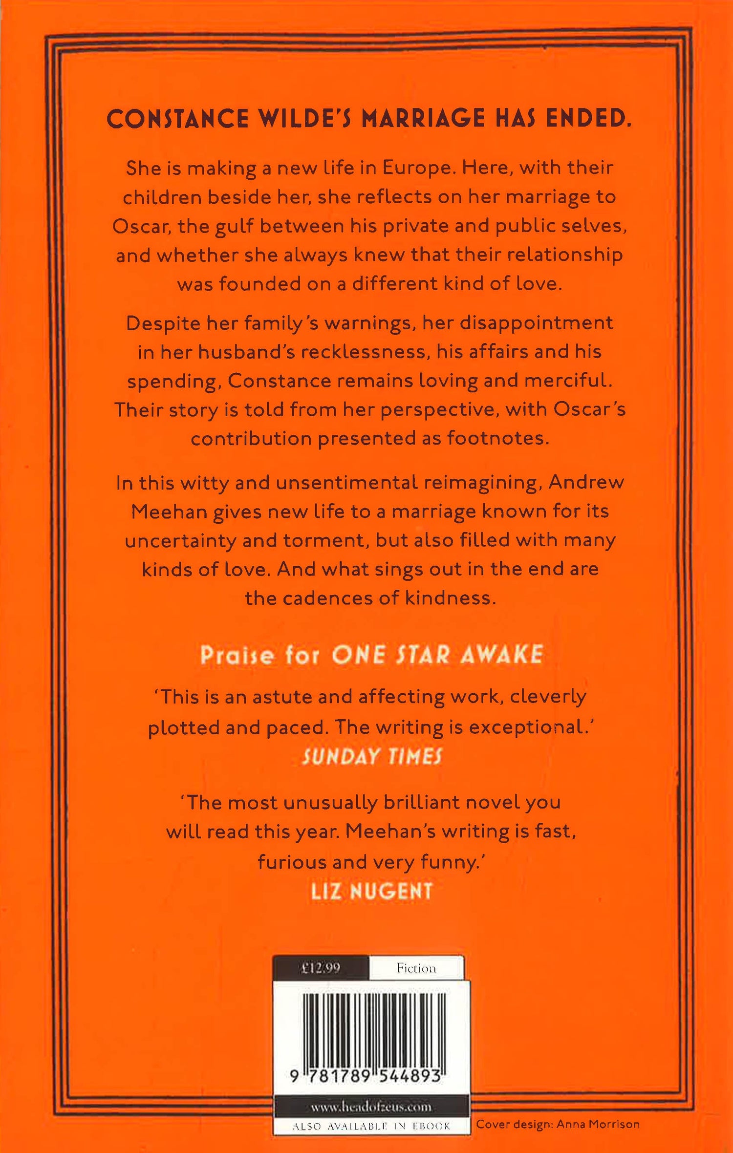 CONSTANCE WILDE'S MARRIAGE HAS ENDED. Making a new life in Europe, she reflects on her marriage with Oscar Wilde. Despite her family's warnings, his affairs and his spending, she knows they loved each other in their own way. In this witty and unsentimental reimagining, Andrew Meehan gives a voice to a woman often relegated to the footnotes of her husband's history, and gives new life to a marriage known for its uncertainty and torment.