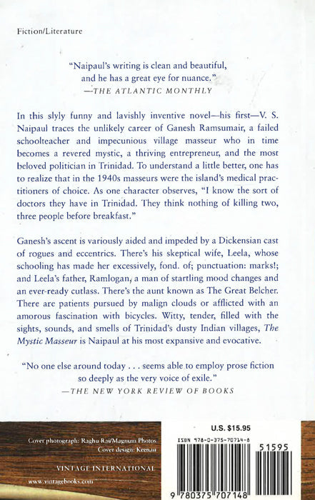 In this slyly funny and lavishly inventive novel-his first-V. S. Naipaul traces the unlikely career of Ganesh Ramsumair, a failed schoolteacher and impecunious village masseur who in time becomes a revered mystic, a thriving entrepreneur, and the most beloved politician in Trinidad. To understand a little better, one has to realize that in the 1940s masseurs were the island's medical practitioners of choice. As one character observes, "I know the sort of doctors they have in Trinidad. They think nothing of killing two, three people before breakfast." Ganesh's ascent is variously aided and impeded by a Dickensian cast of rogues and eccentrics. There's his skeptical wife, Leela, whose schooling has made her excessively, fond. of; punctuation: marks!; and Leela's father, Ramlogan, a man of startling mood changes and an ever-ready cutlass. There's the aunt known as The Great Belcher. There are patients pursued by malign clouds or afflicted with an amorous fascination with bicycles. Witty, tender, filled with the sights, sounds, and smells of Trinidad's dusty Indian villages, The Mystic Masseur is Naipaul at his most expansive and evocative.