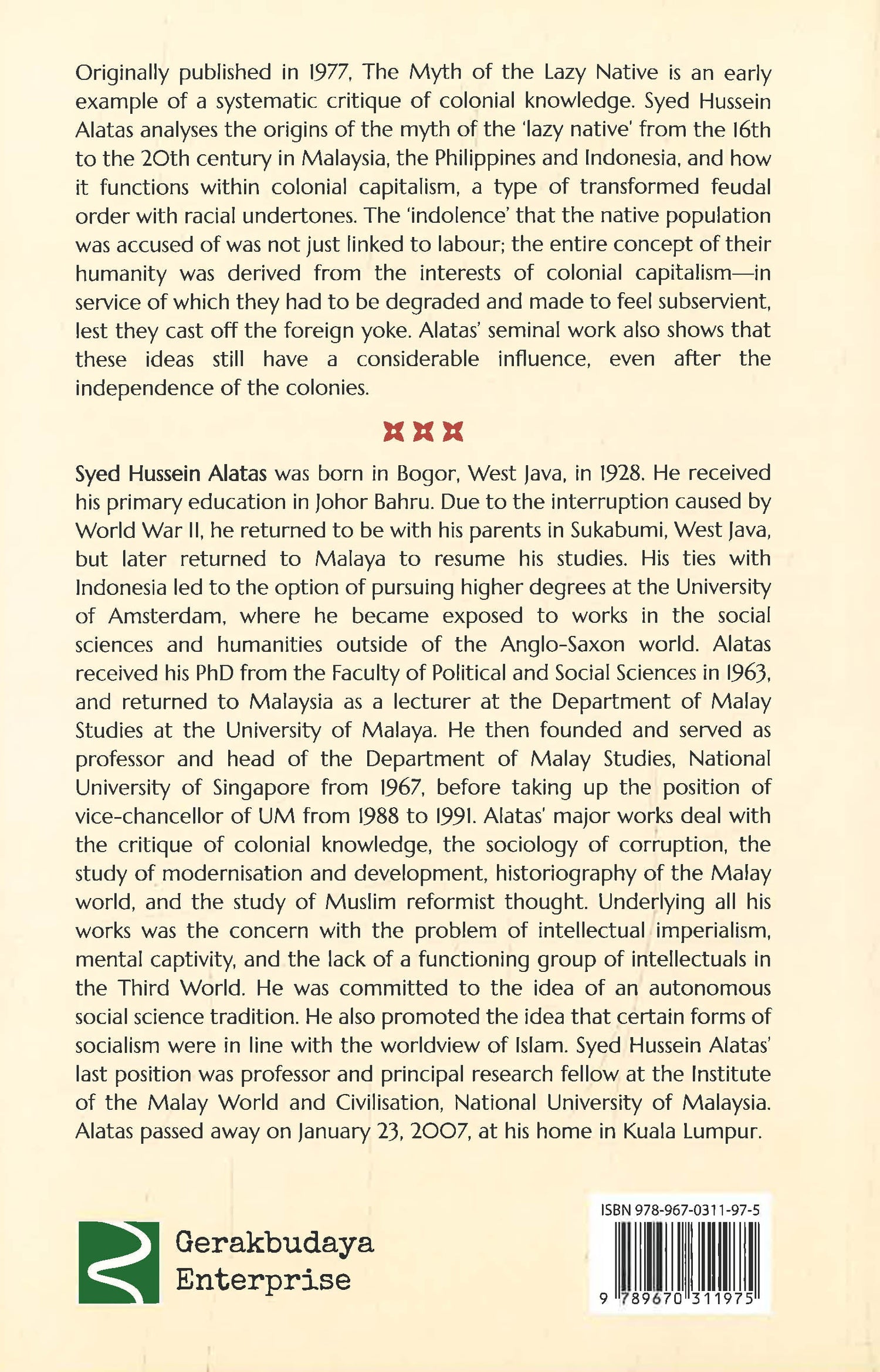 Originally published in 1977, 'The Myth of the Lazy Native' is an early example of a systematic critique of colonial knowledge. Syed Hussein Alatas analyses the origins of the myth of the ‘lazy native’ from the 16th to the 20th century in Malaysia, the Philippines and Indonesia, and how it functions within colonial capitalism, a type of transformed feudal order with racial undertones. The ‘indolence’ that the native population was accused of was not just linked to labour; the entire concept of their humanity was derived from the interests of colonial capitalism—in service of which they had to be degraded and made to feel subservient, lest they cast off the foreign yoke. Alatas’ seminal work also shows that these ideas still have a considerable influence, even after the independence of the colonies.