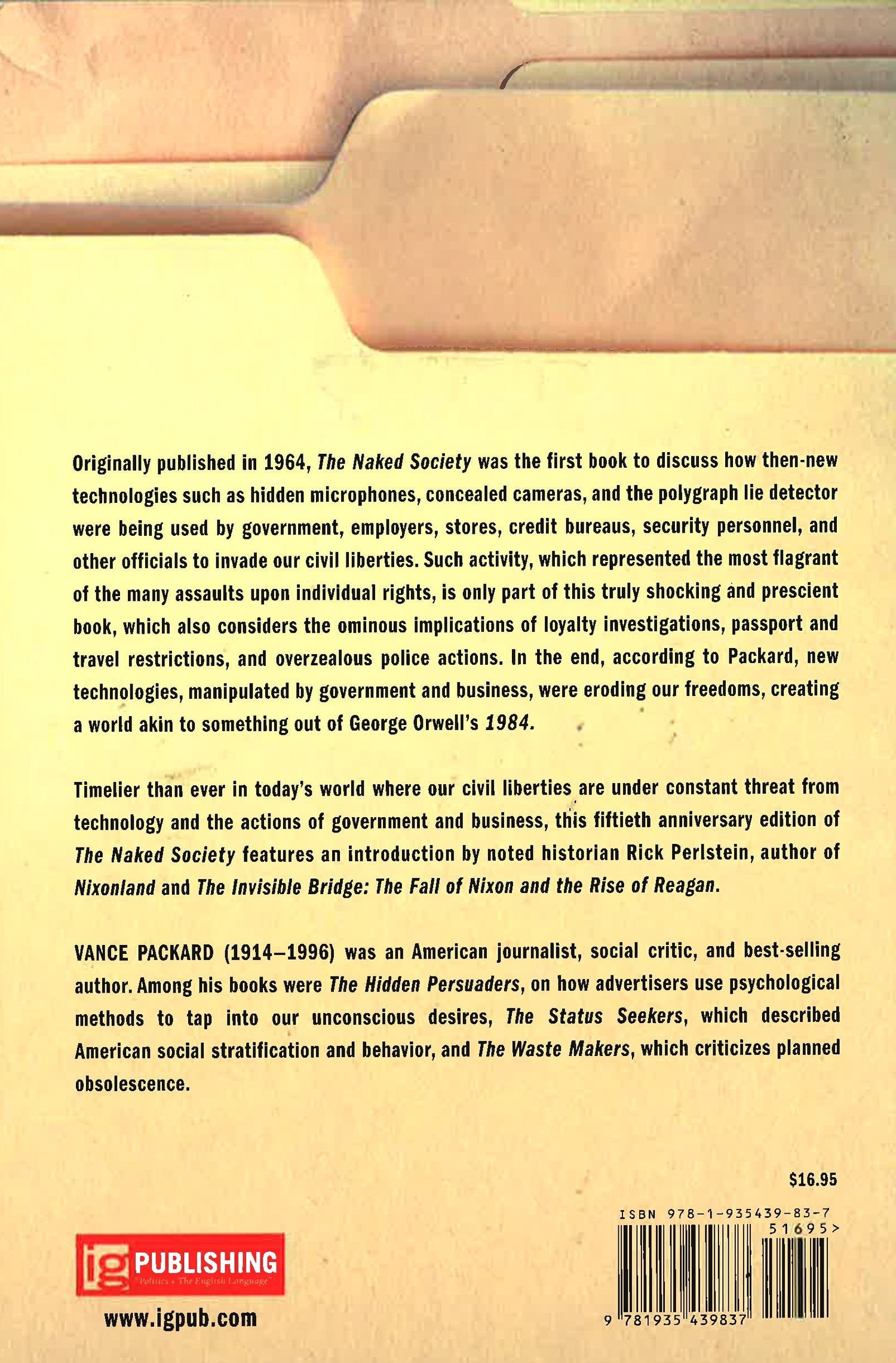 Originally published in 1964, The Naked Society was the first book to discuss how then-new technologies such as hidden microphones, concealed cameras, modern filing systems, and the polygraph lie detector could be used by government, employers, stores, credit bureaus, security personnel, and other officials to invade our civil liberties. Such activity, which represented the most flagrant of the many assaults upon individual rights, was only part of Vance Packard's truly shocking book, which also considered the ominous implications of loyalty investigations, passport and travel restrictions, and overzealous police actions. In the end, according to Packard, new technologies, manipulated by government and business, were eroding our freedoms, creating a world akin to something out of George Orwell's 1984.