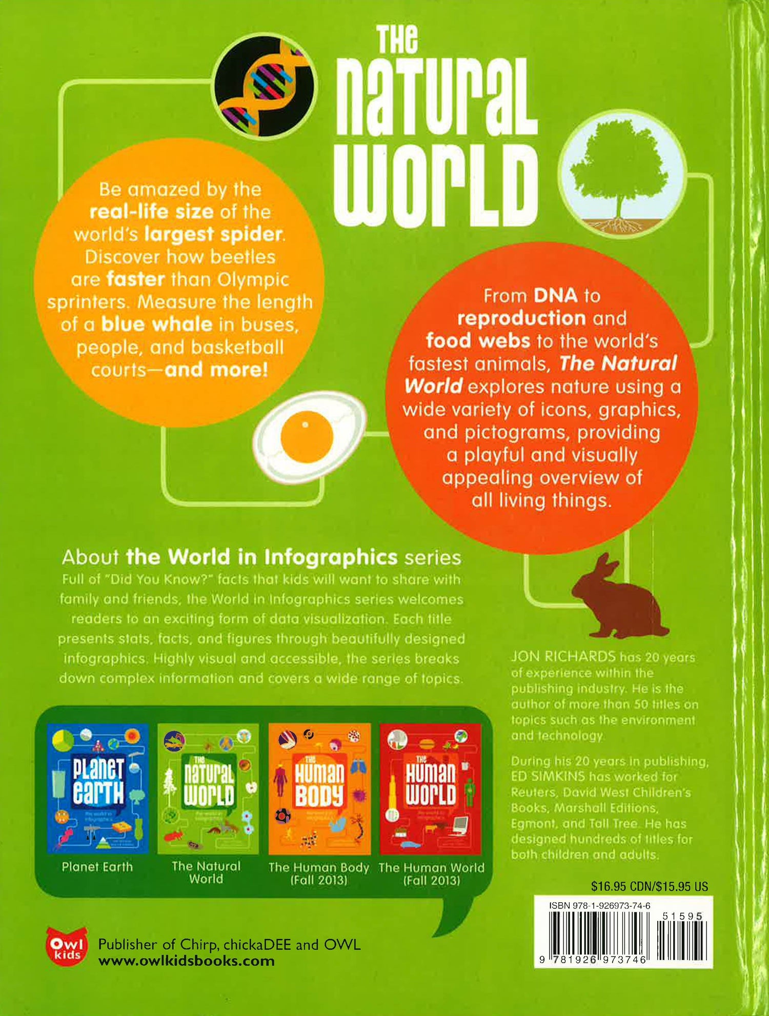 Be amazed by the real-life size of the world's largest spider; discover which animal can jump the equivalent of a human leaping over a skyscraper; measure the length of a blue whale in buses, people, and basketball courts; and more! From the animal classification system and DNA to reproduction, food webs, and the world's fastest animals, this book explores the natural world using a wide variety of icons, graphics, and pictograms. Highly visual and accessible, infographics are an increasingly popular way to introduce complex stats, facts, and figures to children, helping them to digest complex information on a number of topics.