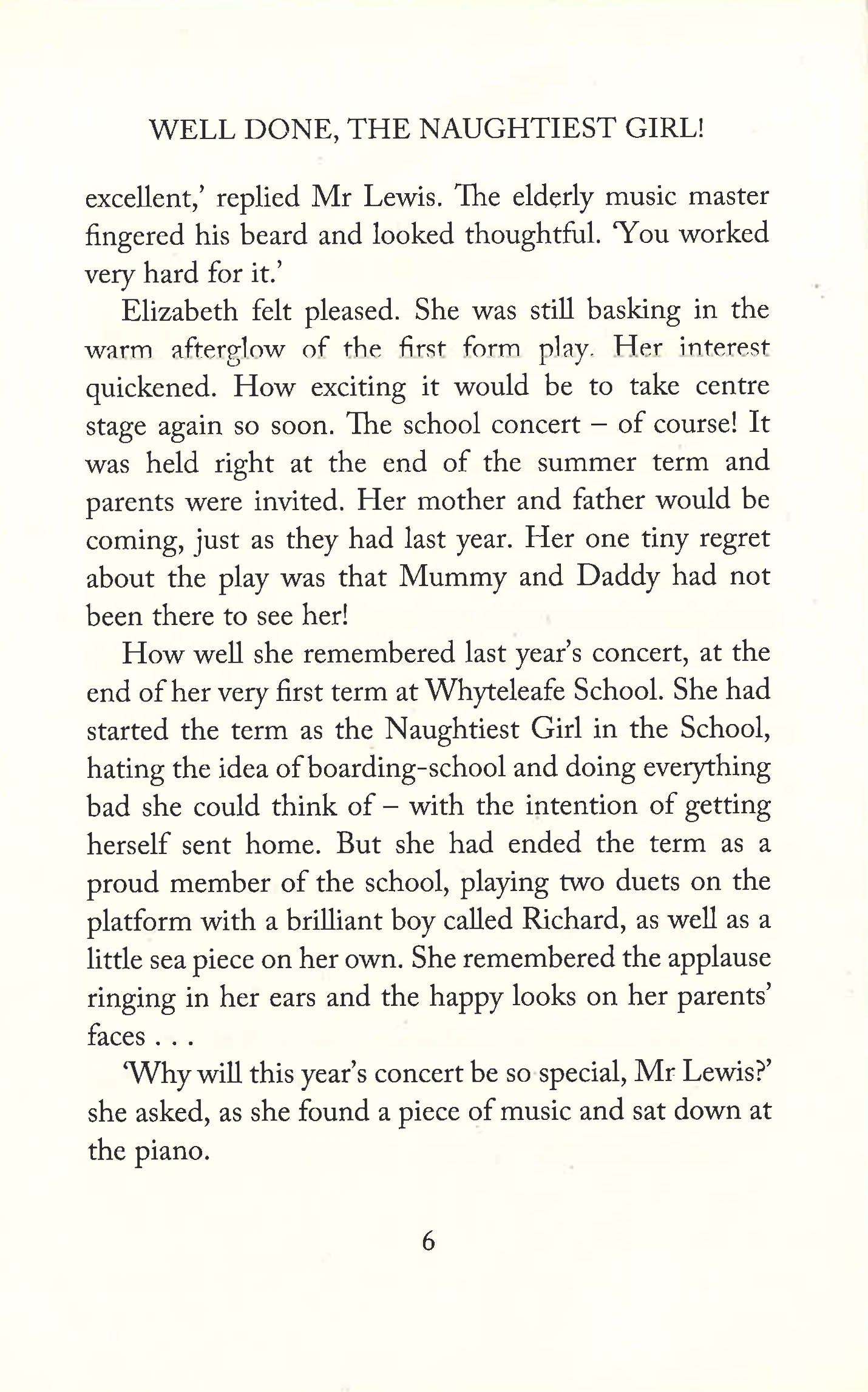 In Enid Blyton's bestselling school series Elizabeth Allen is sent away to boarding school and makes up her mind to be the naughtiest pupil there's ever been. Book 8: Well Done, The Naughtiest Girl Elizabeth is desperate to play the piano in the end of school concert. But Arabella is very good, and so Elizabeth spends every waking minute practising. But what about all the exams? Will the Naughtiest Girl have to stay in First Form another year? Book 9: Naughtiest Girl Wants To Win When new girl and famous young actress Kerry becomes head girl, Elizabeth is convinced that the seniors have been swayed by her acting skills alone. The real Kerry is a nasty piece of work - but how can she prove it? Book 10: Naughtiest Girl Marches On Elizabeth is overjoyed to be appointed monitor again. But one of the second form boys is turning all the other boys against her, starting with a nasty note in her desk. Can she find out who has a grudge against her - and why? Between 1940 and 1952, Enid Blyton wrote four novels about Naughtiest Girl, Elizabeth Allen. Books 5-10 are authorised sequels of the series written by Anne Digby in 1999. Both cover and inside illustrations were created by Kate Hindley in 2014.