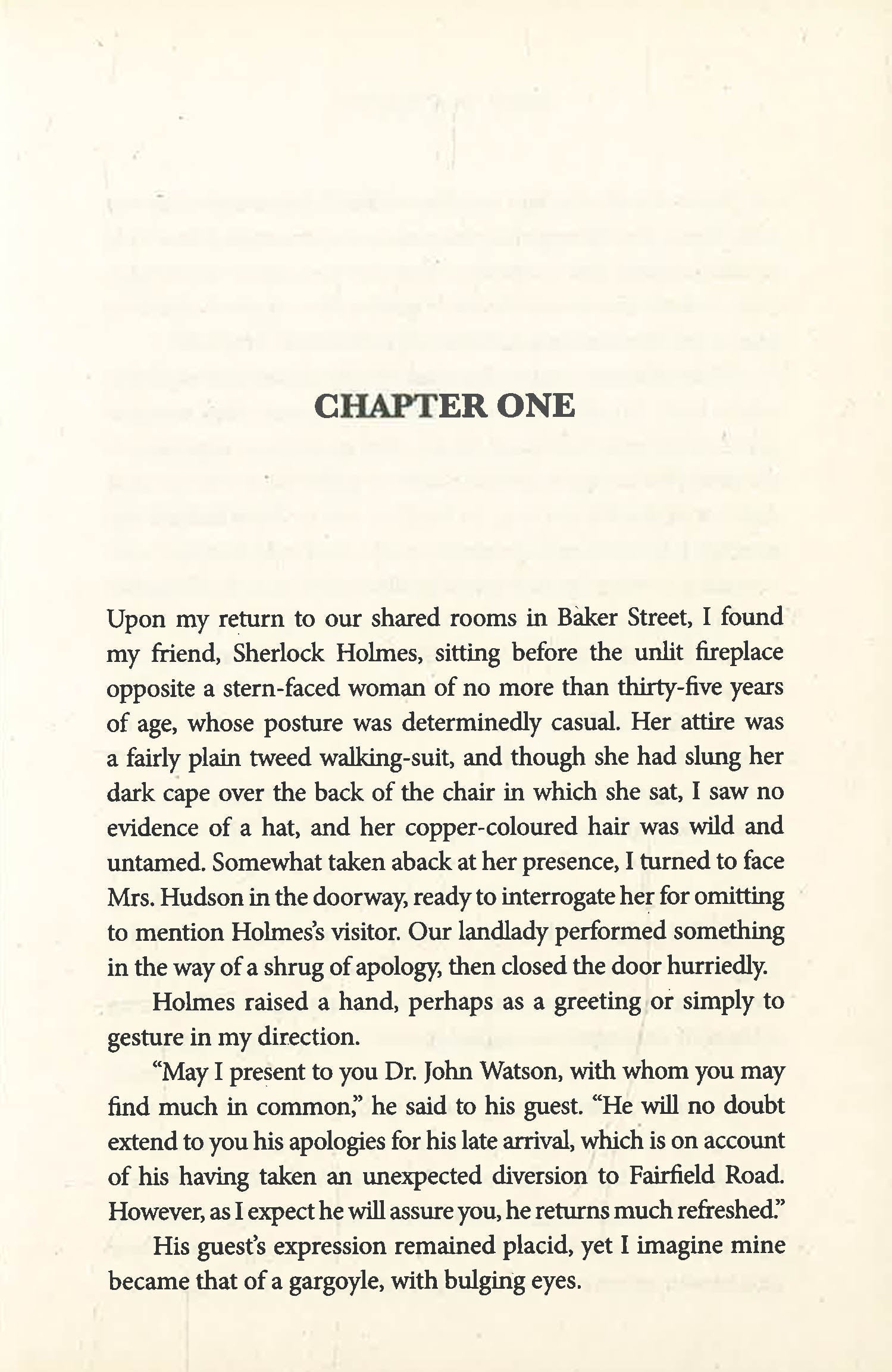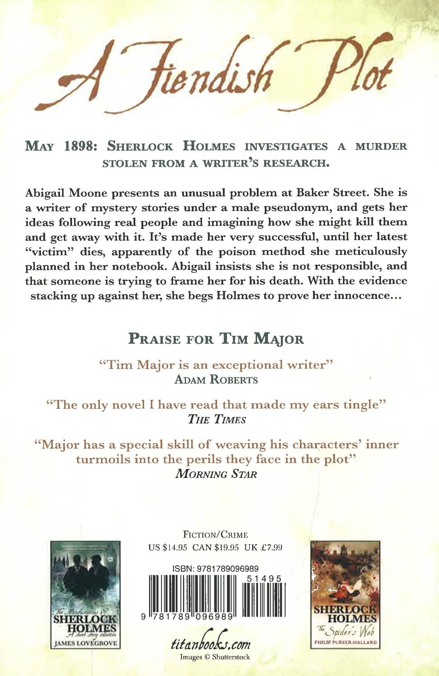 May 1898. A new client arrives at Baker Street - Abigail Moone, a wealthy, independent writer of successful mystery stories under a male pseudonym. She presents an unusual problem. Abigail claims that she devised a man's death that was reported in that morning's newspaper: that is, she planned his murder as an event to be included in one of her mystery stories. Following real people and imagining how she might murder them and get away with it is how Abigail comes up with her plots, but this "victim" has actually died, apparently of the poison method she meticulously planned in her notebook. Someone is trying to frame Abigail for his death, but with the evidence stacking up against her, she turns to Holmes to prove her innocence.