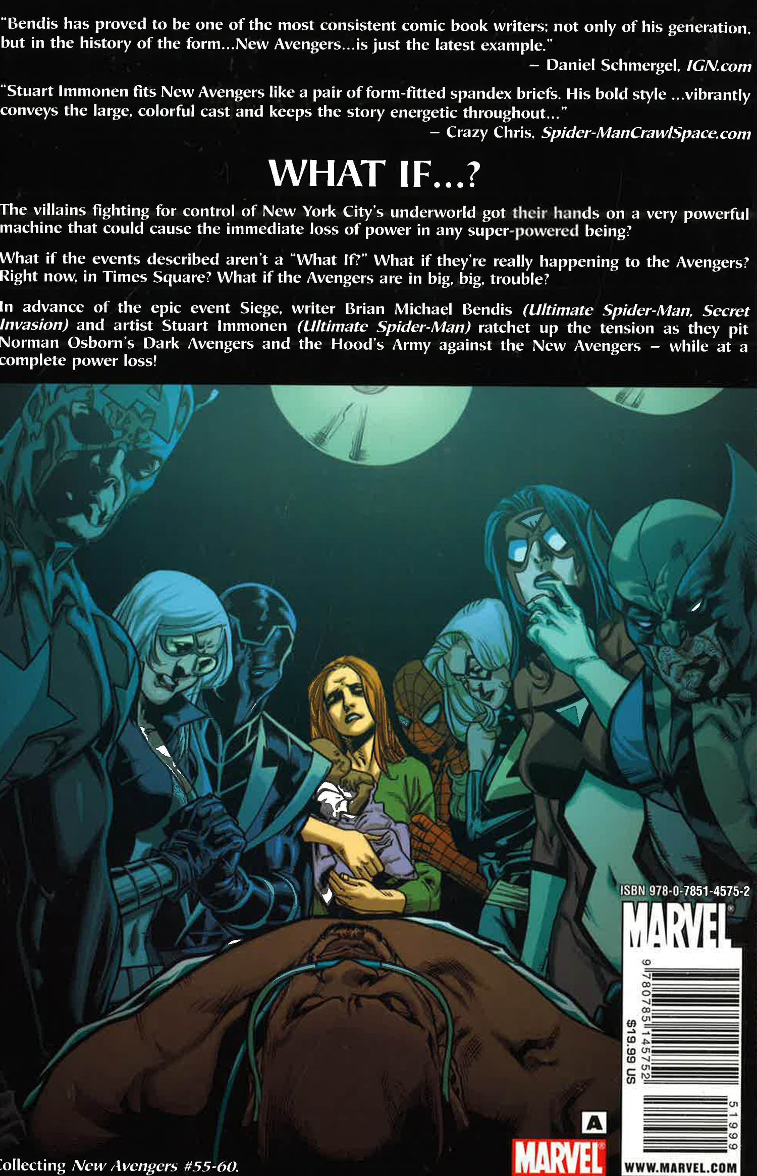 Ultimate Spider-Man artist Stuart Immonen rejoins series regular Brian Bendis for this all-new blockbuster Avengers story. One of the Hood's gang has found a way to power drain the New Avengers and it turns the tides of the Dark Reign in ways no one would have expected it. Plus, the new Sorcerer Supreme has a lot to learn, and they're going to learn it from...Spider-Man? Collects New Avengers #55-59.
