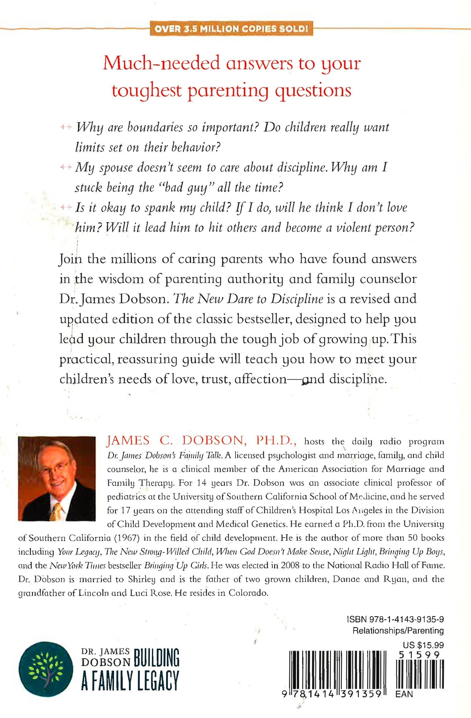 Much-needed answers to your toughest parenting questions! Why are boundaries so important? Do children really want limits set on their behavior? My spouse doesn't seem to care about discipline; why I am I stuck being the "bad guy?" Is it okay to spank my child, or will it lead him to hit others and become a violent person? Join the millions of caring parents who have found answers in the wisdom of parenting authority and family counselor Dr. James Dobson. "The New Dare to Discipline" is a revised and updated edition of the classic bestseller, designed to help you lead your children through the tough job of growing up. This practical, reassuring guide will teach you how to meet your children's needs of love, trust, affection--and discipline. (This new edition is part of Dr. James Dobson's Building A Family Legacy initiative.)