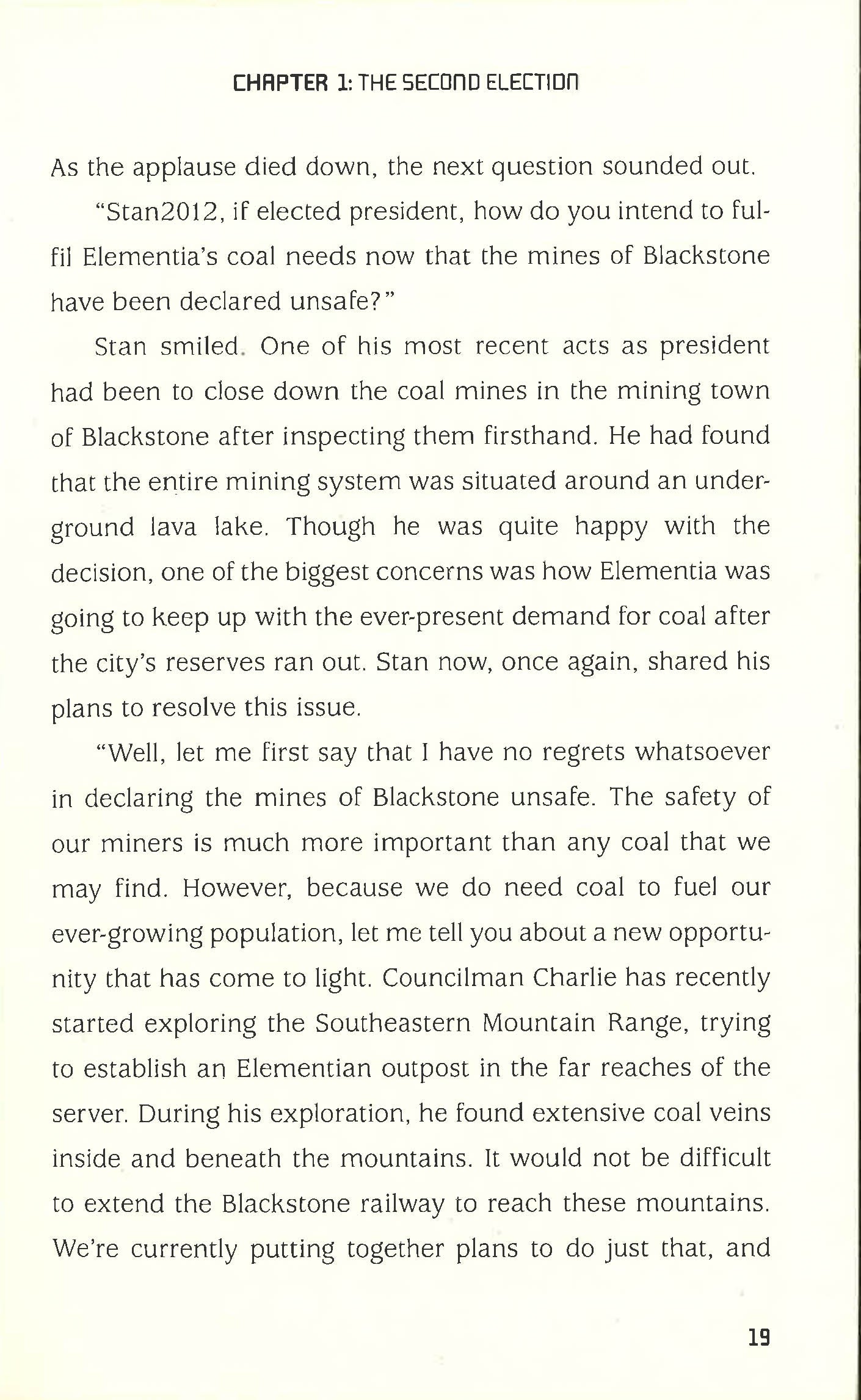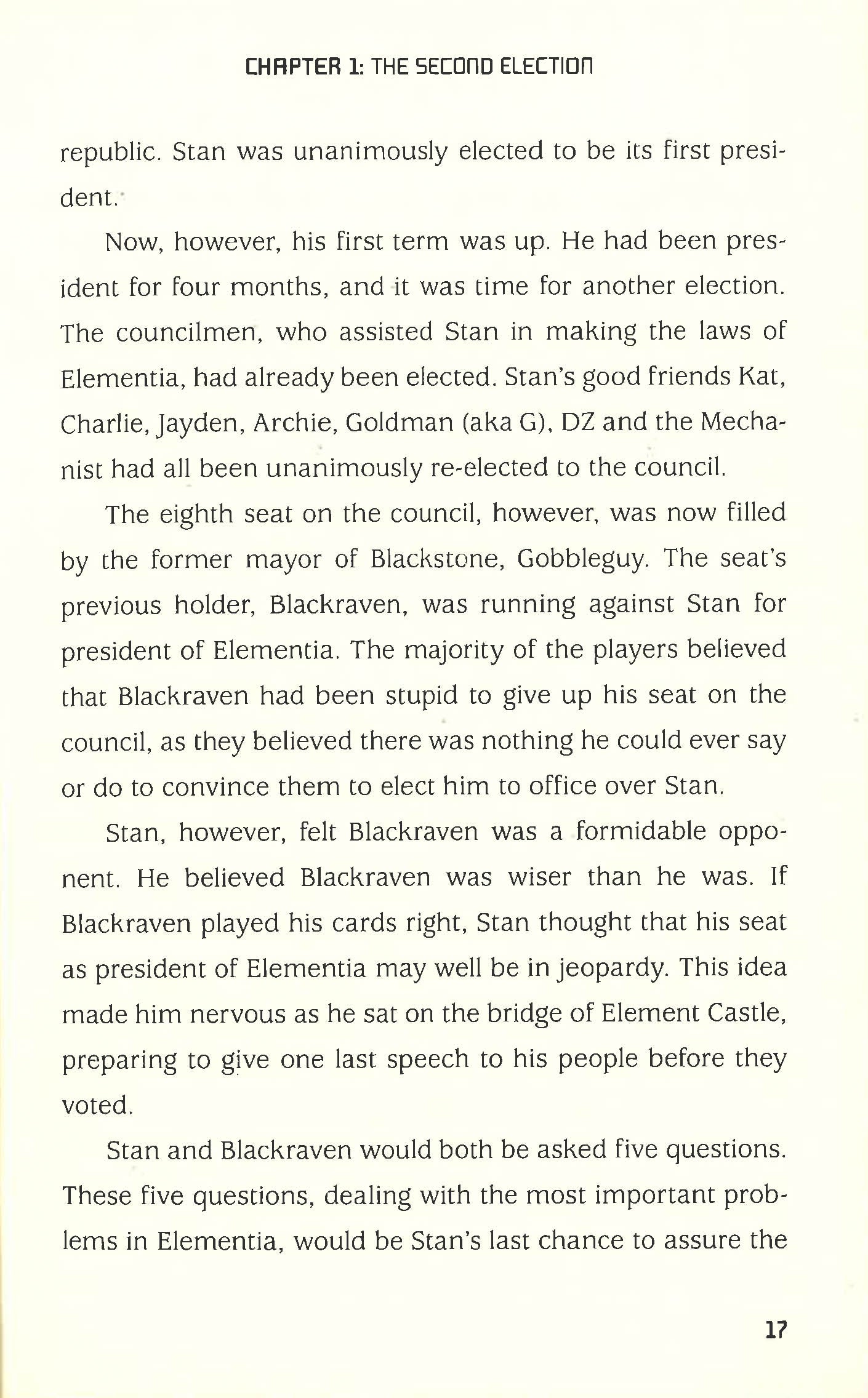 President Stan has led his people through an epic battle and brought peace to the Republic of Elementia. But dissent is rippling through the countryside. King Kev's loyal followers are still at large and a new organization, the Noctem Alliance, is poised to strike terror throughout the land. With new threats on the horizon, and citizens of the Republic dividing between two loyalties, Stan must stop the Noctem Alliance before it destroys them all.