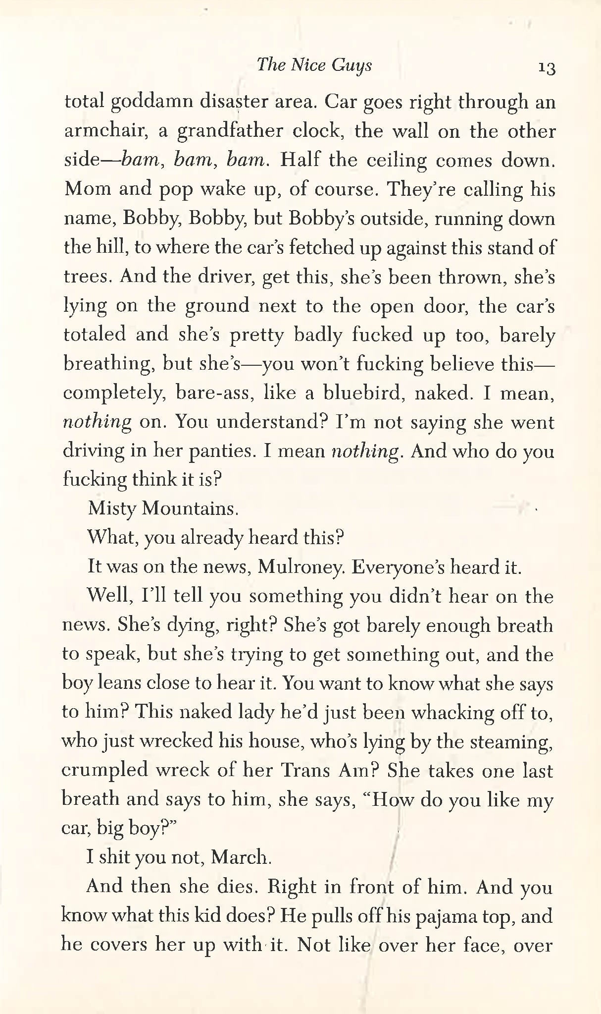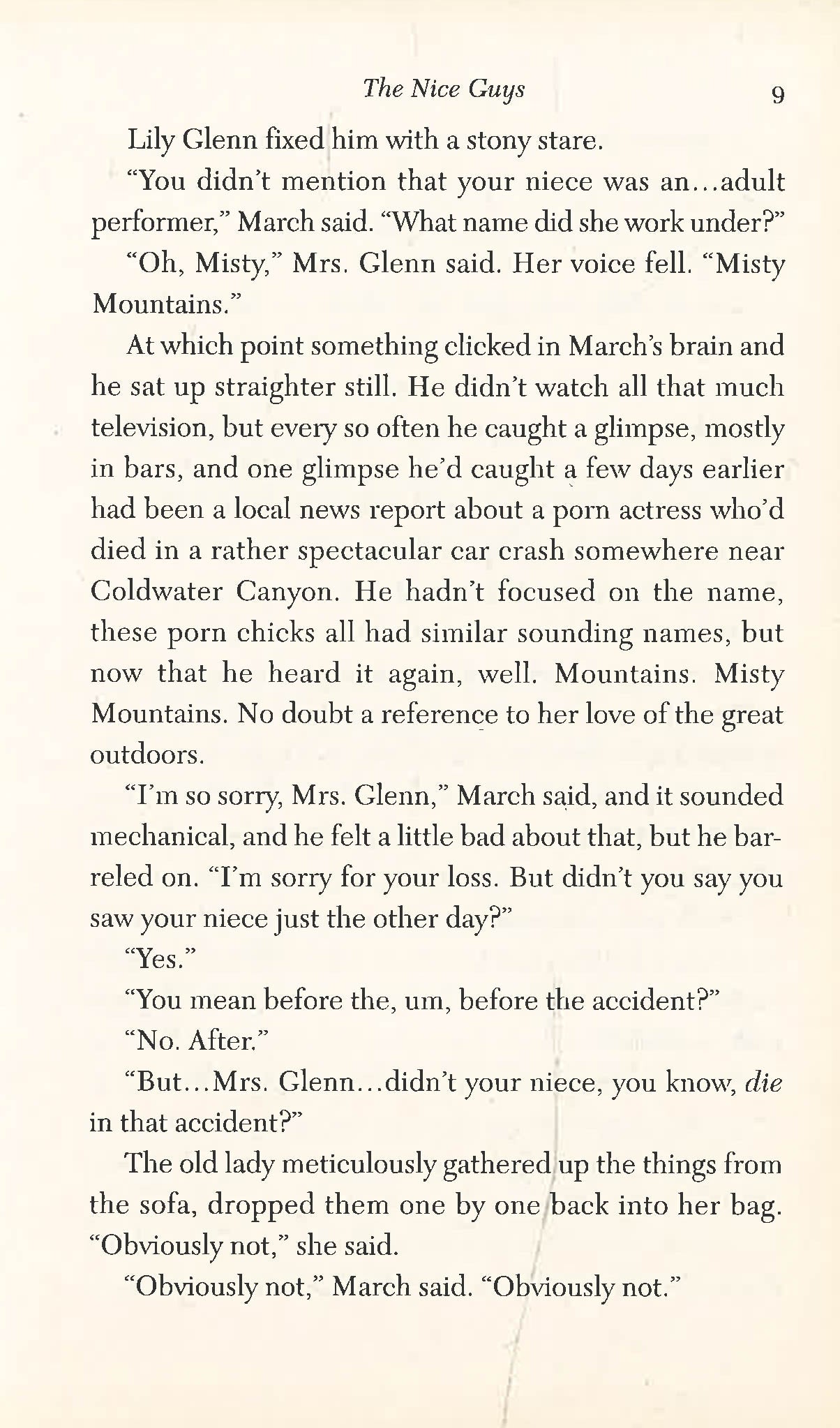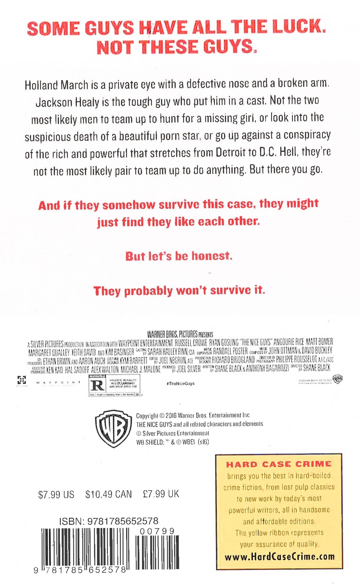 Holland March is a private eye with a defective nose and a broken arm. Jackson Healy is the tough guy who put him in a cast. Not the two most likely men to team up to hunt for a missing girl, or look into the suspicious death of a beautiful porn star, or go up against a conspiracy of the rich and powerful that stretches from Detroit to D.C. Hell, they're not the most likely pair to team up to do anything. But there you go. And if they somehow survive this case, they might just find they like each other. But let's be honest. They probably won't survive it.