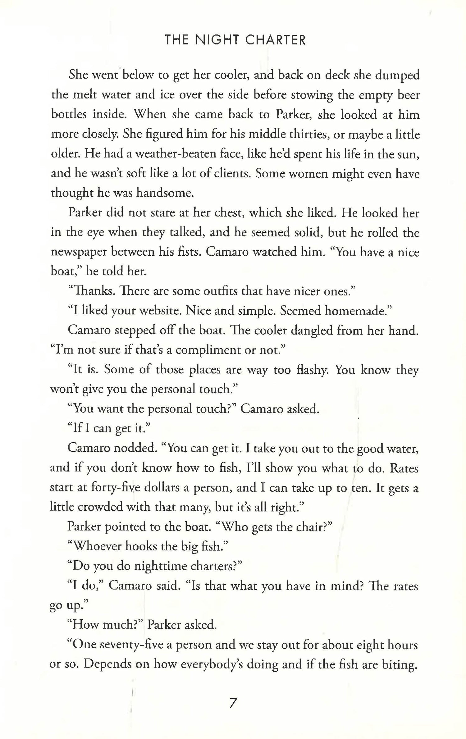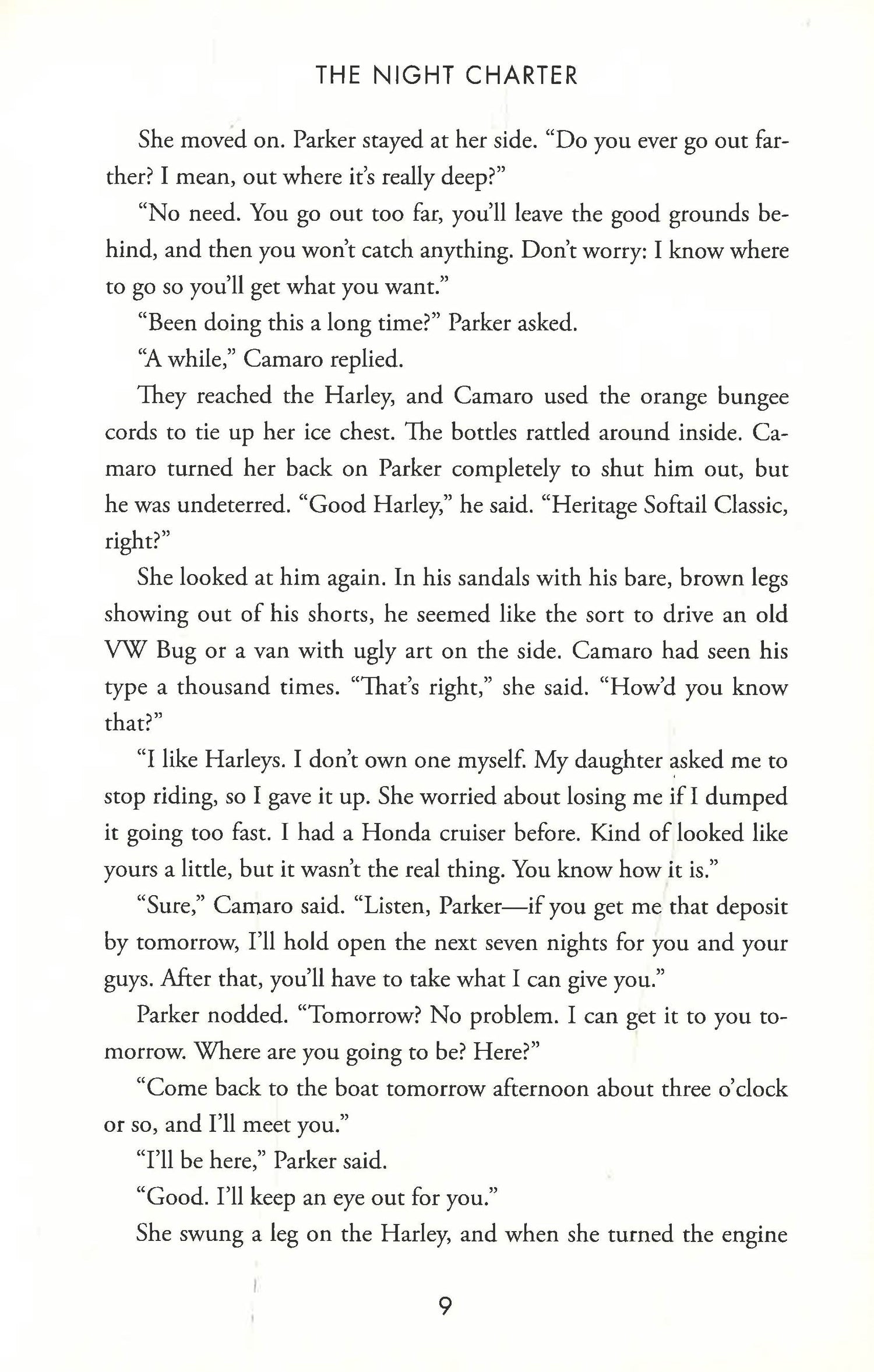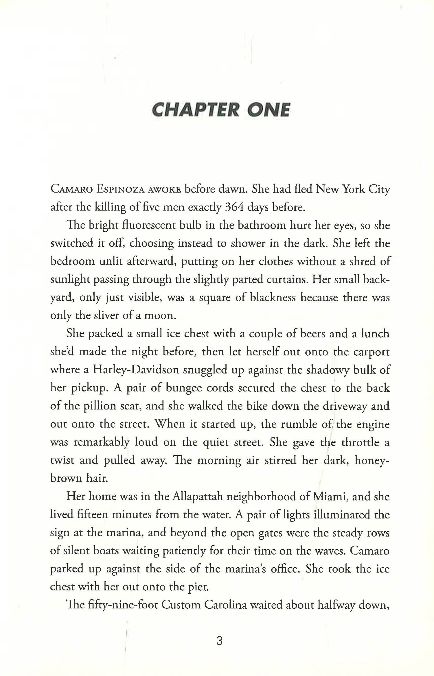 Exactly one year ago, Camaro Espinoza killed five bad men in New York City and fled town. Now she's keeping a low profile in Miami, running night charter catch-and-release fishing trips off the coast. It's a simple life for a former combat medic. But it wasn't easy to come by. Camaro plans to do everything she can to hold onto it.Trouble comes knocking in the form of Parker Story, a man in over his head with all the wrong people. Parker wants to book Camaro's boat to run a small errand off the coast of Cuba. Camaro knows she shouldn't get involved. But Parker's got a teenaged daughter named Lauren, and Parker's associates have threatened to harm her if the mission doesn't go off without a hitch. Camaro has never met the girl. Barely seen her picture. But that doesn't mean she can ignore her plight.Camaro's used to being wanted--by men good and bad, by soldiers wounded on the field of battle, by the long arm of the law. But she's never been needed before. Not the way Lauren needs her. Joining forces with Parker, Camaro soon finds herself in the midst of double crosses, international intrigue, broken promises and scattered bullets. Even a skilled warrior like herself may not be able to escape unscathed.