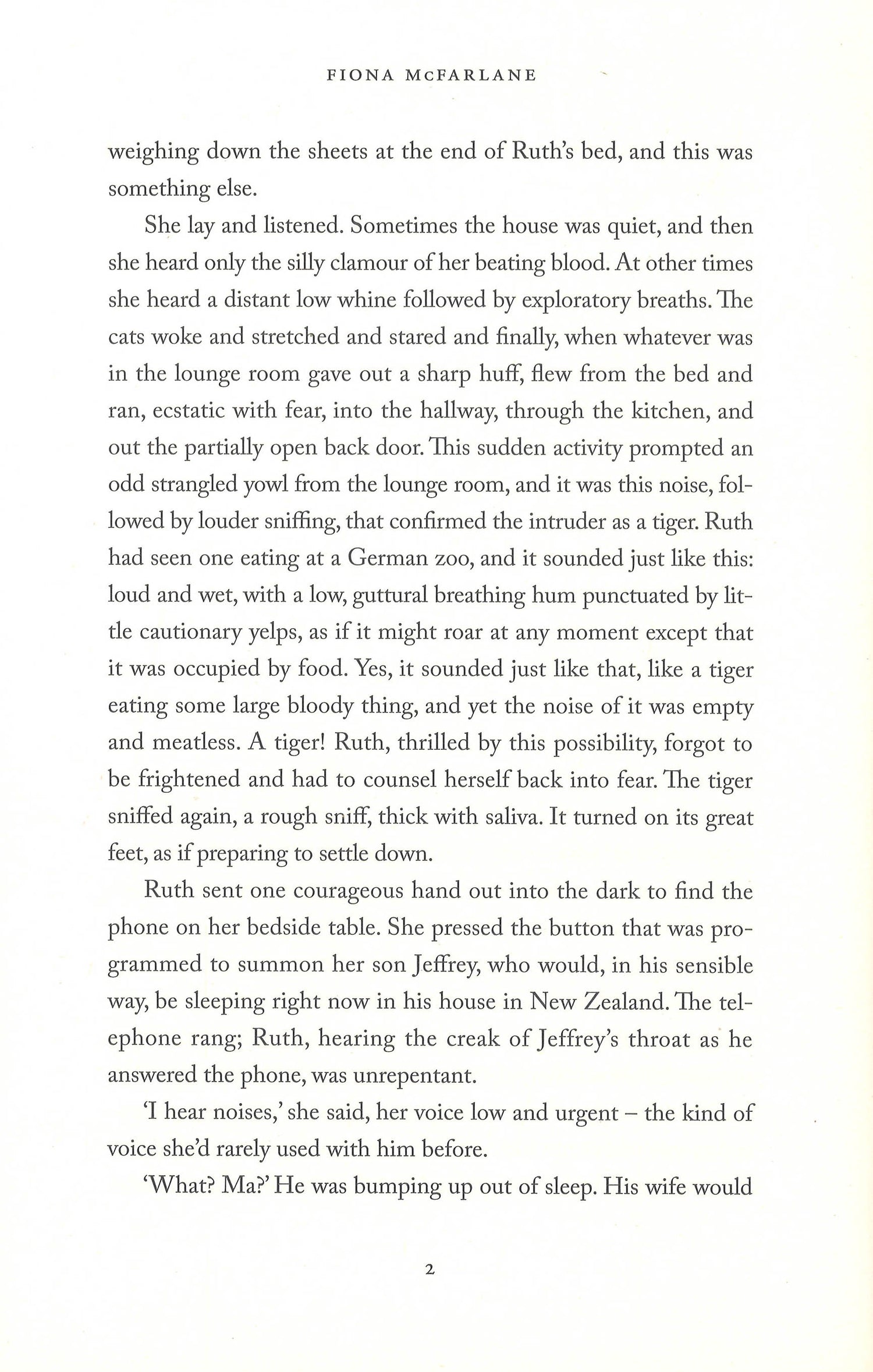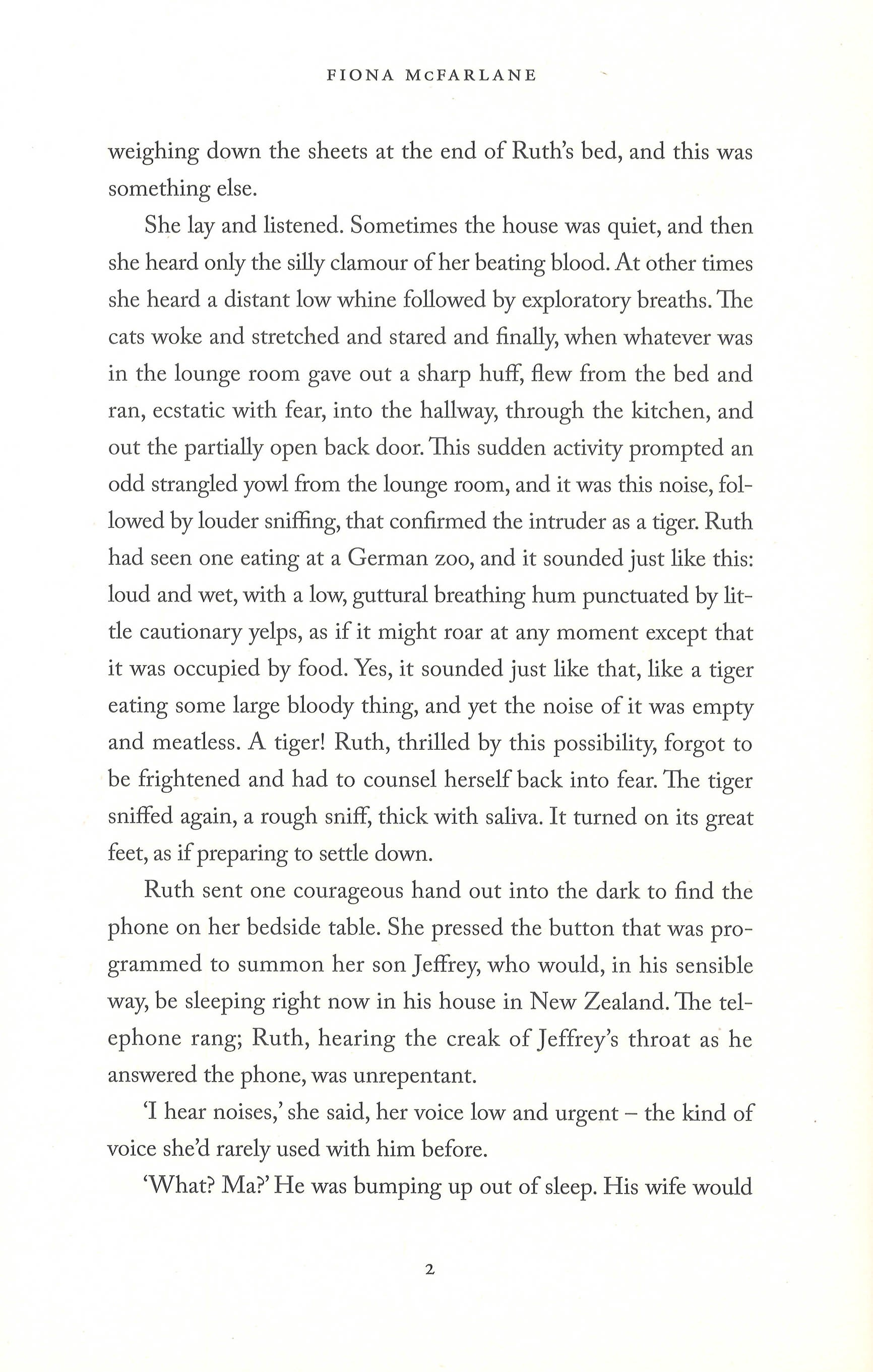 In an isolated house on the New South Wales coast, Ruth a widow whose sons work abroad lives alone. Until one day a stranger bowls up, announcing that she's been sent by the authorities to be Ruth's carer. At first, Ruth is happy to have the company. Frida is efficient and helpful, and willing to listen to Ruth's stories about her childhood in Fiji and the man she fell for there. But why does Ruth hear a tiger prowling through the house at night? How far can Ruth trust this enigmatic woman? And how far can she trust herself? This hypnotic tale soars above its own suspense to tell us, with exceptional grace and beauty, about ageing, love, dependence, fear and power, and about the mysterious workings of the mind. Here is a dazzling new writer, reminding us how powerfully fiction can speak to our innermost secrets.