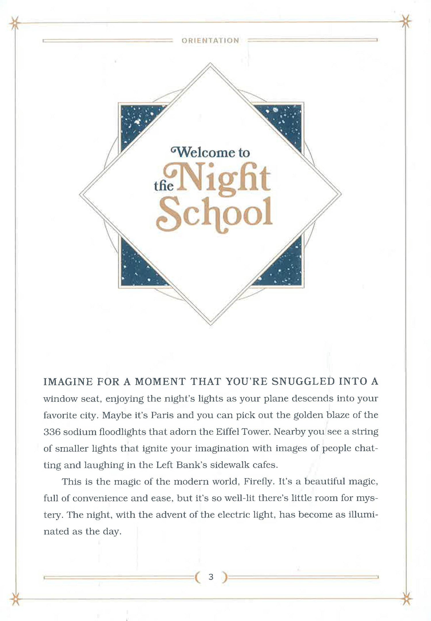 Welcome to the Night School, Firefly. Here you'll explore the farthest reaches of the universe, and the deepest parts of yourself. You'll learn to cast off the constraints of the day, and open your eyes, your heart, and your mind to the enchanted mystery of the Night. You'll travel the world in search of inspiring sites, timeless wisdom, and essential magic. And you'll do so under the bewitching guidance of the Night Mistress, your guide in the curriculum of all that lies beneath the starry sky.