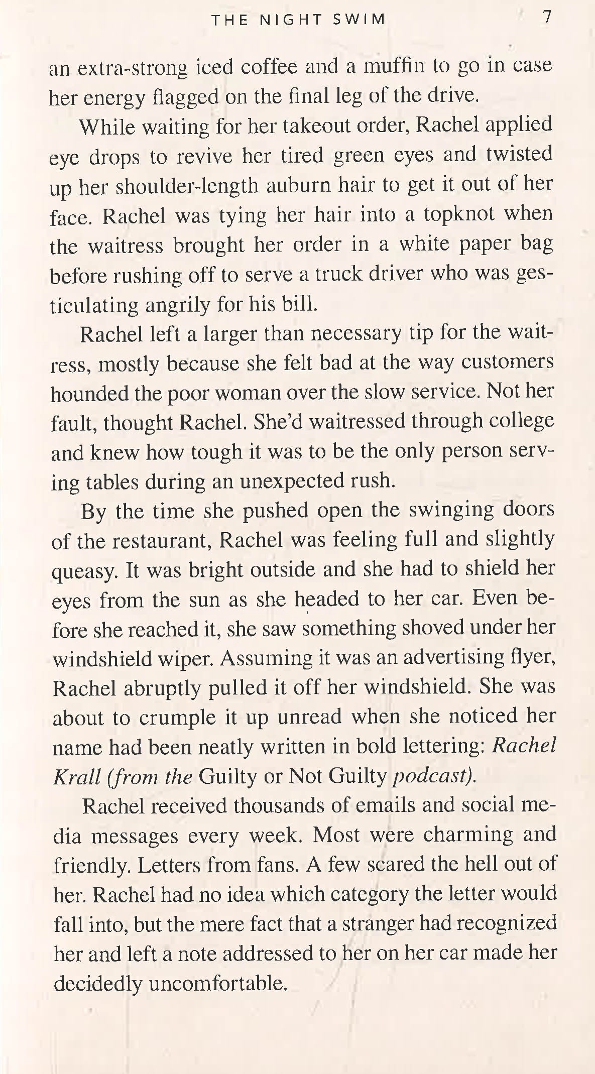 The new season of Rachel's podcast has brought her to a small town being torn apart by a devastating rape trial. A local golden boy, a swimmer destined for Olympic greatness, has been accused of raping the beloved granddaughter of the police chief. Under pressure to make Season 3 a success, Rachel throws herself into her investigation―but the mysterious letters keep coming. Someone is following her, and she won’t stop until Rachel finds out what happened to her sister twenty-five years ago. Officially, Jenny Stills tragically drowned, but the letters insist she was murdered―and when Rachel starts asking questions, nobody in town wants to answer. The past and present start to collide as Rachel uncovers startling connections between the two cases―and a revelation that will change the course of the trial and the lives of everyone involved.
