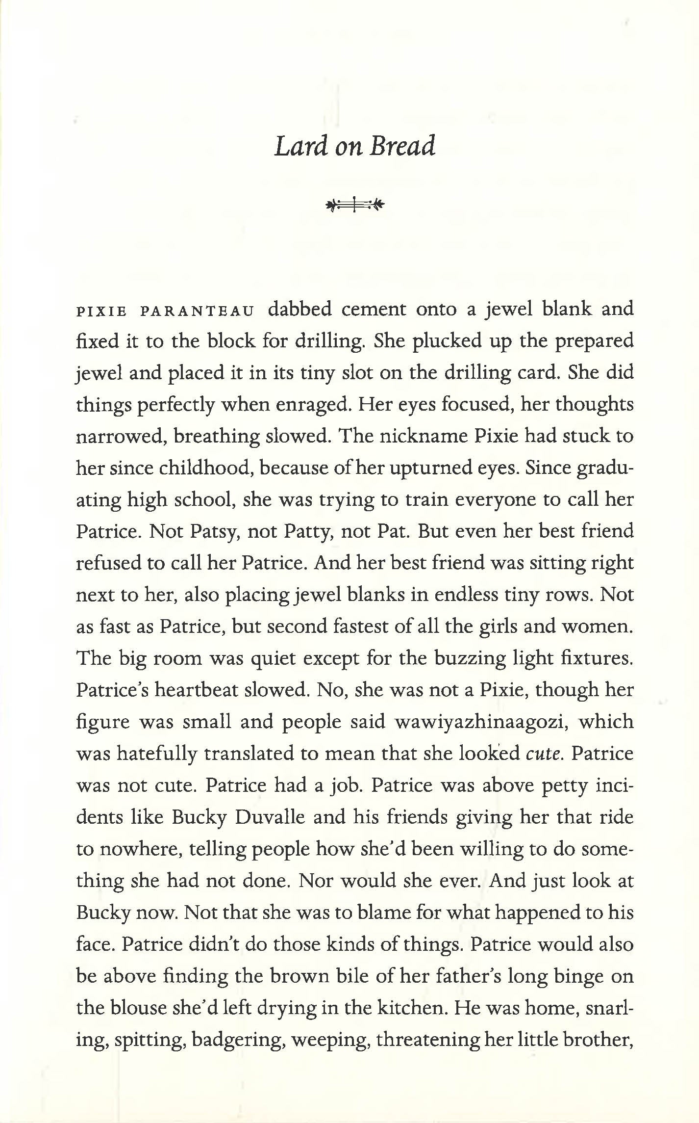 Unlike most of the girls on the reservation, Pixie - 'Patrice' - Paranteau has no desire to wear herself down on a husband and kids. She works at the factory, earning barely enough to support her mother and brother, let alone her alcoholic father who sometimes returns home to bully her for money. But Patrice needs every penny to get if she's ever going to get to Minnesota to find her missing sister Vera.