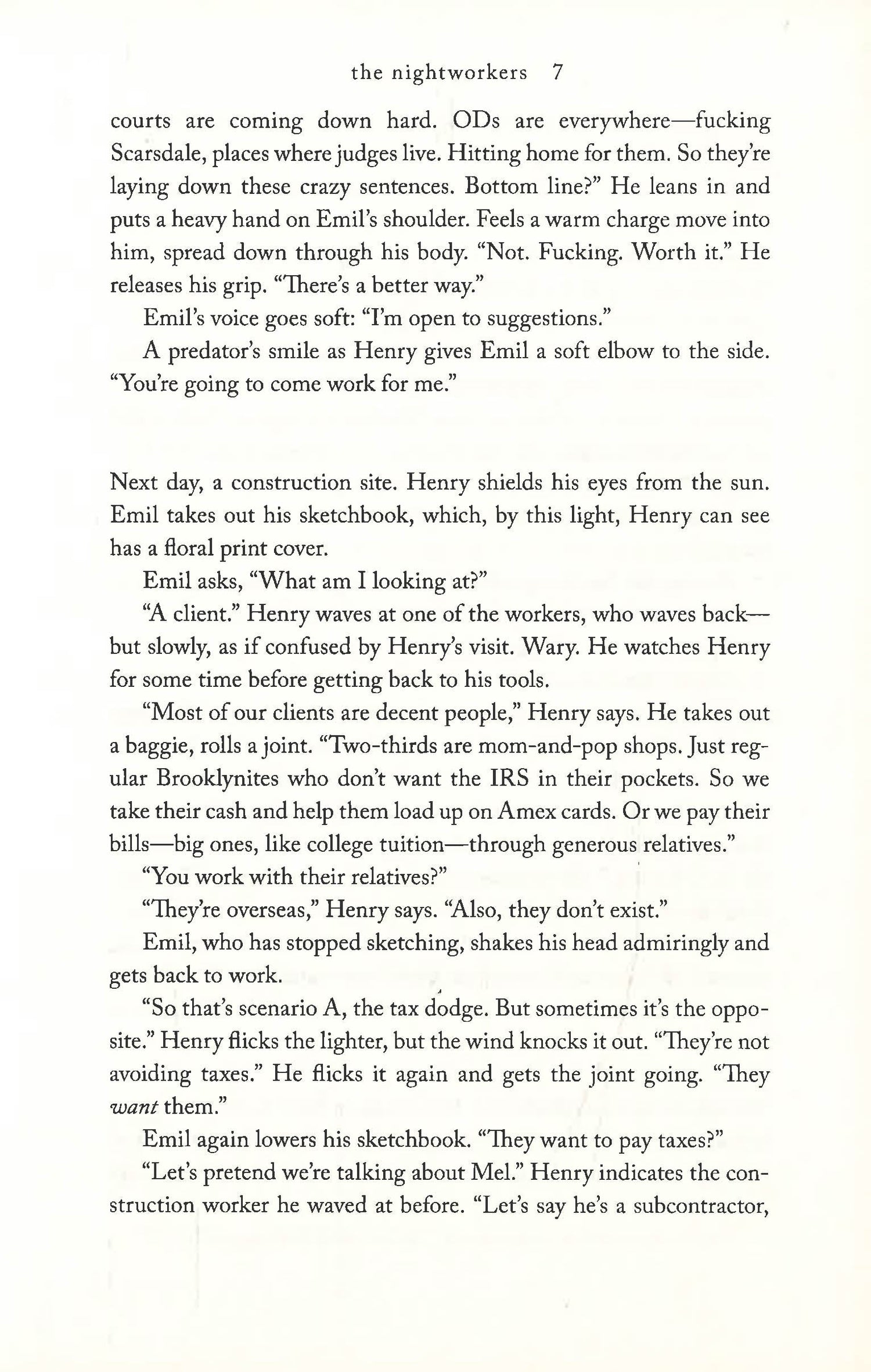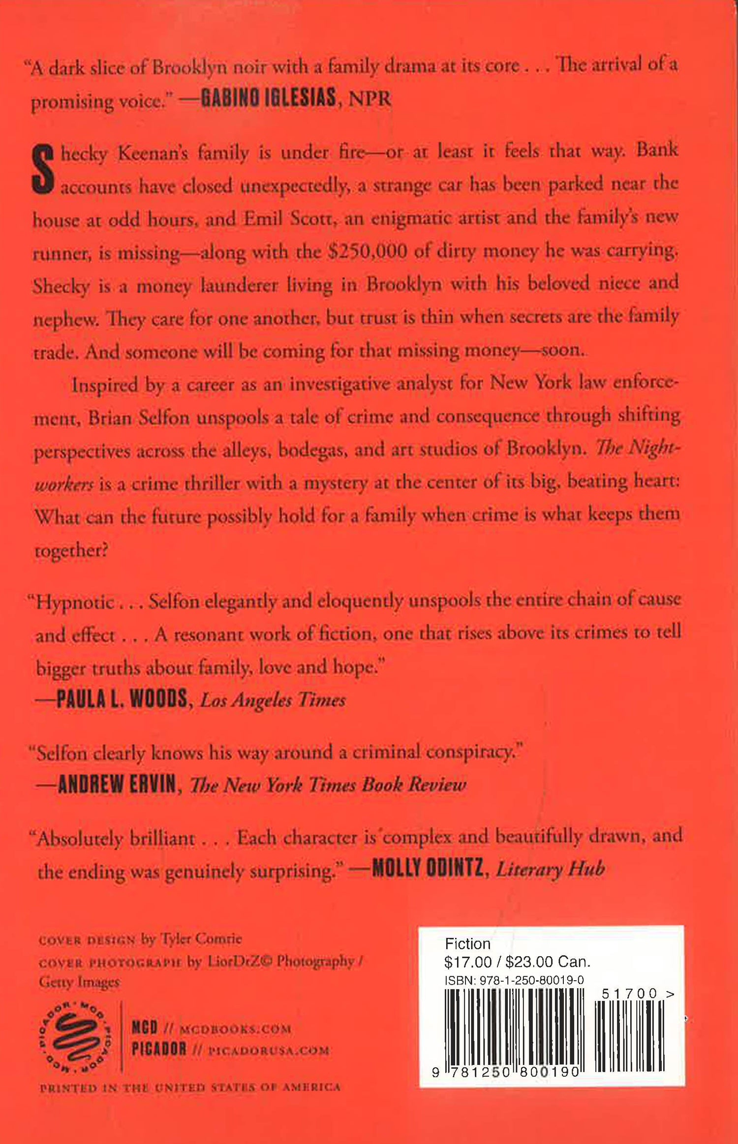 "Electric, surprising, and tightly plotted . . . A compelling writer to watch." -Adrienne Westenfeld, Esquire "A gripping, big-hearted thriller . . . whip-smart and surprisingly funny." -Harlan Coben The Nightworkers is an electrifying debut crime novel from Brian Selfon about a Brooklyn family of money launderers thrown into chaos when a runner ends up dead and a bag of dirty money goes missing. Shecky Keenan's family is under fire-or at least it feels that way. Bank accounts have closed unexpectedly, a strange car has been parked near the house at odd hours, and Emil Scott, an enigmatic artist and the family's new runner, is missing-along with the $250,000 of dirty money he was carrying. Shecky lives in old Brooklyn with his niece Kerasha and nephew Henry, and while his deepest desire is to keep his little makeshift family safe, that doesn't stop him from taking advantage of their talents. Shecky moves money for an array of unsavory clients, and Henry, volatile and violent but tenderhearted, is his bagman. Kerasha, the famed former child-thief of Bushwick, is still learning the family trade, but her quick mind and quicker fingers are already being put to use. They love one another, but trust is thin when secrets are the family trade. And someone will be coming for that missing money-soon. Inspired by a career that has included corruption cases and wiretaps as an investigative analyst for New York law enforcement, Brian Selfon unspools a tale of crime and consequence through shifting perspectives across the streets, alleys, bodegas, and art studios of Brooklyn. The Nightworkers is an evocative blend of genres: a literary crime thriller with a mystery at the center of its big beating heart: What really happened to Emil Scott, and what can the future possibly hold for a family when crime is what keeps them together?