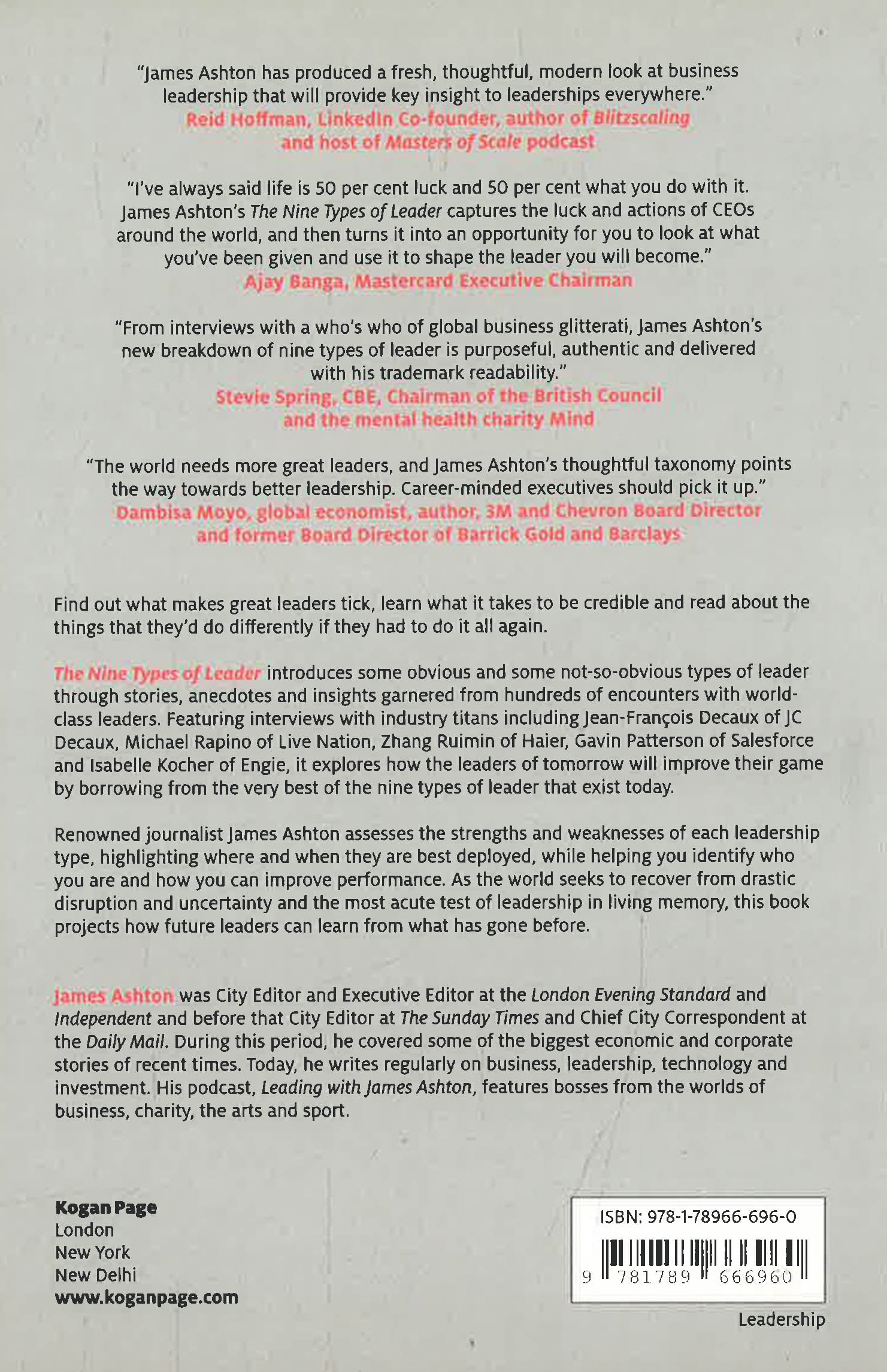 Find out what makes great leaders tick, learn what it takes to be credible and read about the things that they'd do differently if they had to do it all again. The Nine Types of Leader introduces some obvious and some not so obvious types of leader through stories, anecdotes and insight garnered from hundreds of encounters with world-class leaders. Featuring interviews with industry titans including Jean-Francois Decaux of JC Decaux, Michael Rapino of Live Nation, Zhang Ruimin of Haier, Gavin Patterson of Salesforce and Isabelle Kocher of Engie, it explores how the leaders of tomorrow will improve their game by borrowing from the very best of the nine types of leader that exist today. Renowned journalist, James Ashton assesses the strengths and weaknesses of each leadership type, highlighting where and when they are best deployed, whilst helping you identify who you are and how you can improve performance. As the world seeks to recover from drastic disruption and uncertainty and the most acute test of leadership in living memory, it projects how future leaders can learn from what has gone before.