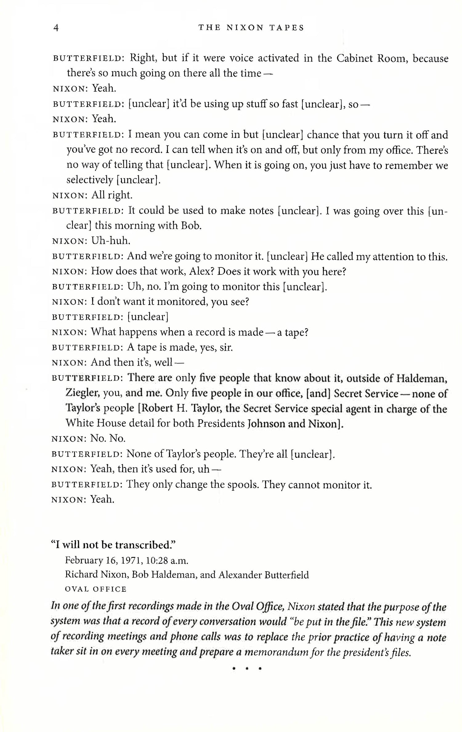 The famous - and infamous - Nixon White House tapes that reveal for the first time President Richard Nixon uncensored, unfiltered, and in his own words.President Nixon's voice-activated taping system captured every word spoken in the Oval Office, Cabinet Room, and other key locations in the White House, and at Camp David - 3,700 hours of recordings between 1971 and 1973. Yet less than 5 percent of those conversations have ever been transcribed and published. Now, thanks to professor Luke Nichter's massive effort to digitize and transcribe the tapes, the world can finally read an unprecedented account of one of the most important and controversial presidencies in U.S. history.The Nixon Tapes offers a selection of fascinating scenes from the year Nixon opened relations with China, negotiated the SALT I arms agreement with the Soviet Union, and won a landslide reelection victory. All the while, the growing shadow of Watergate and Nixon's political downfall crept ever closer. The Nixon Tapes provides a never-before-seen glimpse into a flawed president's hubris, paranoia, and political genius.