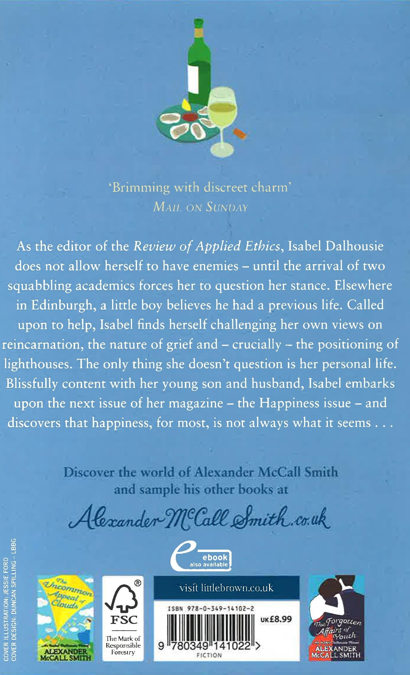 Isabel Dalhousie is one of Edinburgh's most generous (but discreet) philanthropists - but should she be more charitable? She wonders, sometimes, if she is too judgmental about her niece's amorous exploits, too sharp about her housekeeper's spiritual beliefs, too ready to bristle in battle against her enemies. As the editor of the Review of Applied Ethics, she doesn't, of course, allow herself actual enemies, but she does feel enmity - especially towards two academics who have just arrived in the city. Isabel feels they're a highly destabilizing influence; little tremors in the volcanic rock upon which an Enlightened Edinburgh perches. Equally troubling is the situation of the little boy who is convinced he had a previous life. When Isabel is called upon to help, she finds herself questioning her views on reincarnation. And the nature of grief. And - crucially - the positioning of lighthouses. The only questions Isabel doesn't have to address concern her personal life. With her young son and devoted husband her home life is blissfully content. Which is the best possible launching pad for the next issue of the Review - the Happiness issue. As Isabel is beginning to appreciate, happiness, for most people, is not quite what it seems . . .