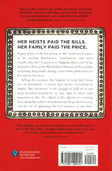 Her Heists Paid the Bills. Her Family Paid the Price. Sophie Porter is the last person in the world you'd expect to be stealing Renaissance masterpieces--and that's exactly why she's so good at it. Slipping objects out of her husband's office at the Philadelphia Museum of Art satisfies something deep inside, during a time in her life when satisfactions are few and far between. Selling the treasures also happens to keep their house out of foreclosure -- a house that means everything to Sophie. But the FBI is sniffing around, and Sophie is close to destroying the very life she's working so hard to build. She knows she should give up her thieving ways. But she may no longer be in control. The Objects of Her Affection is a riveting story about the realities of motherhood, the perils of secrecy, and the art of appraising the real treasures in our lives. Selling the treasures also happens to keep their house out of foreclosure -- a house that means everything to Sophie. But the FBI is sniffing around, and Sophie is close to destroying the very life she's working so hard to build. She knows she should give up her thieving ways. But she may no longer be in control. The Objects of Her Affection is a riveting story about the realities of motherhood, the perils of secrecy, and the art of appraising the real treasures in our lives.