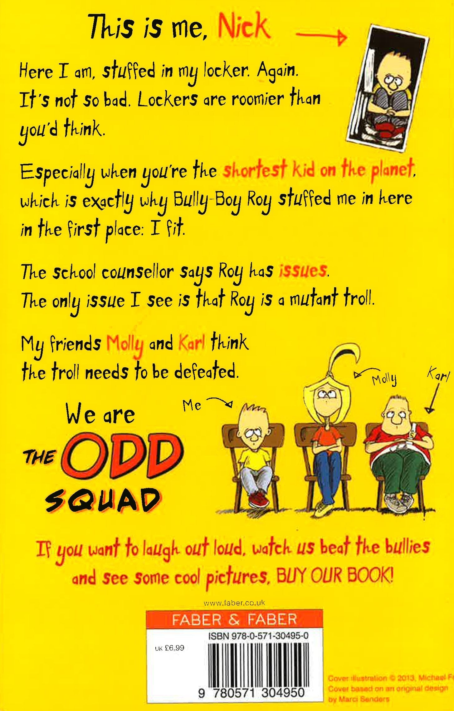 Nick is stuffed in his locker. Again. It's not so bad. Lockers are roomier than you'd think. Especially when you're the shortest kid on the planet, which is exactly why Bully-Boy Roy stuffed him in there in the first place: he fits. The school counselor says Roy has issues. The only issue Nick can see is that Roy is a mutant troll. Nick's friends Molly and Karl think the troll needs to be defeated. Together, they are THE ODD SQUAD. If you want to laugh out loud, watch them beat the bullies and see some cool pictures, READ THIS BOOK!