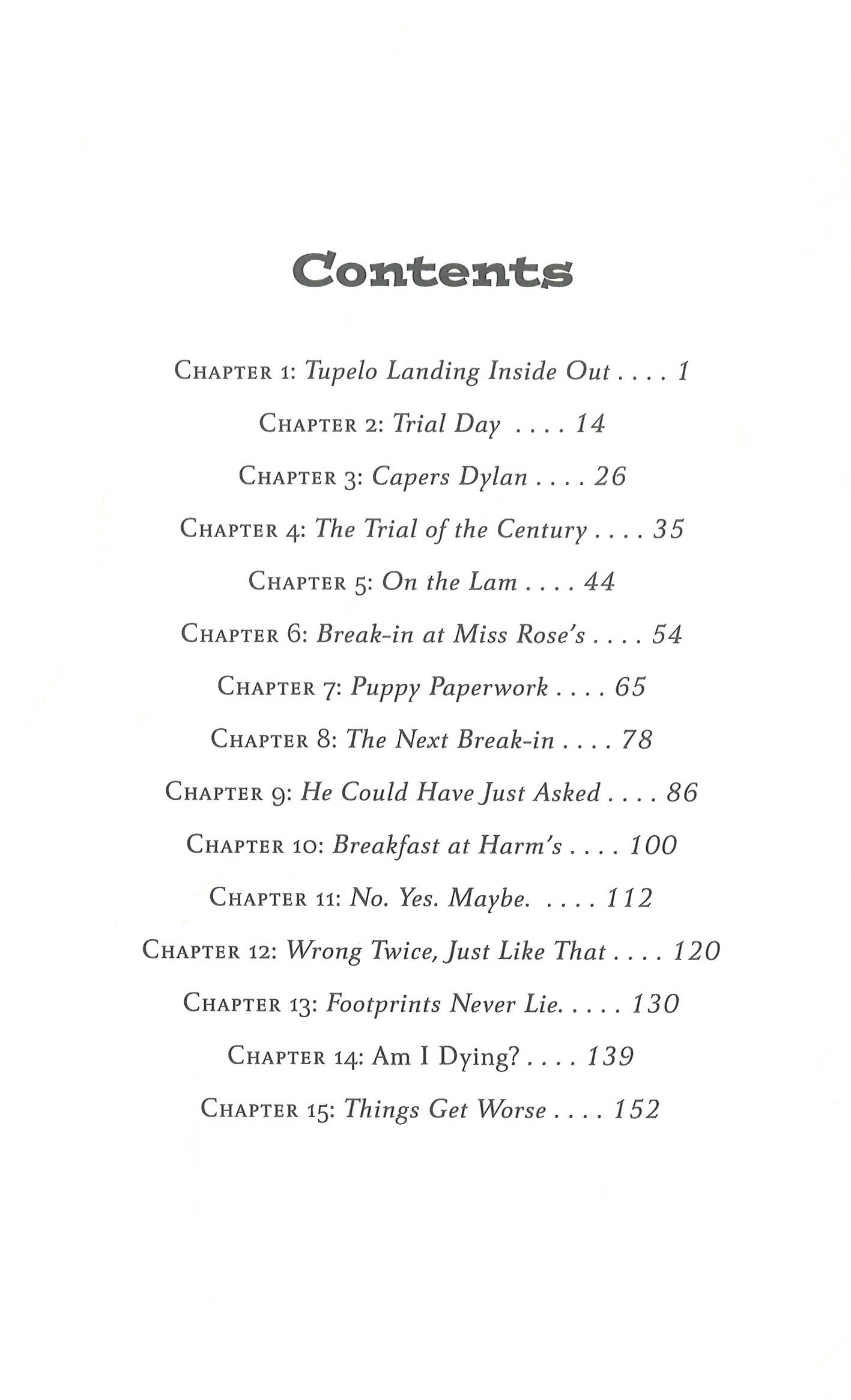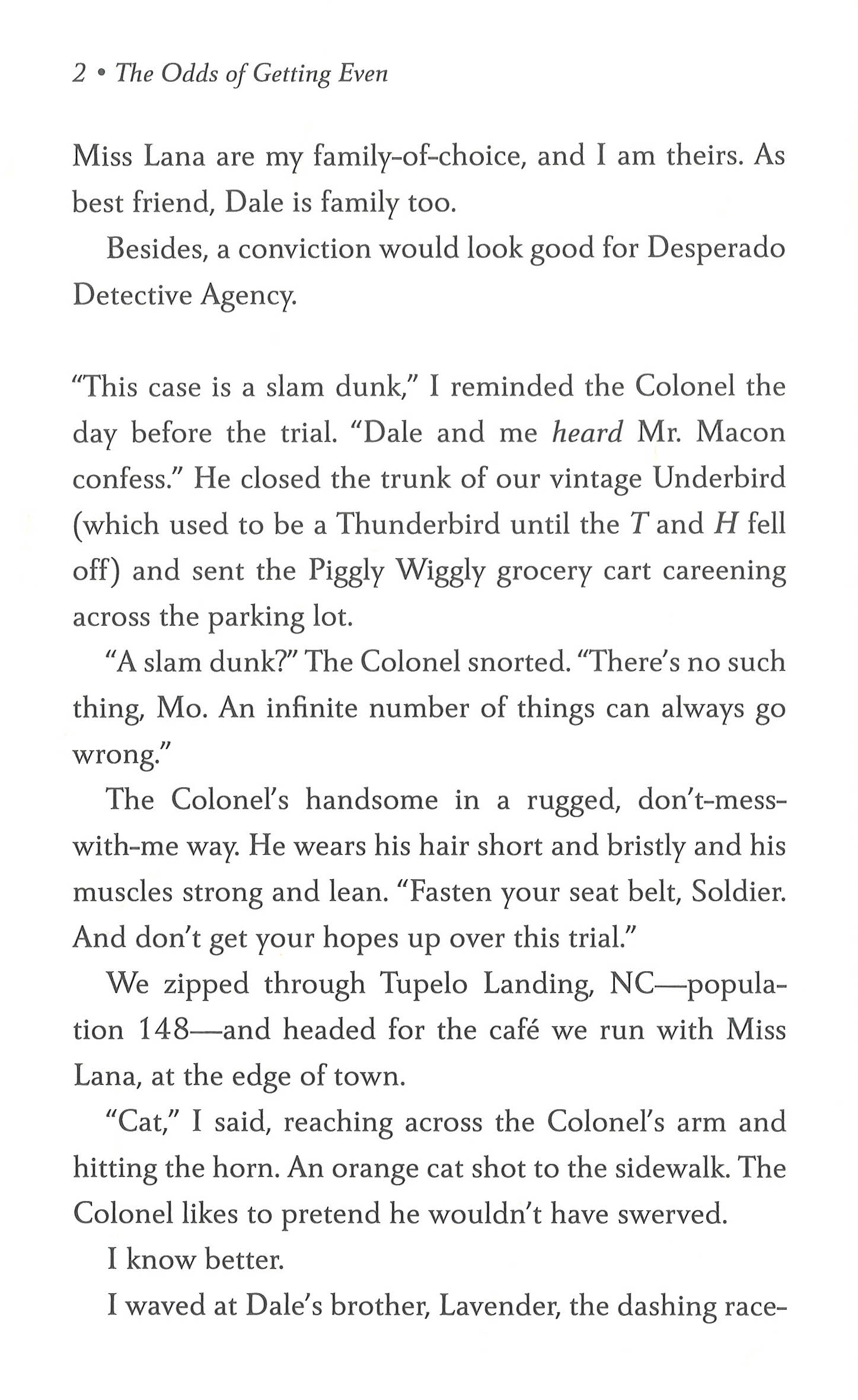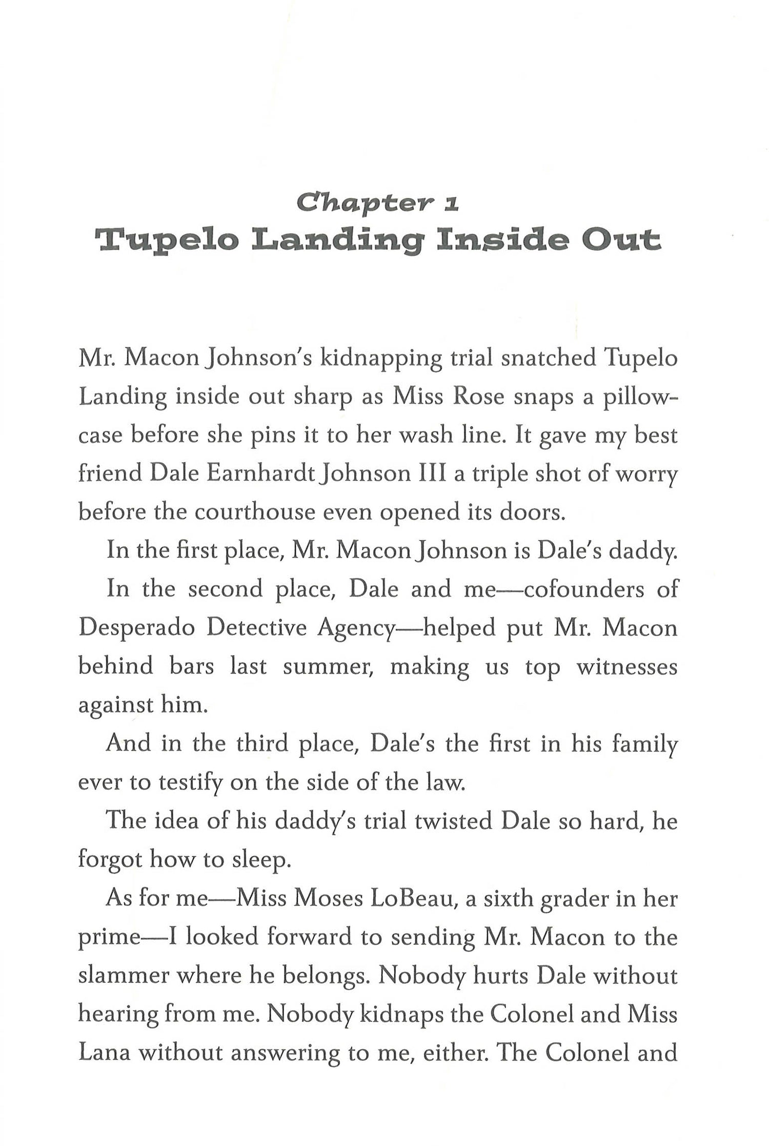 Mo and her best friend Dale - cofounders of the (probably) world-famous Desperado Detective Agency - know trouble as sure as they know the streets of Tupelo Landing, NC. But when they head to court as star witnesses against Dale's no-good daddy - confessed kidnapper Macon Johnson - they face a new brand of trouble. The Colonel and Miss Lana, Mo's family-of-choice, have predicted a slam-dunk conviction - if everything goes as expected. Mo, who wants to get even with Mr. Macon for hurting the people she loves, can't wait to testify. But the thought of a courtroom appearance rattles Dale's already jangled nerves. Of course nothing goes as expected, and life in Tupelo Landing starts spinning sideways - fast. In no time flat the town's in lockdown and Macon Johnson's on the run. And Desperado Detectives, with intern Harm Crenshaw in tow, take on their toughest case yet. One they'd never want in a million years. Good thing Mo's always been lucky.