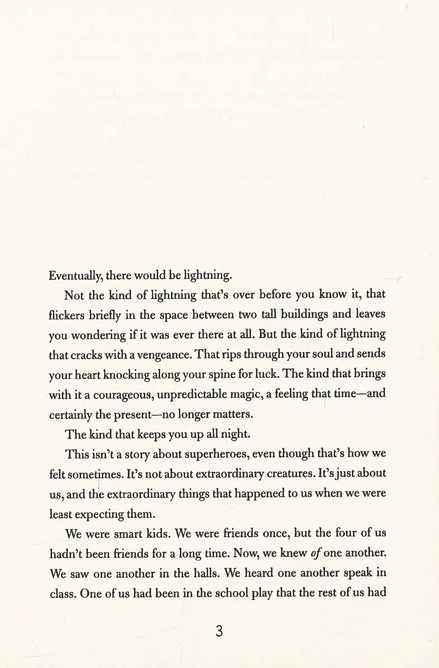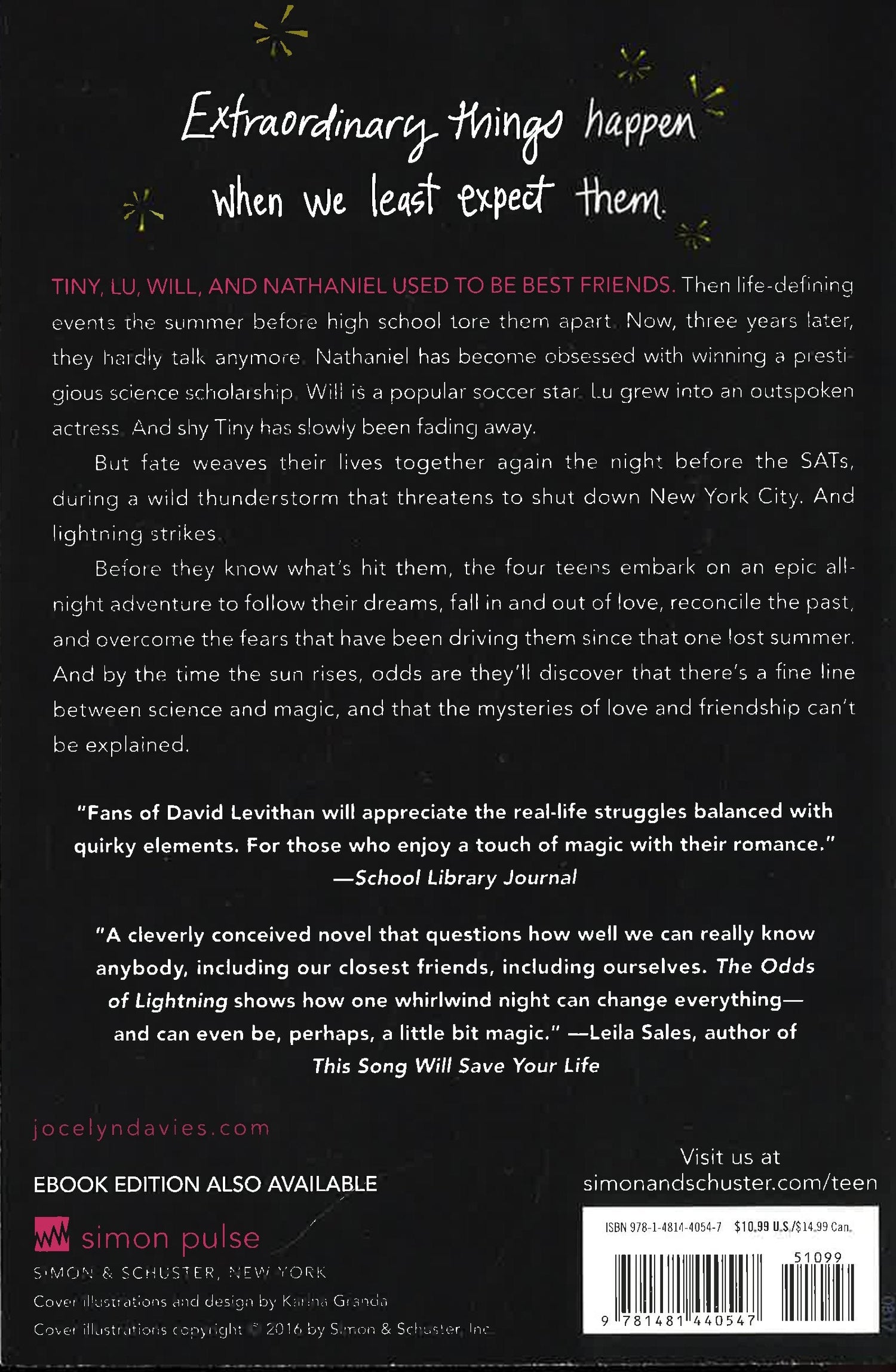 Tiny, Lu, Will and Nathaniel used to be best friends. Then life-defining events the summer before high school tore them apart. Now, three years later, they hardly talk anymore. Nathaniel has become obsessed with winning the prestigious science scholarship that his genius older brother once won. Will has risen from anonymity to popular soccer star. Lu grew into a brash, impetuous actress. And shy, poetic Tiny has slowly been fading away.But fate weaves their lives together again the night before the SATs, during a wild thunderstorm that threatens to shut down New York City. And lightning strikes.Before they know what's hit them, the four teens embark on an epic all-night adventure to follow their dreams, fall in and out of love, reconcile the past, and overcome the fears that have been driving them since that one lost summer. And by the time the sun rises, odds are they’ll discover that there’s a fine line between science and magic, and that the mysteries of love and friendship can’t be explained.