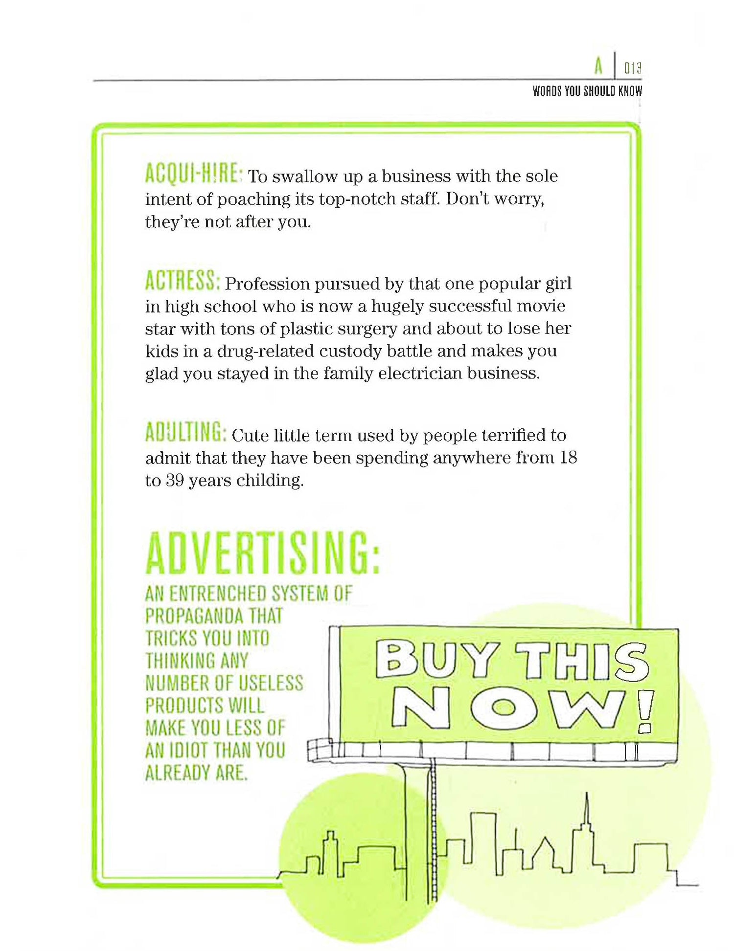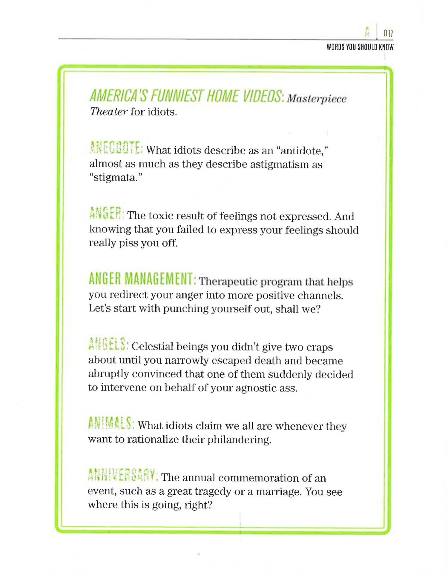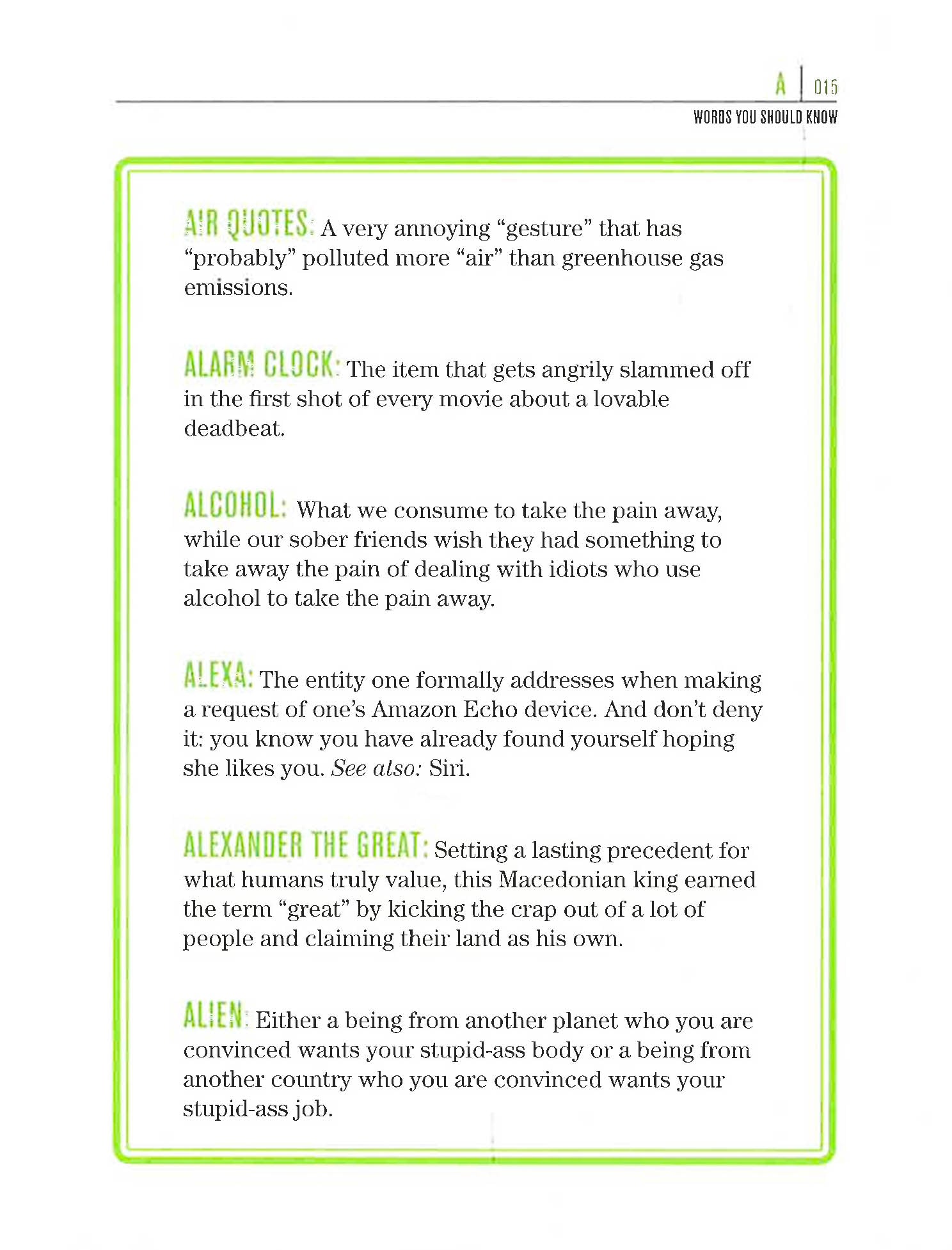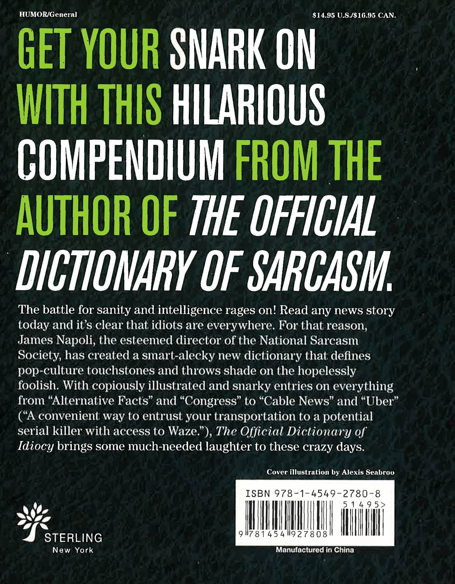 Get your snark on, with this hilarious compendium from the author of The Official Dictionary of Sarcasm. It?s the perfect book for today?s world.The battle for sanity and intelligence rages on! Read any news story today and it?s clear that idiots are everywhere. For that reason, James Napoli, the esteemed director of the National Sarcasm Society, has created a smart-aleck new dictionary that defines pop-culture touchstones and throws shade on the hopelessly foolish. With copiously illustrated and snarky entries on everything from "Alternative Facts" and "Congress" to "Cable News" and "Uber" (A convenient way to entrust your transportation to a potential serial killer . . . ), The Official Dictionary of Idiocy brings some much-needed laughter to these crazy days.