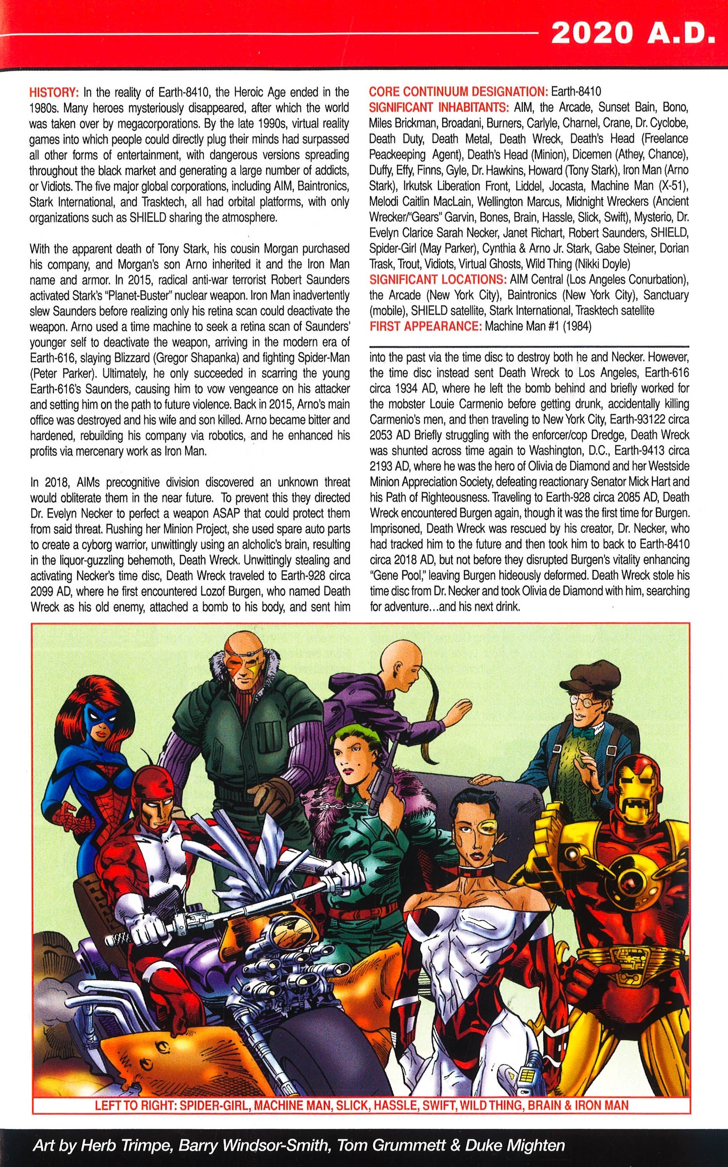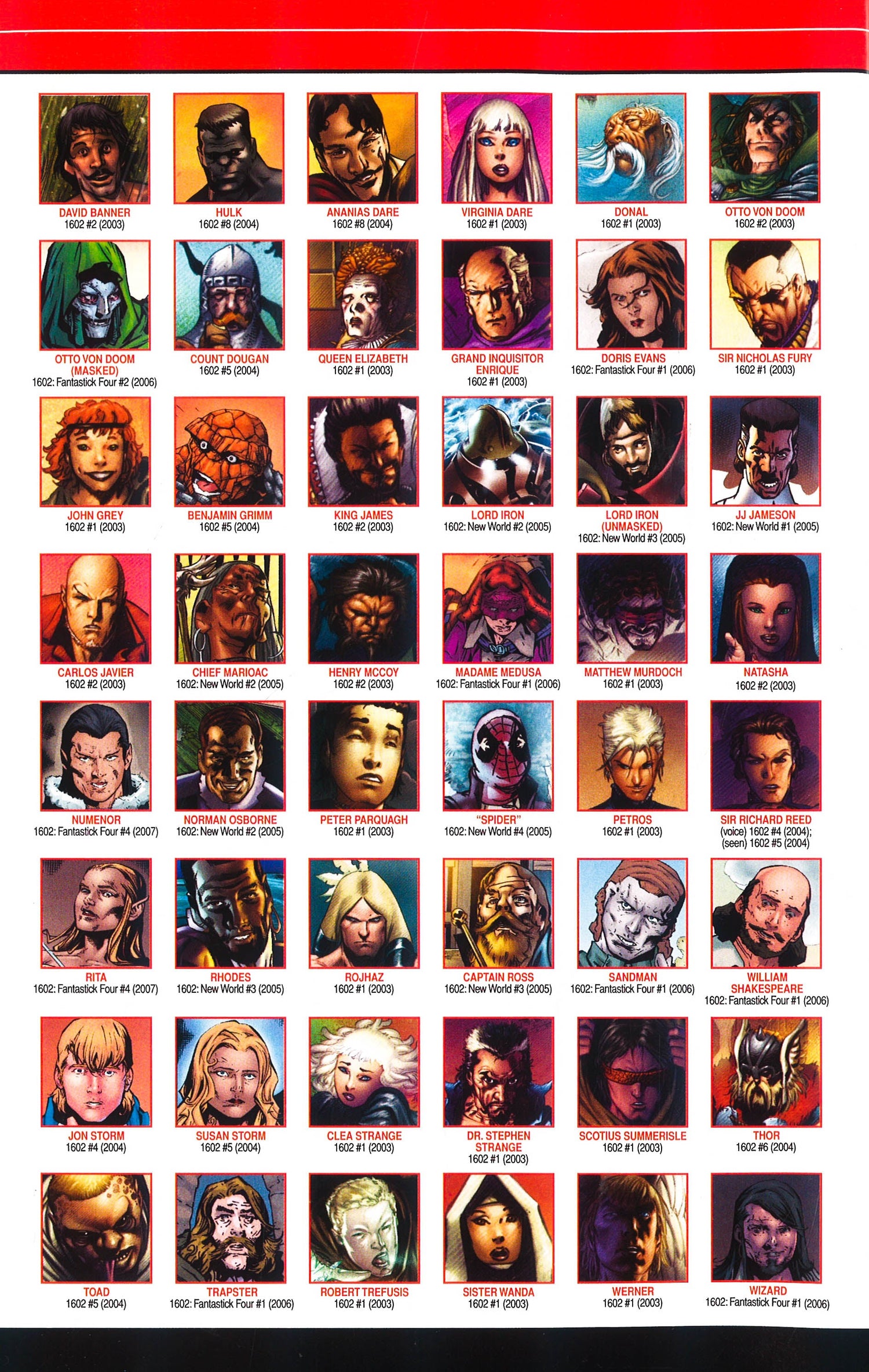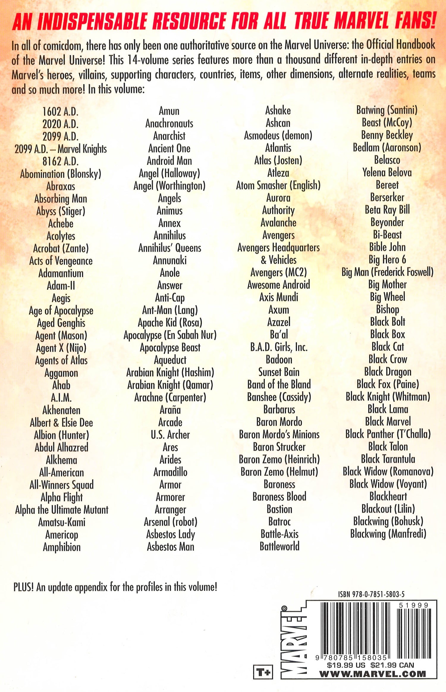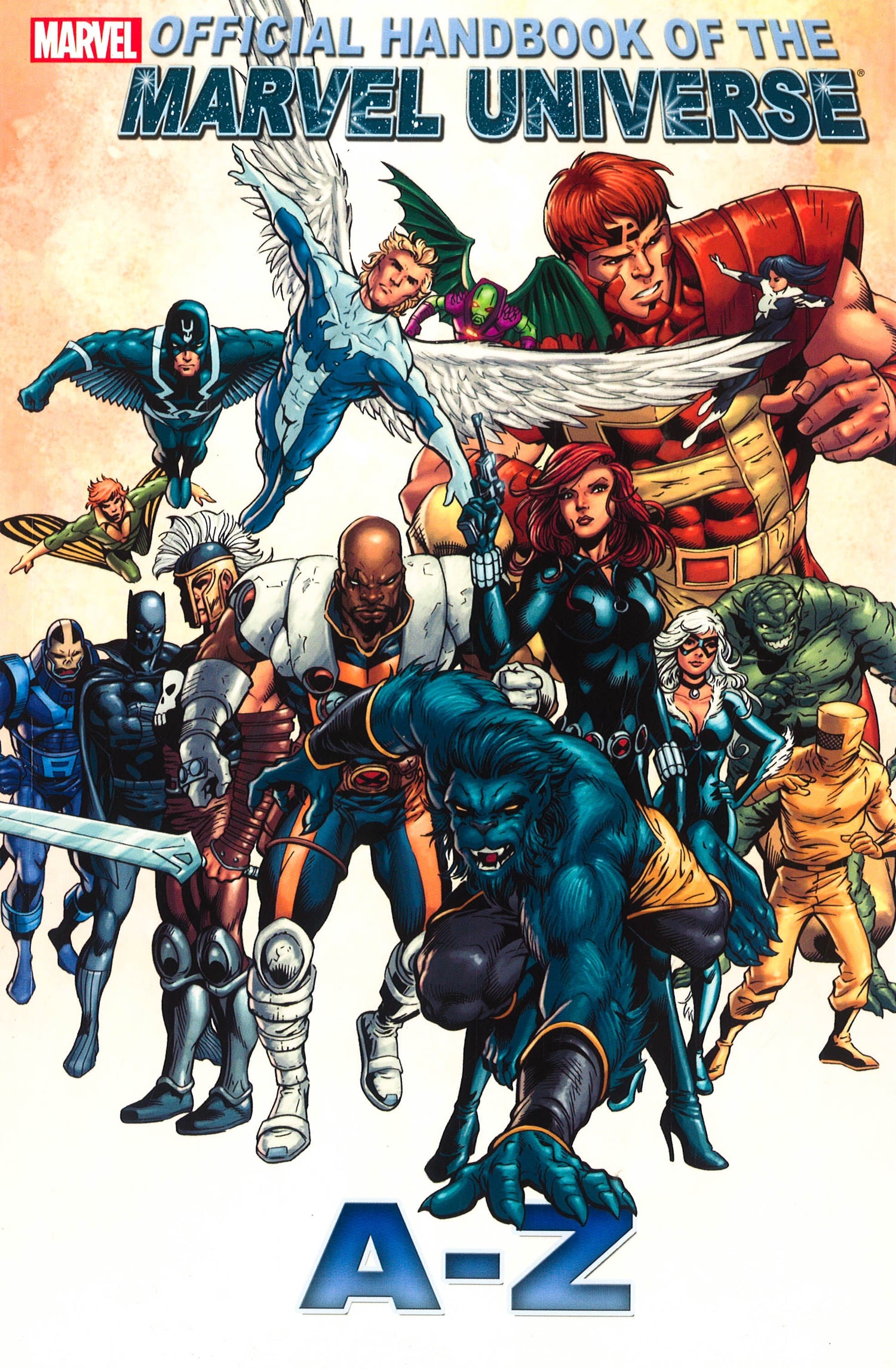 The most exciting and comprehensive Marvel handbook is fi nally here! Beginning a twelve-volume guide to the Marvel Universe with more than 100 huge entries in each tome! This issue - from 1602 to Blackwulf! Spotlighting people (Angel, Annihilus, Ant-Man, Apocalypse, Arachne, Ares, Aurora, Banshee, Baron Zemo, Beast, Beta Ray Bill, Bishop, Black Bolt, Black Knight, Black Panther, Black Widow), places (Atlantis), teams (AIM, Acolytes, Agents of Atlas, Alpha Flight, Avengers), species (Badoon), alternate realities (2020, 2099, the Age of Apocalypse) and more!