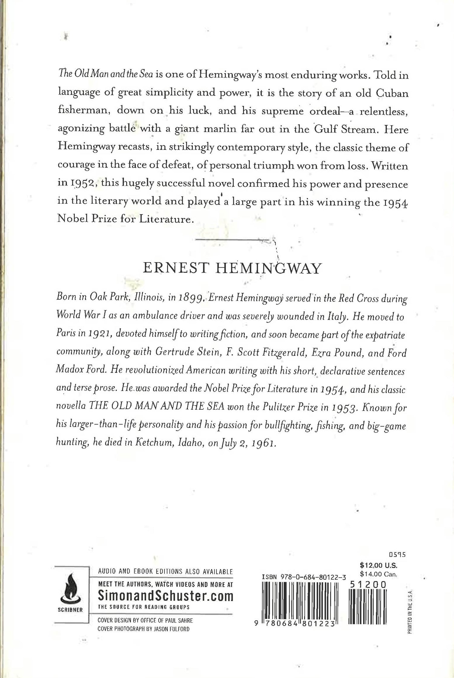 The last novel Ernest Hemingway saw published, "The Old Man and the Sea" has proved itself to be one of the enduring works of American fiction. It is the story of an old Cuban fisherman and his supreme ordeal, a relentless, agonizing battle with a giant marlin far out in the Gulf Stream. Using the simple. powerful language of a fable, Hemingway takes the timeless themes of courage in the face of defeat and personal triumph won from loss and transforms them into a magnificnet twentieth-century classic. *This book may have remainder mark*