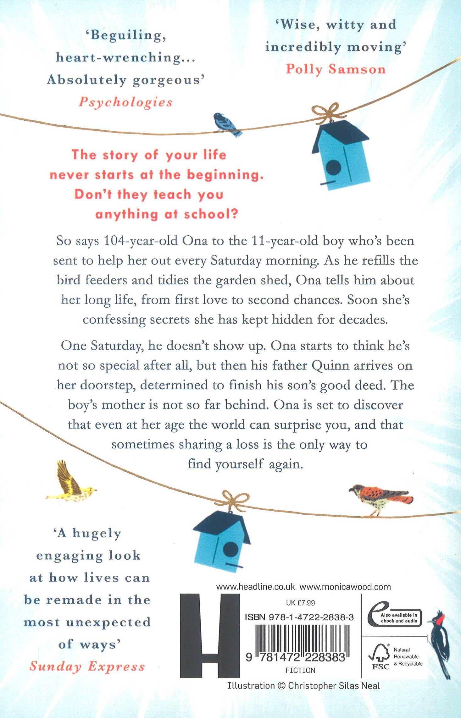 The unforgettable novel about a boy in a million - and the 104-year-old woman who saves his family. 'A bittersweet story about finding friendship in the most unlikely of places' Good Housekeeping She may be 104 years old, but Ona Vitkus is on a mission and it's all because of THE ONE-IN-A-MILLION-BOY...Monica Wood's unforgettable novel about a boy in a million and the 104-year-old woman who saves his family is not to be missed by readers who loved THE UNLIKELY PILGRIMAGE OF HAROLD FRY, ELIZABETH IS MISSING or THE SHOCK OF THE FALL. 'A lovely, quirky novel about misfits across generations' Daily Mail'A bittersweet story about finding friendship in the most unlikely of places' Good Housekeeping. The story of your life never starts at the beginning. Don't they teach you anything at school?So says 104-year-old Ona to the 11-year-old boy who's been sent to help her out every Saturday morning. As he refills the bird feeders and tidies the garden shed, Ona tells him about her long life, from first love to second chances. Soon she's confessing secrets she has kept hidden for decades.One Saturday, he doesn't show up. Ona starts to think he's not so special after all, but then his father Quinn arrives on her doorstep, determined to finish his son's good deed. The boy's mother is not so far behind. Ona is set to discover that even at her age the world can surprise you, and that sometimes sharing a loss is the only way to find yourself again.What readers are saying about ONE IN A MILLION BOY: 'Delightful, quirky and heart-warming''A richly layered novel of hearts broken seemingly beyond repair and then bound by a stunning act of human devotion''With heart-breaking and emotional moments intertwined with humour and love, THE ONE IN A MILLION BOY proves it's never too late to make new friends'