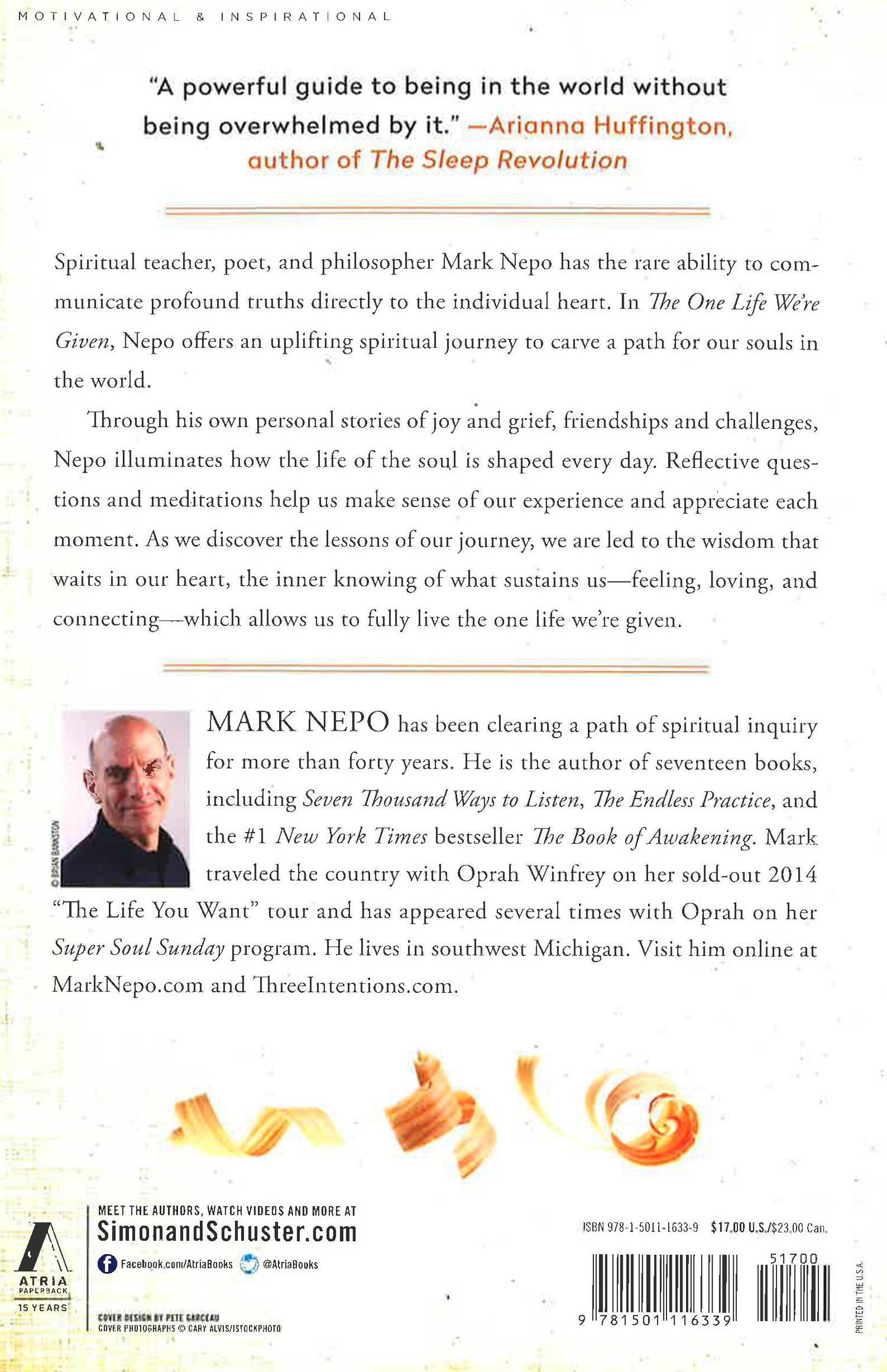 Spiritual teacher, poet, and philosopher Mark Nepo has the rare ability to communicate profound truths directly to the individual heart. In The One Life We're Given, Nepo offers an uplifting spiritual journey to carve a path for our souls in the world.Through his own personal stories of joy and grief, friendships and challenges, Nepo illuminates how the life of the soul is shaped every day. Reflective questions and meditations help us make sense of our experience and appreciate each moment. As we discover the lessons of our journey, we are led to the wisdom that waits in our hearts, the inner knowing of what sustains us - feeling, loving and connecting - which allows us to fully live the one life we're given.