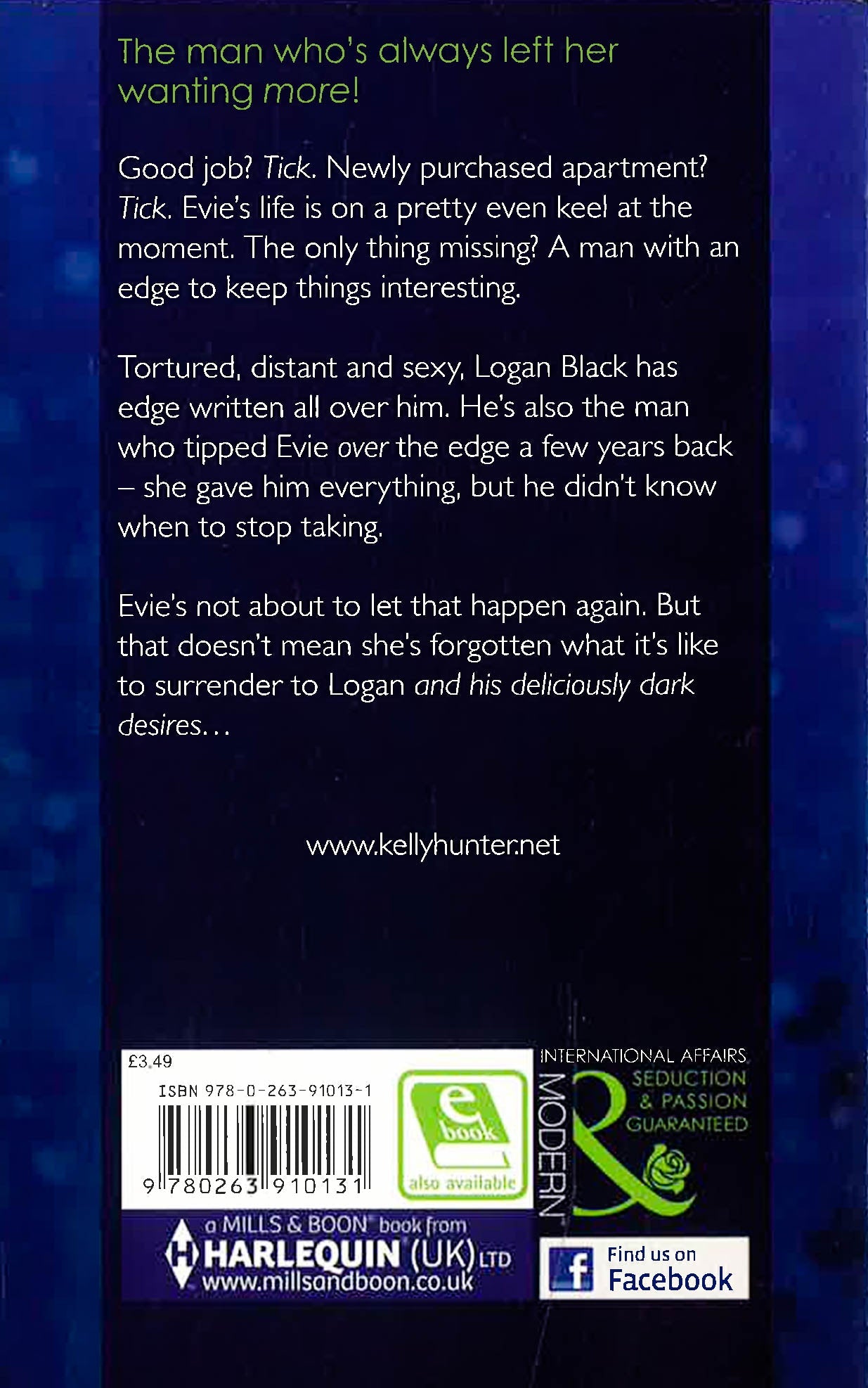 The man who's always left her wanting more! Good job? Tick. Newly purchased apartment? Tick. Evie's life is on a pretty�even keel at the moment. The only thing missing? A man with an edge to keep things interesting. Tortured, distant and sexy, Logan Black has edge written all over him. He's also the man who tipped Evie over the edge a few years back - she gave him everything, but he didn't know when to stop taking. Evie's not about to let that happen again. But that doesn't mean she's forgotten what it's like to surrender to Logan and his deliciously dark desires...
