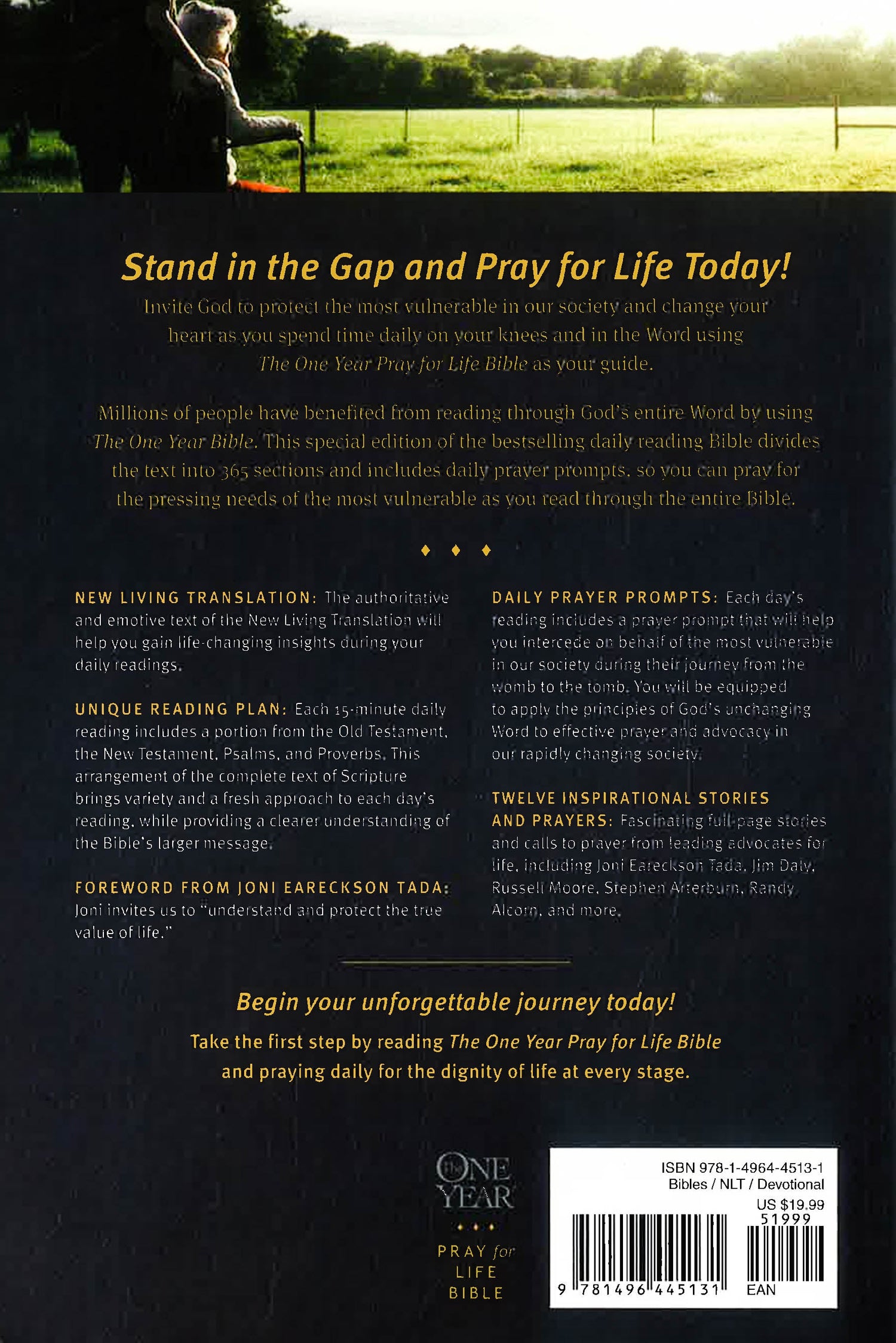 Pray for the urgent need to protect life as you read through the whole Bible in just one year. The One Year Pray for Life Bible provides the structure to help you read God's life-changing Word in the clear and easy-to-read New Living Translation in just 15 minutes a day. It includes daily life issue prayer prompts and inspirational prayers from ministry leaders to help you intercede for precious life issues from womb to tomb. This special edition of The One Year Bible equips you to apply your daily Bible reading in short prayers for both those affected by and those who make decisions about these critical issues. The One Year Pray for Life Bible will help you apply the principles of God's unchanging Word to effective prayer for our rapidly changing society. Allow God to change you and everyone impacted by ethical life choices as you spend a year in the Word and on your knees.