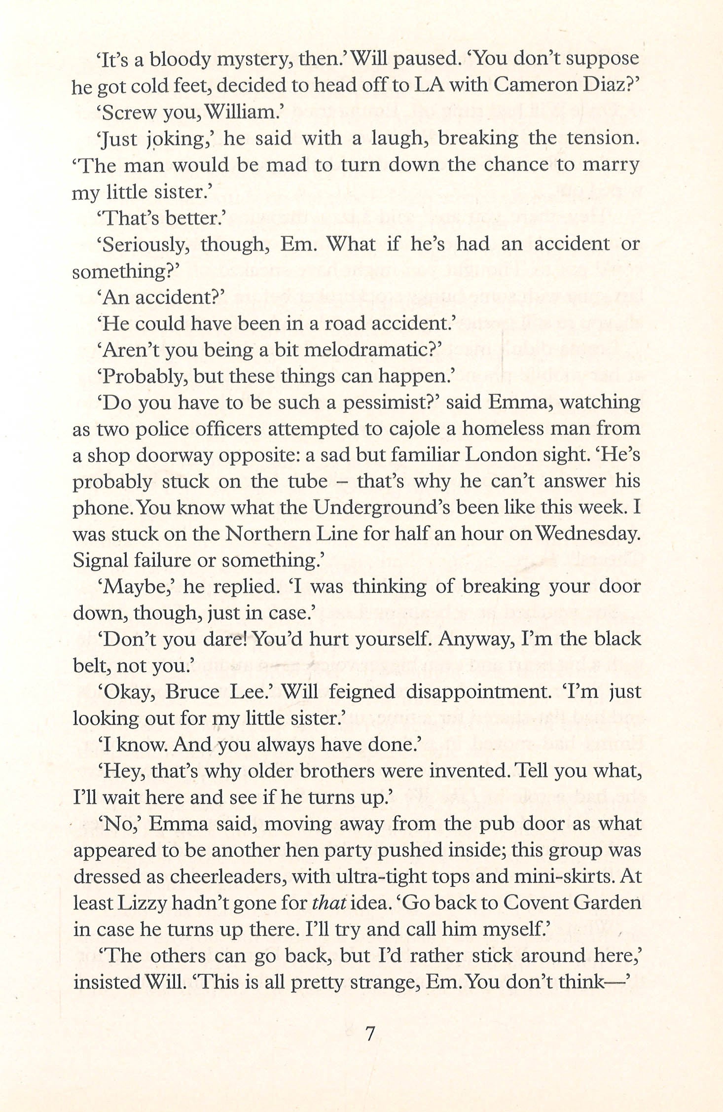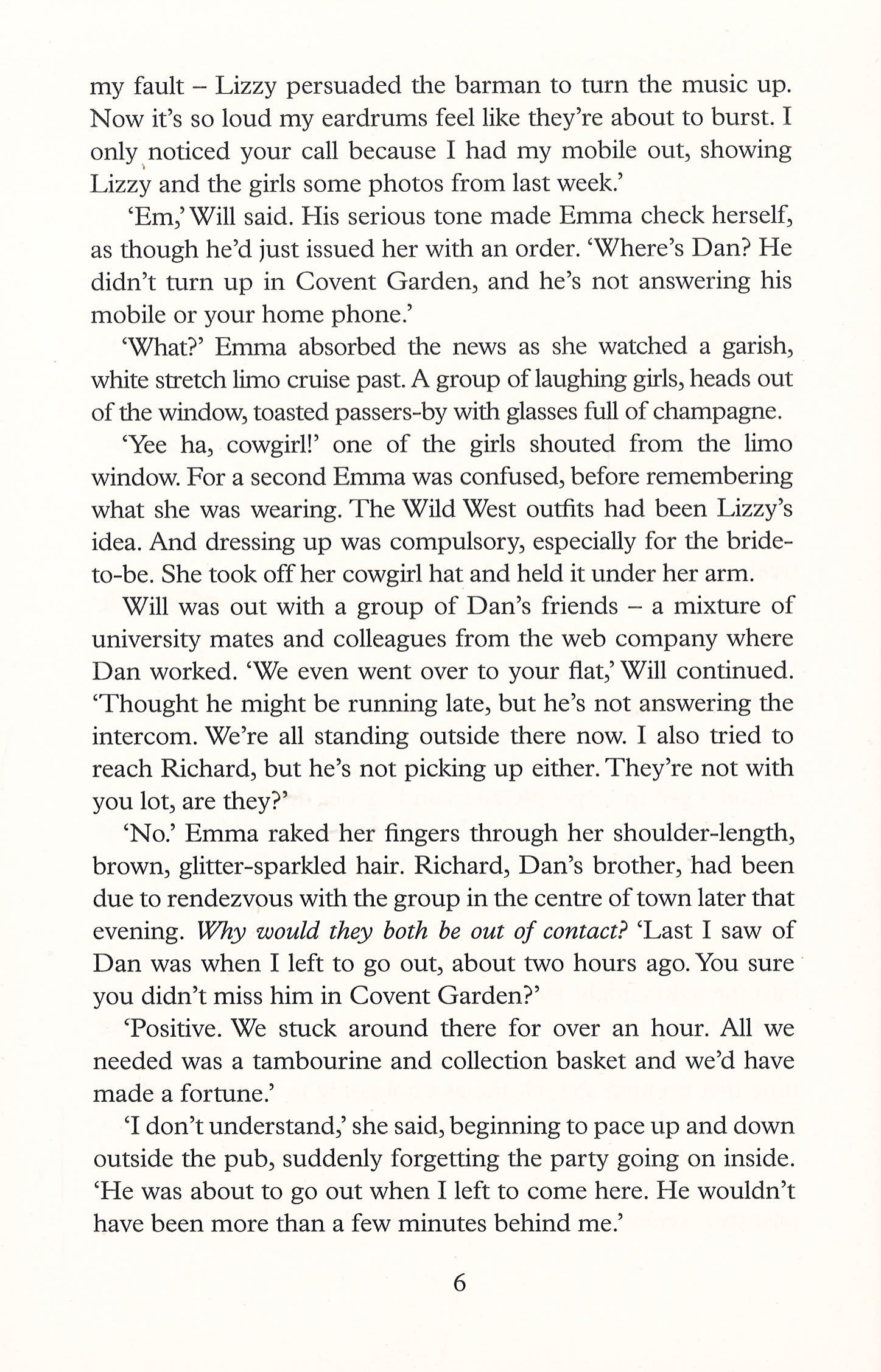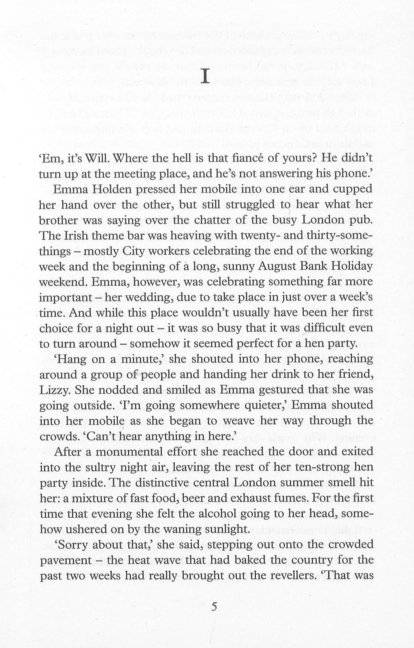 Days before their wedding, during their last separate nights of hard-partying singledom, Emma Holden's fiance has gone missing. Not only has Dan disappeared without a trace, his brother is found beaten and left for dead, and may not wake up from a coma. Without any evidence, suspicion for the attempted murder falls on Dan - but Emma refuses to believe his guilt. When crime scene photos get splashed across the pages of London tabloids, Emma knows that someone is following her. Watching her. It is an old, familiar feeling, though no less terrifying. A long-hidden family secret seems to unite Emma's troubled past with her dangerous present. As time runs out her trust in her family, her friends -- and Dan -- faces an ultimate test.
