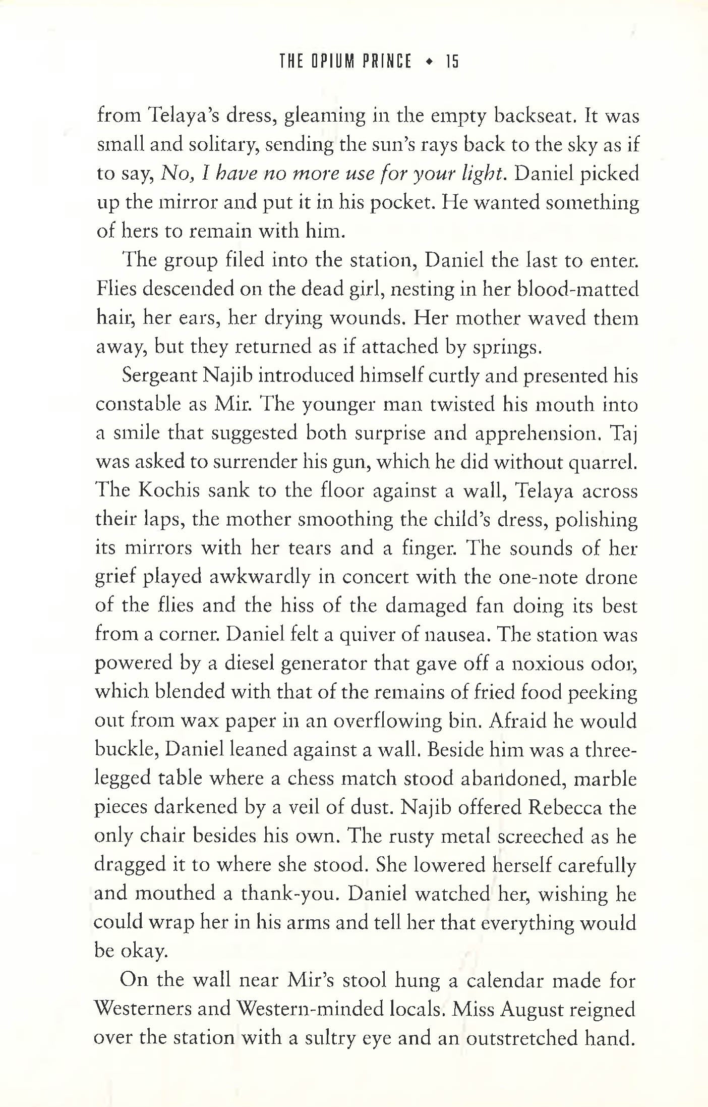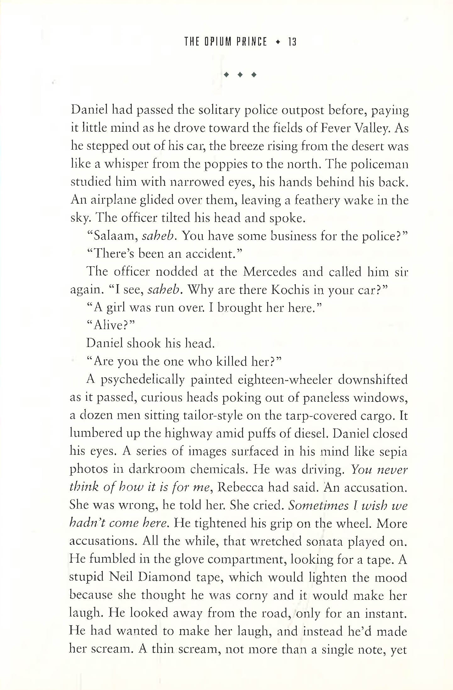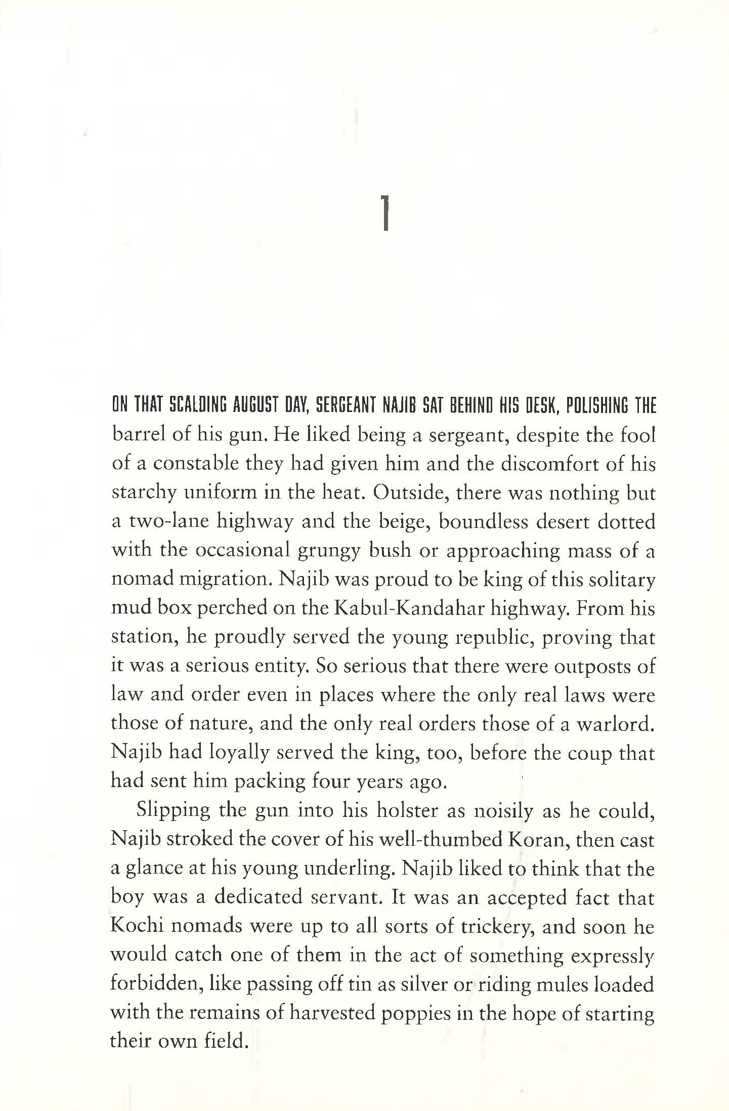 But on the drive out of Kabul for an anniversary trip with his wife, Daniel accidentally hits and kills a young Kochi girl named Telaya. He is let off with a nominal fine, in part because nomad tribes are ignored in the eyes of the law, but also because a mysterious witness named Taj Maleki intercedes on his behalf. Wracked with guilt and visions of Telaya, Daniel begins to unravel, running from his crumbling marriage and escalating threats from Taj, who turns out to be a powerful opium khan willing to go to extremes to save his poppies.
