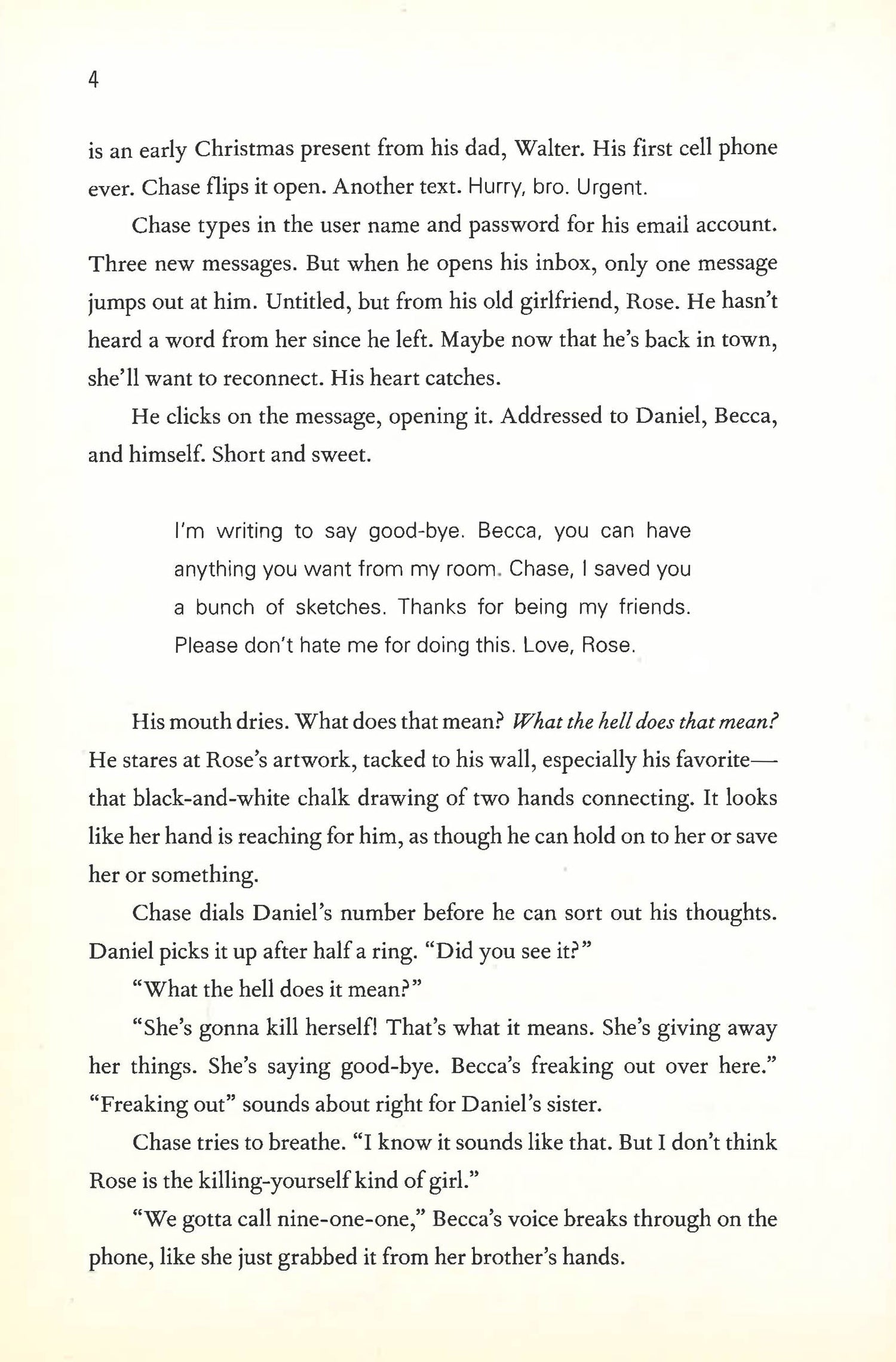 Rose is the wild girl nobody really knows. Chase is haunted by his past. Both are self-proclaimed "disappointments," attracted to each other enough to let down their defenses. When Rose's strict, adoptive parents forbid the relationship, it only makes things more intense. But Chase can't hide from his own personal demons, and Rose has secrets of her own. After they're wrenched apart, a cryptic email arrives in the middle of the night on Christmas Eve, beginning a desperate pursuit and a look back over their tumultuous romance. Will they find each other before the night is over, or will they be torn apart forever?