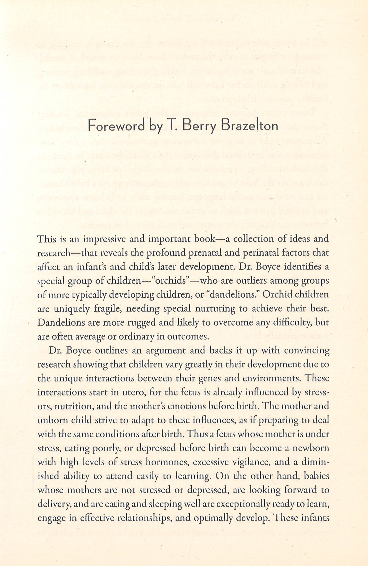 Dr W. Thomas Boyce is Professor of Developmental and Behavioral Health and chief of the Division of Developmental Medicine at the University of California, San Francisco. He is also co-director of the Child and Brain Development Program of the Canadian Institute for Advanced Research and a member of the Institute of Medicine of the National Academies. Dr Boyce's research addresses the interplay among neurobiological and psychosocial factors leading to differences in childhood health and disease. He is the parent of two wonderful adult children, one orchid and one dandelion. He is also an avid sailor who likes to tie sailing knots and untie scientific ones. He lives with his wife in San Francisco.